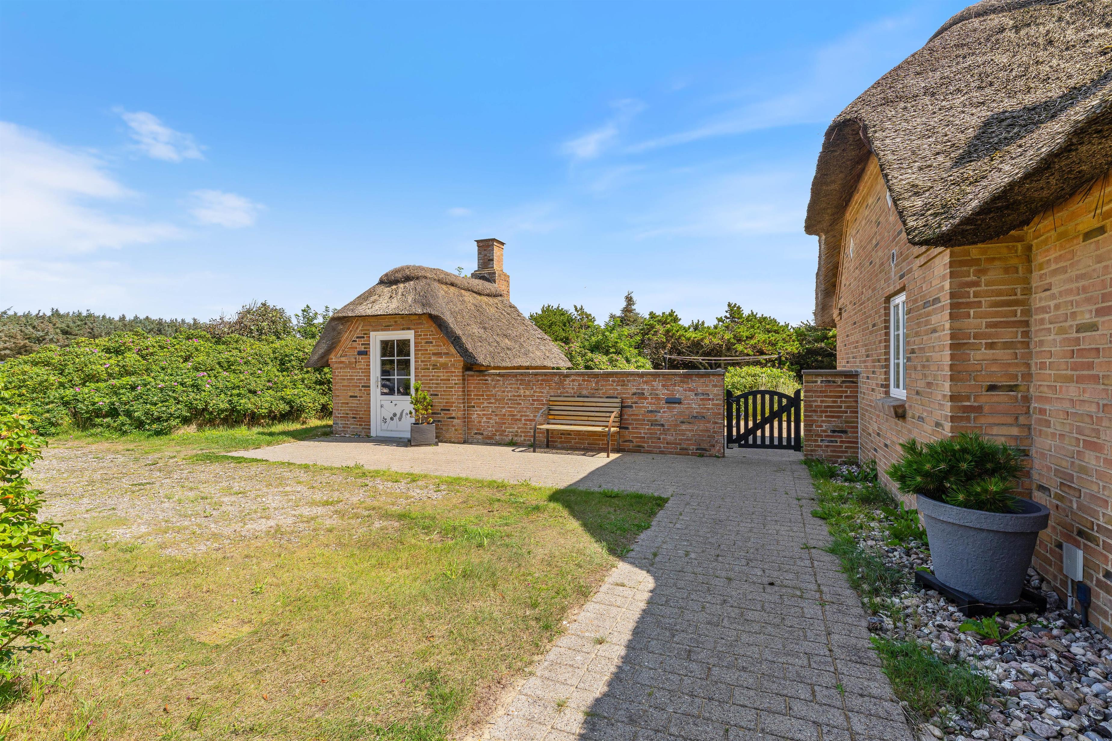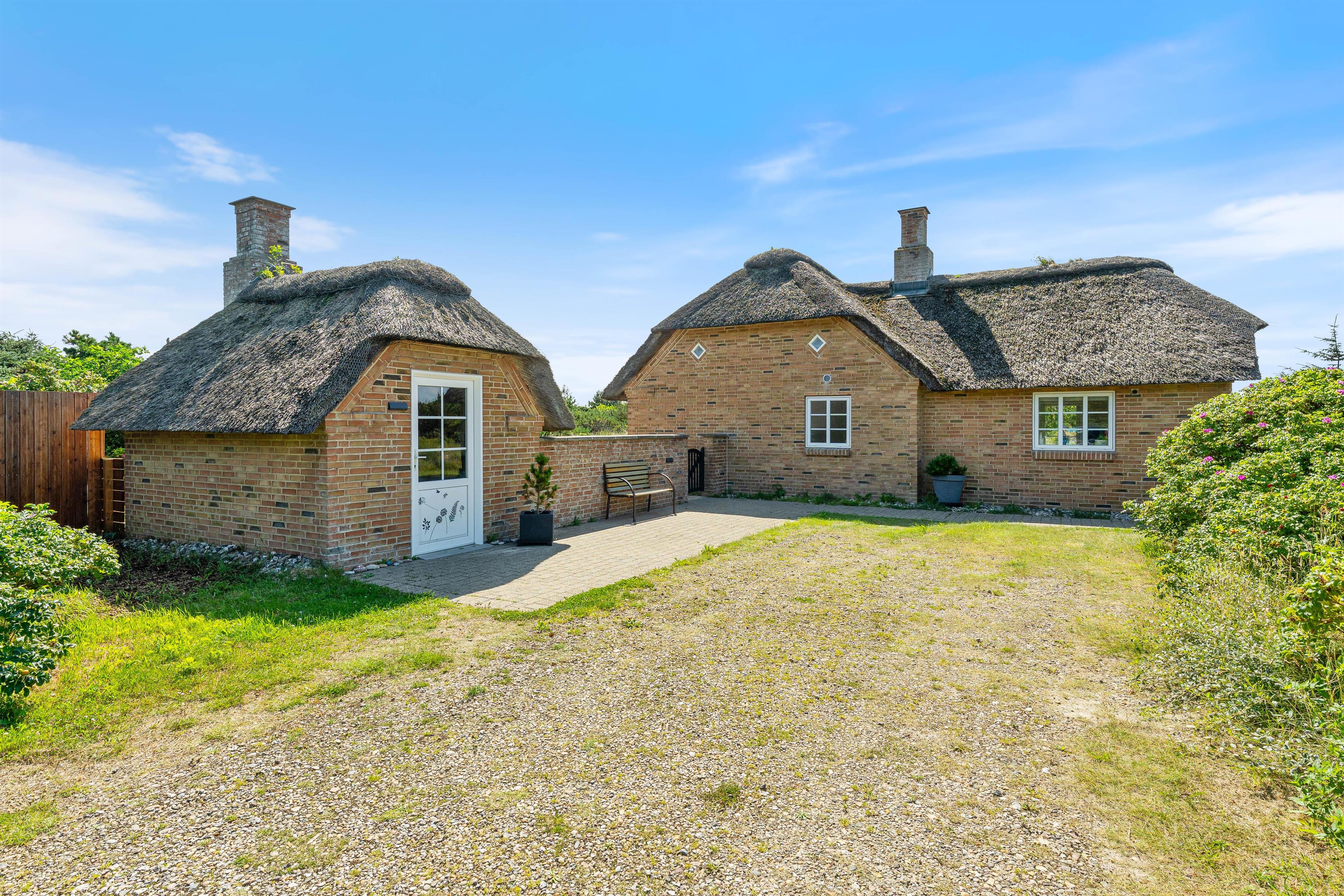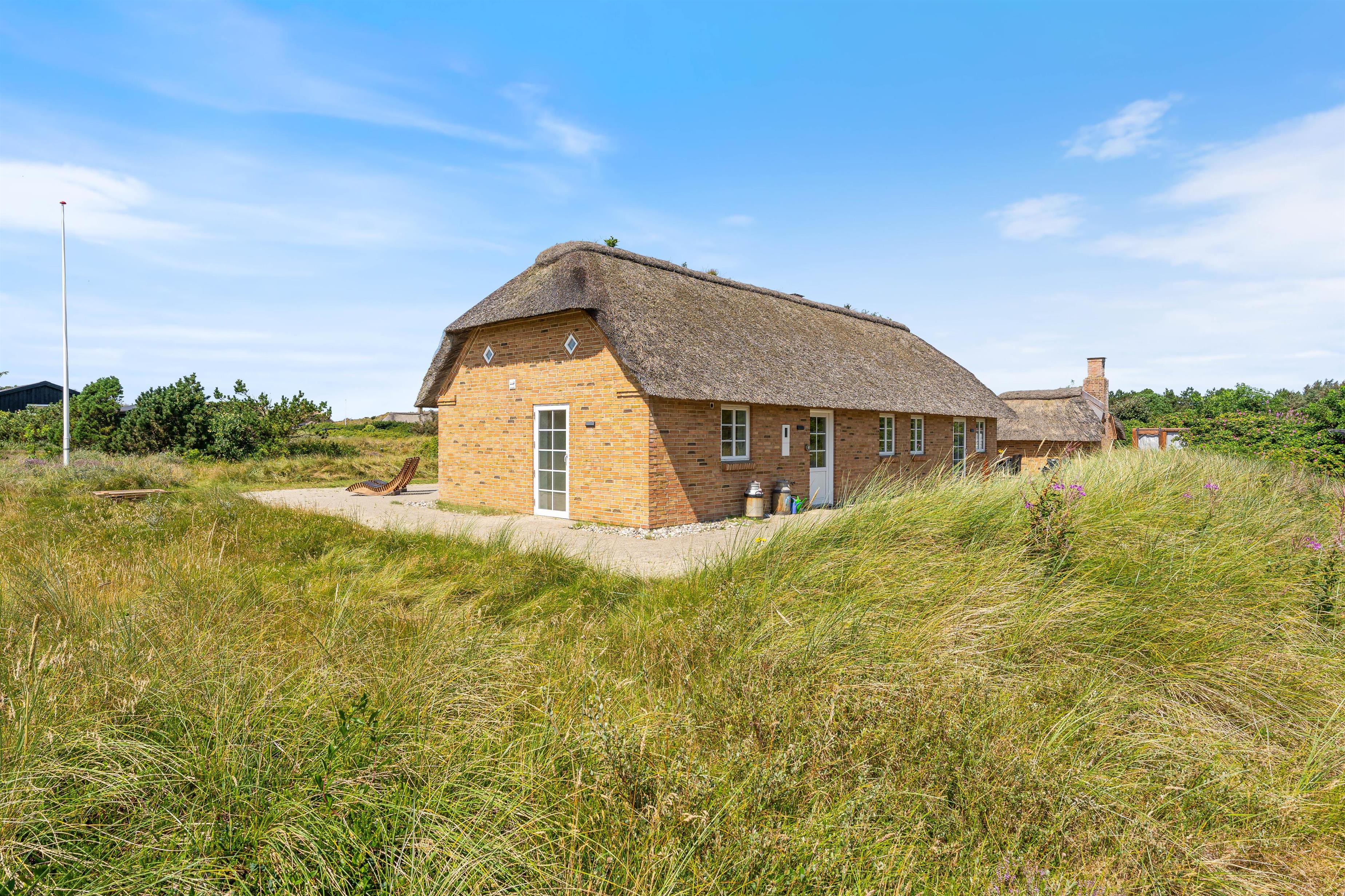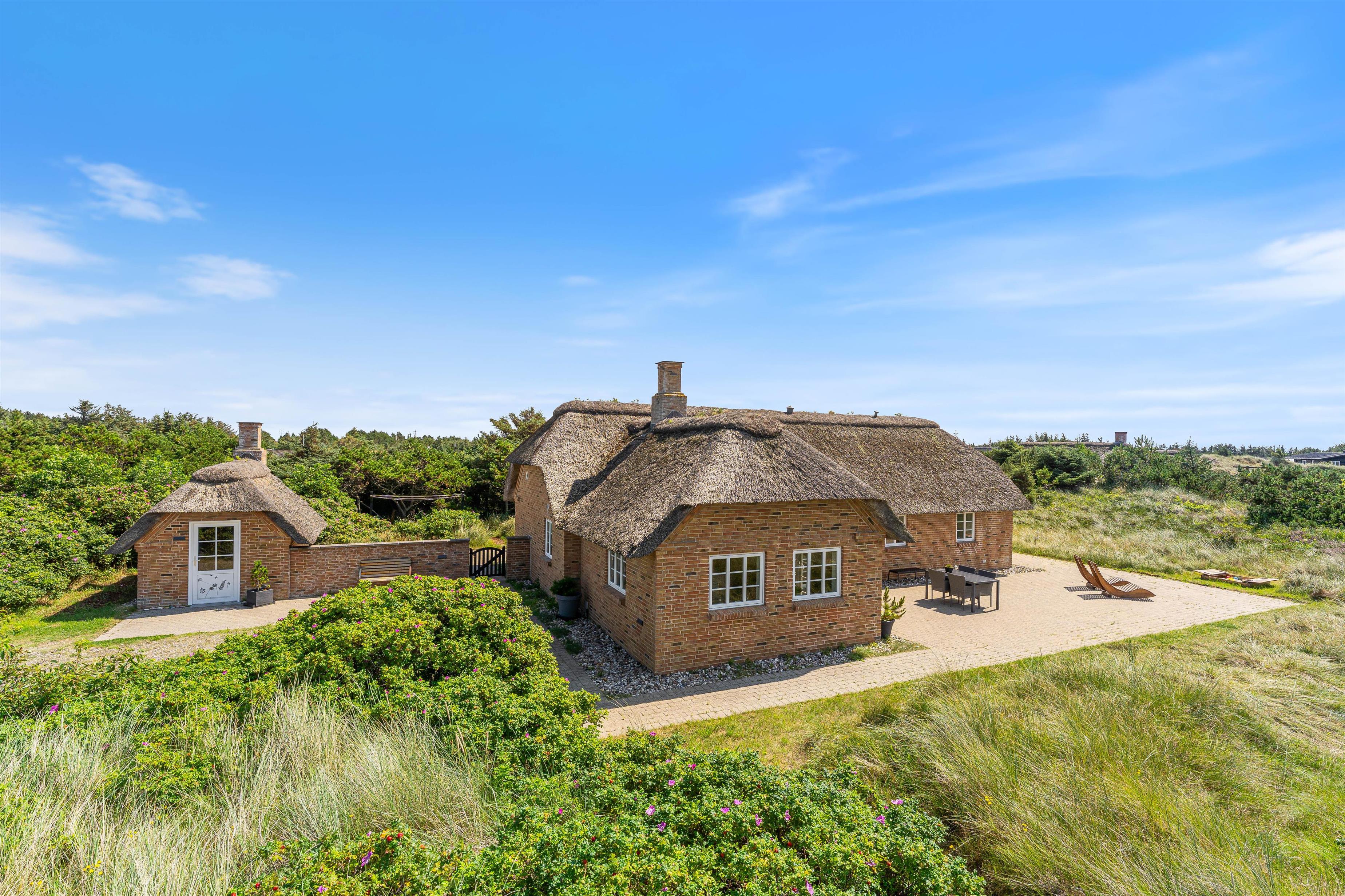 Tilhørende sommerhuset er en rummelig flisebelagt terrasse. Her er der en direkte udsigt til det skønne sommerhusområde og smukke hedelandskab. Derudover er sommerhuset omringet af en smuk naturgrund dækket af lyng og marehalm. Her kan I nyde vejret i liggestolene eller havemøblerne i selskab med et lækkert grillmåltid. Desuden er der her også plads til børnene - der er nemlig en sandkasse, som de kan underholdes med.