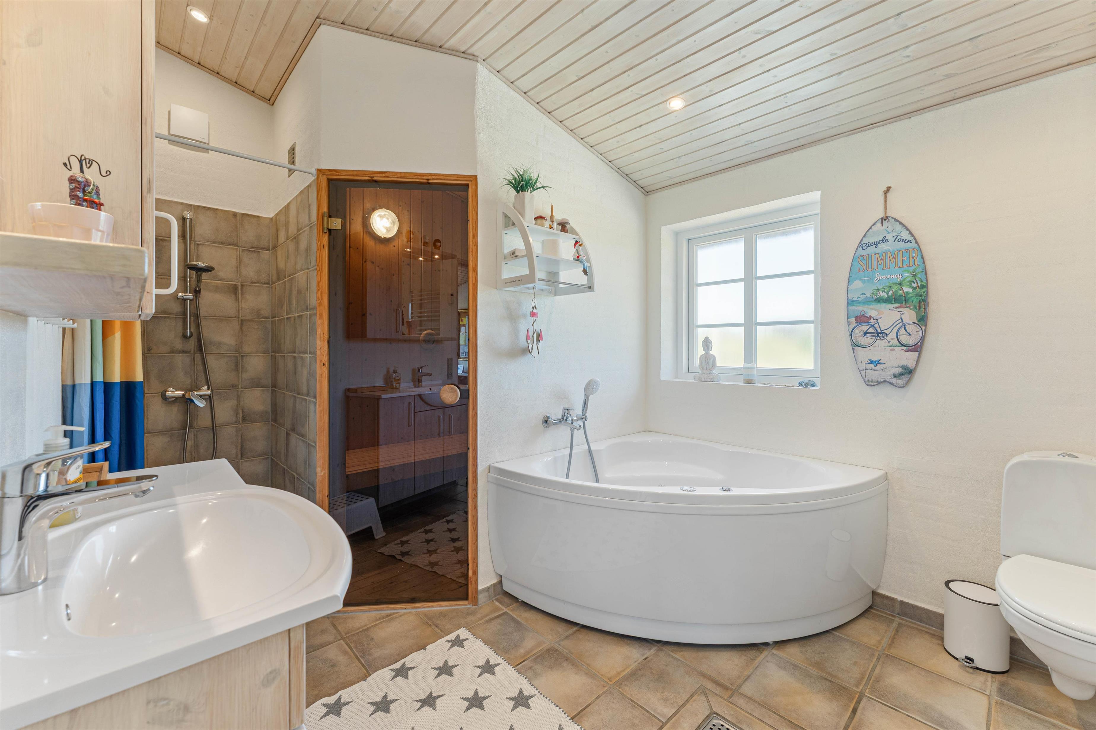 Som en ekstra bonus er der både sauna og spabad på det ene af de to badeværelser. Her kan I slappe helt af og nyde varmen fra vandet efterfulgt af en tur i saunaen. Dette er ekstra skønt i vintermånederne efter en lang kølig gåtur til stranden. Desuden er der gulvvarme på badeværelserne.