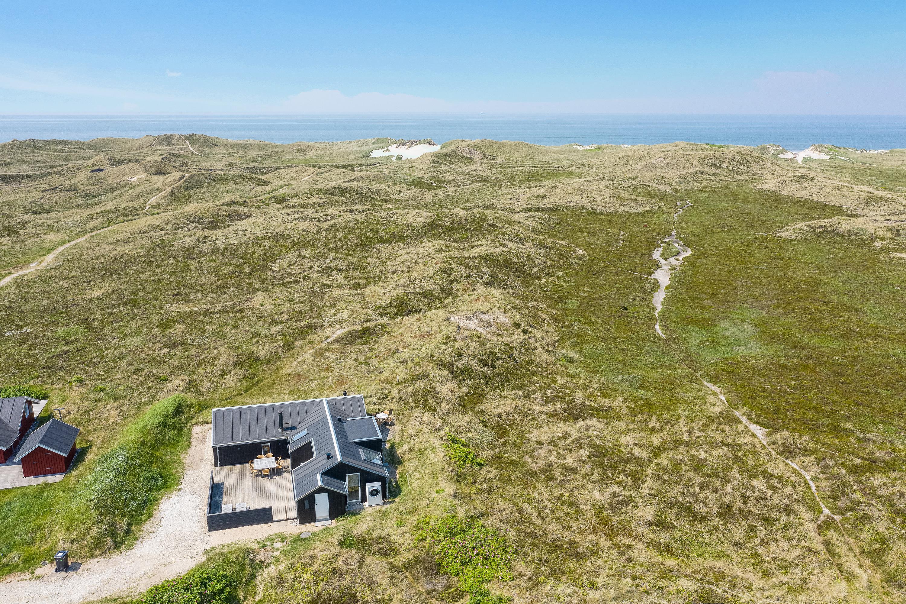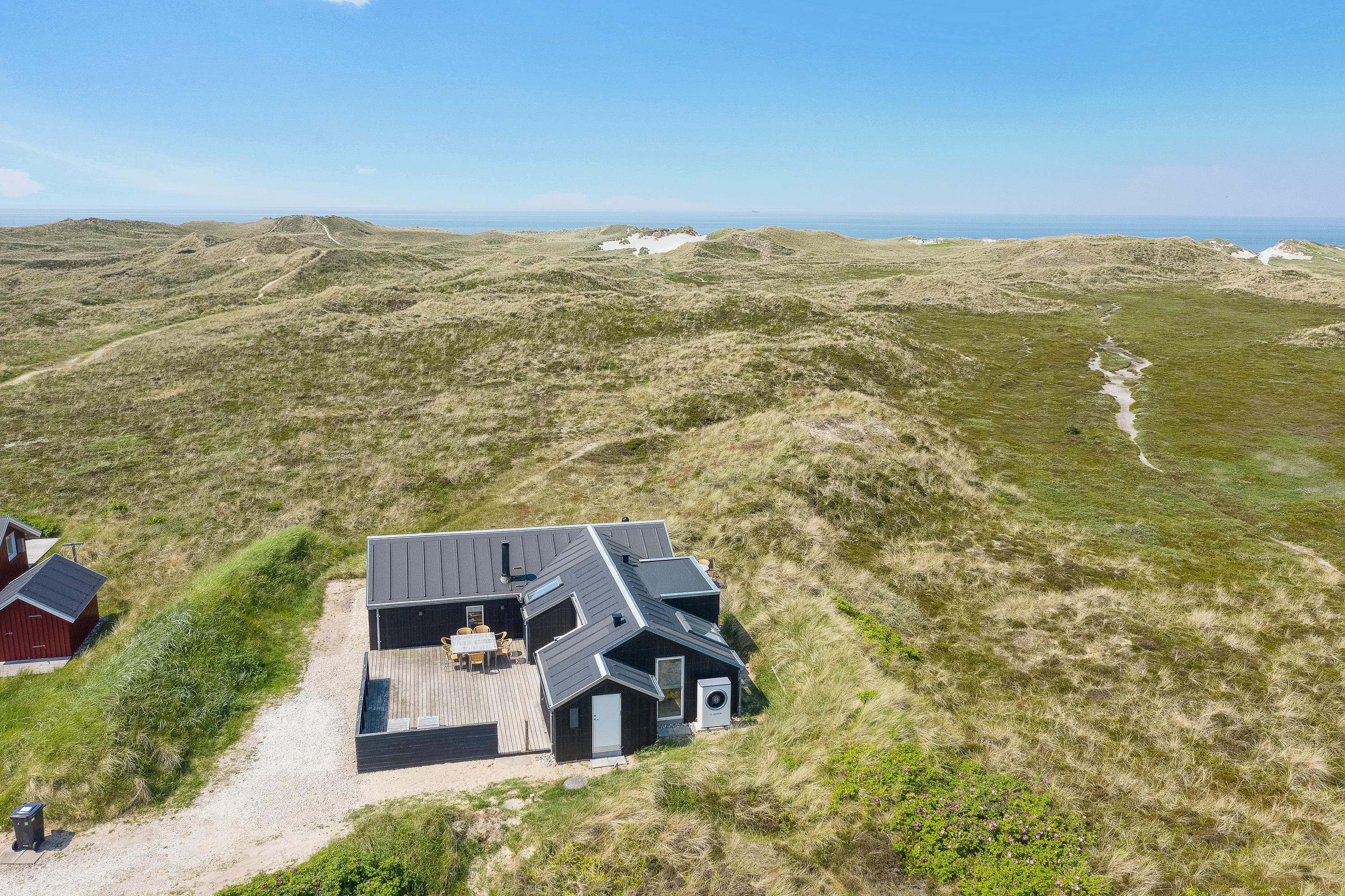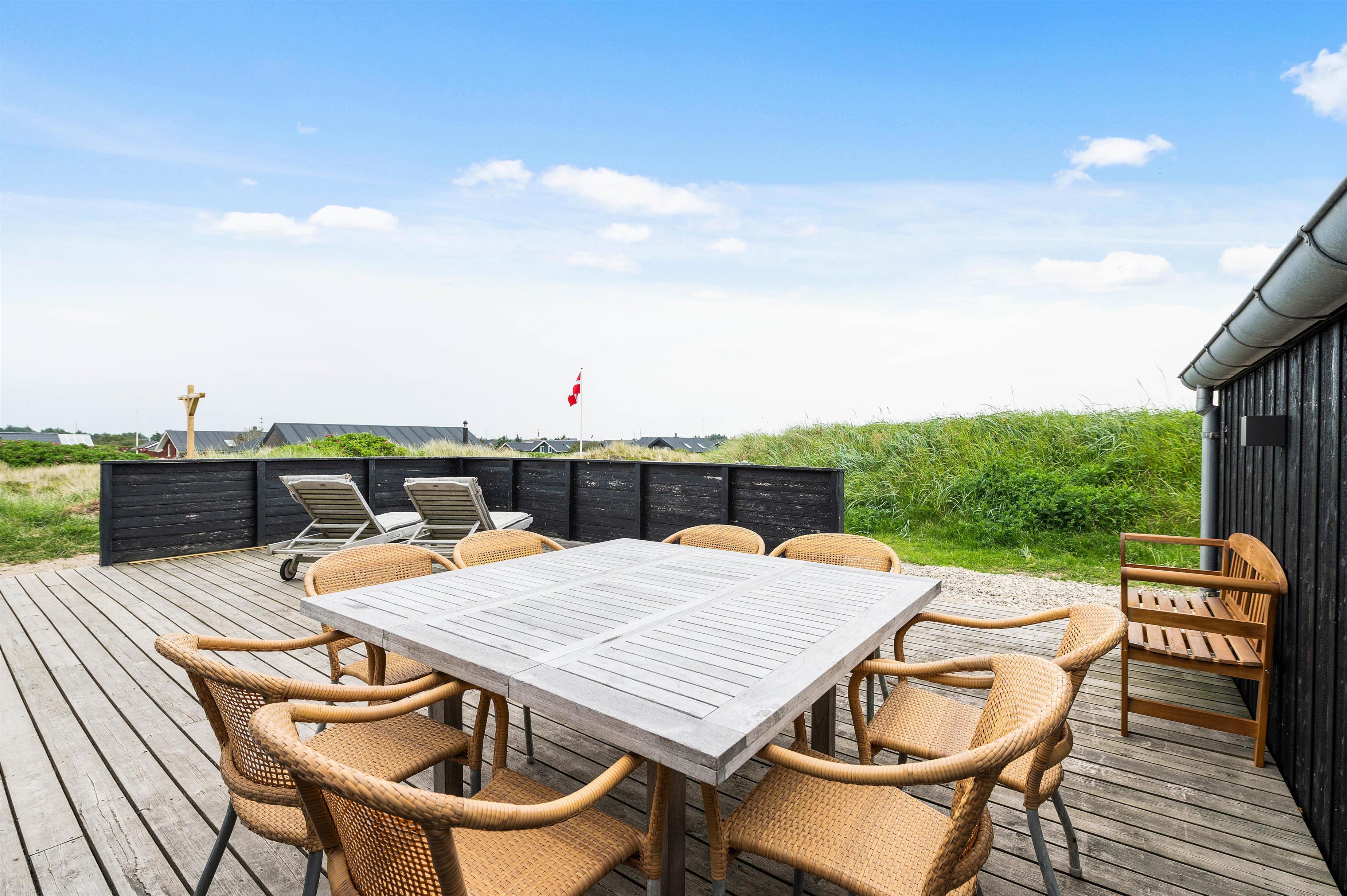 I får en helt fantastisk beliggenhed i første klitrække i Klegod med kun 400 meter fra det brusende Vesterhav. Fra feriehusets terrasser kan I nyde de naturskønne omgivelser, mens I daser i solvognene eller samles rundt om havebordet til en lækker frokost i solen. Der er flere hyggelige lækroge, hvor I kan sidde og nyde en uforstyrret ferie i de smukkeste omgivelser. Der er også en gasgrill til rådighed.