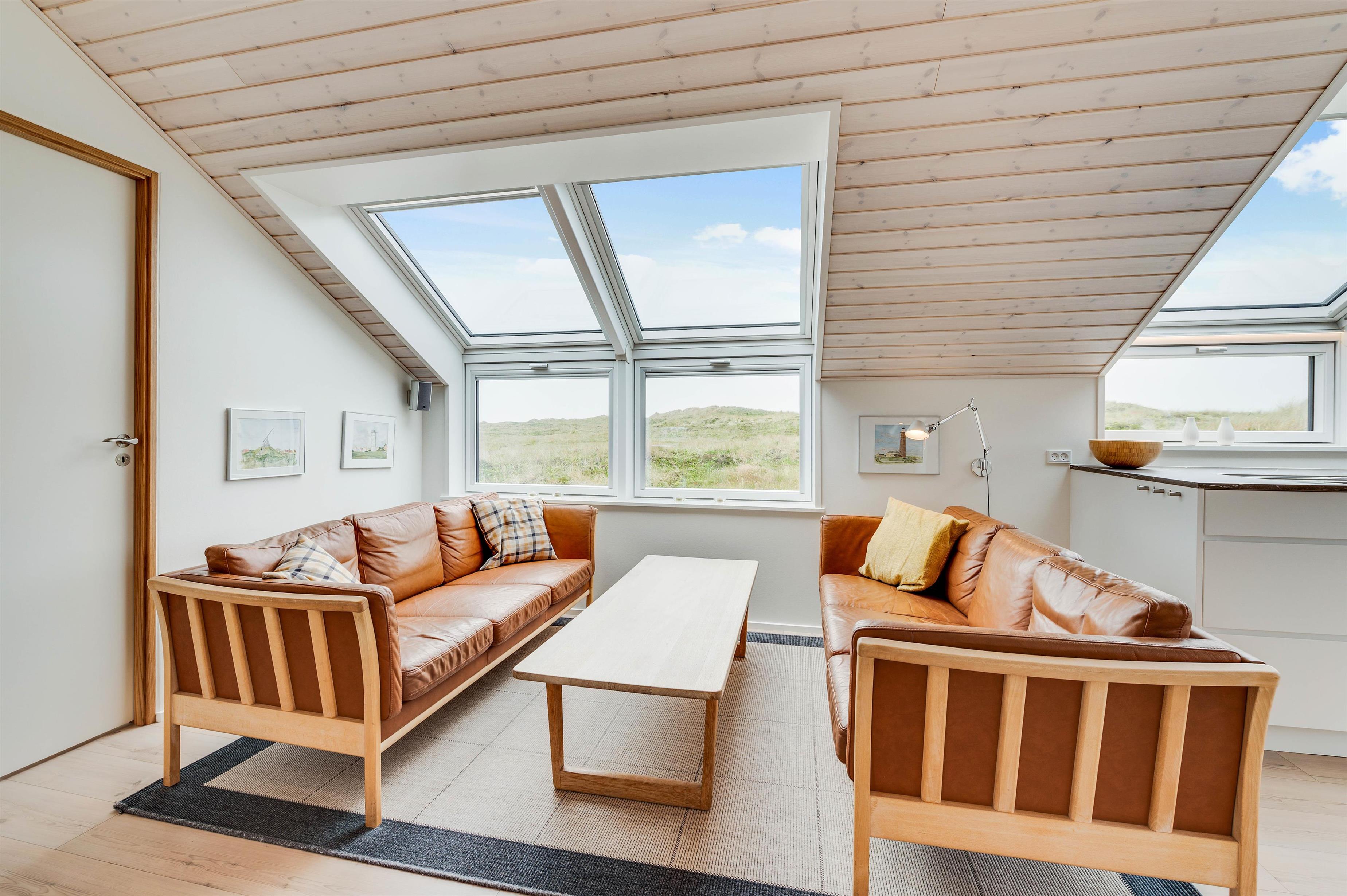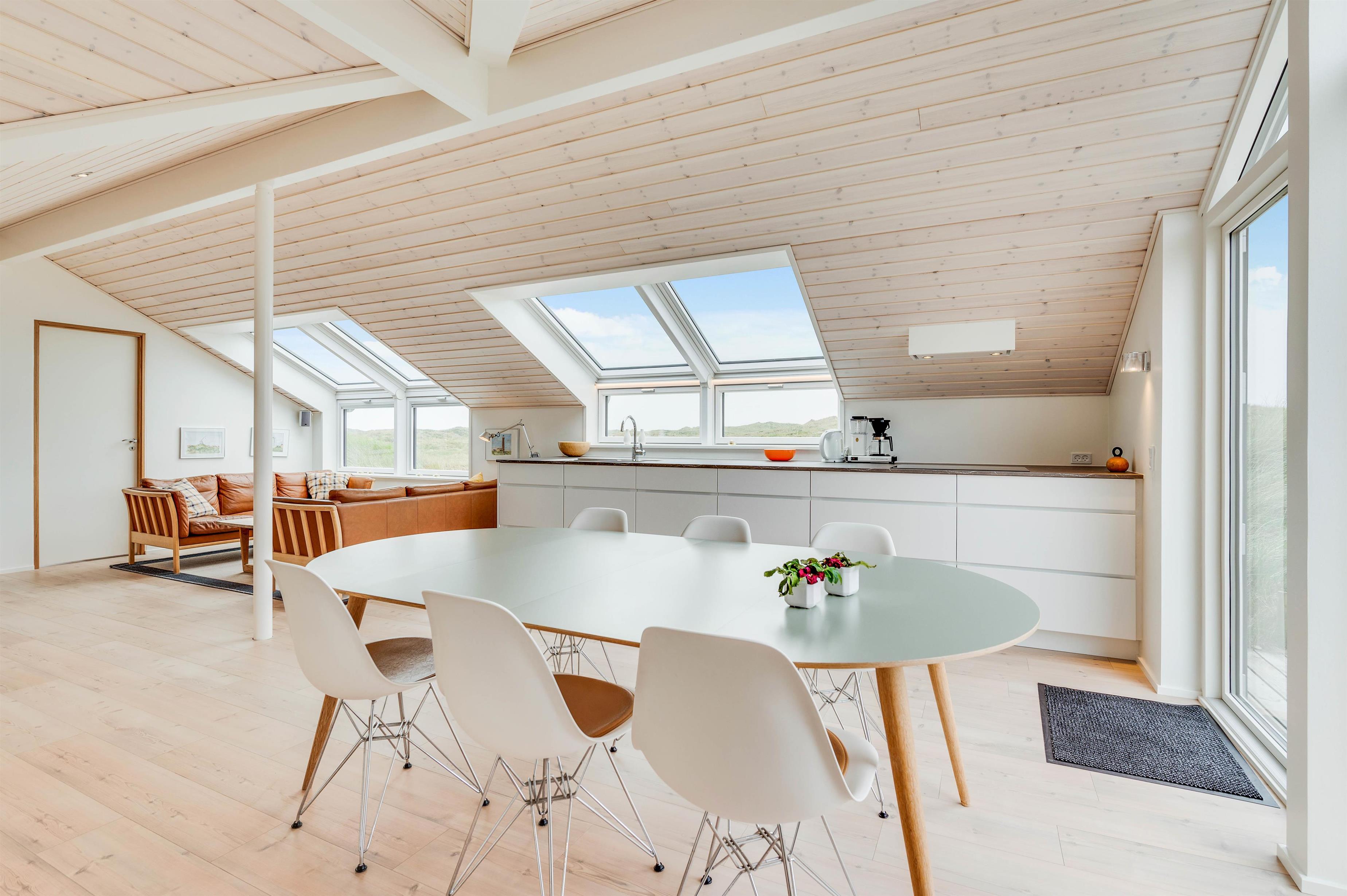 De store ovenlysvinduespartier sørger for, at der kommer rigeligt sollys ind om dagen, og for mulighed for at kigge på en fantastisk stjernehimmel, når mørket er faldet på. Der er også ovenlys i soveværelserne, der har separate udgangsdøre lige ud til naturen. Køkkenet og opholdsrum er integreret og med direkte udgang til en dejlig, ugeneret terrasse, hvor I kan sidde og nyde morgenmaden, mens I planlægger feriens udflugter.