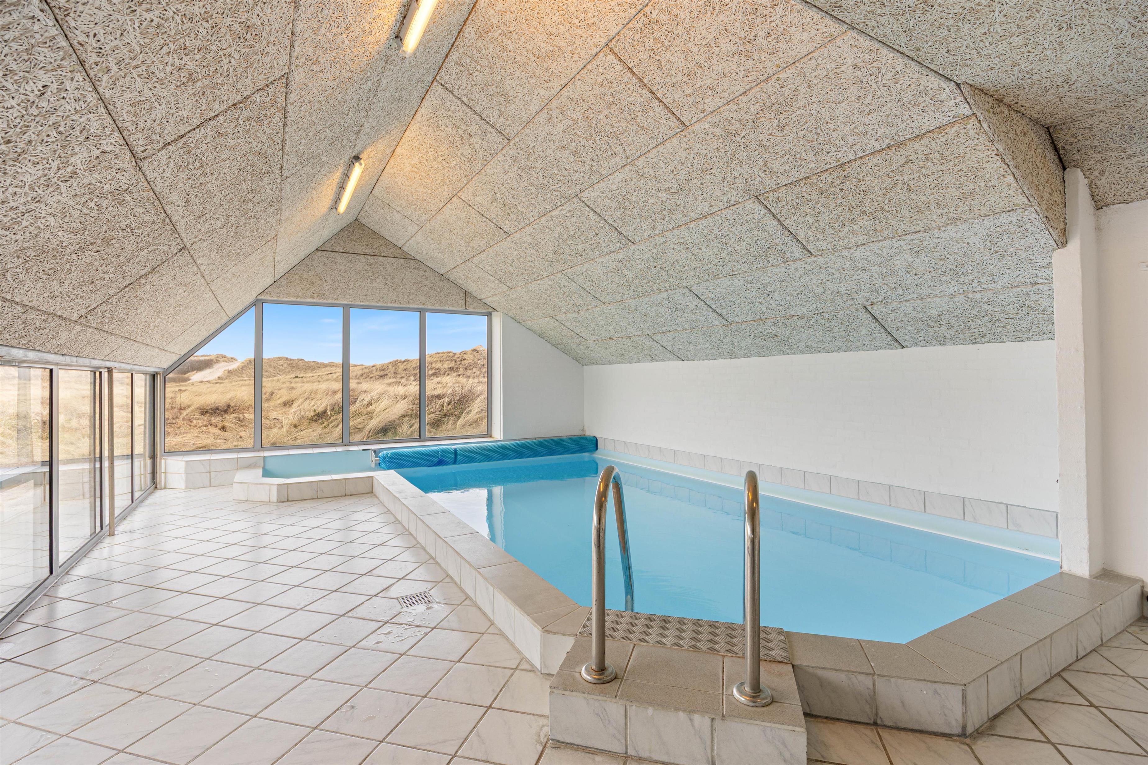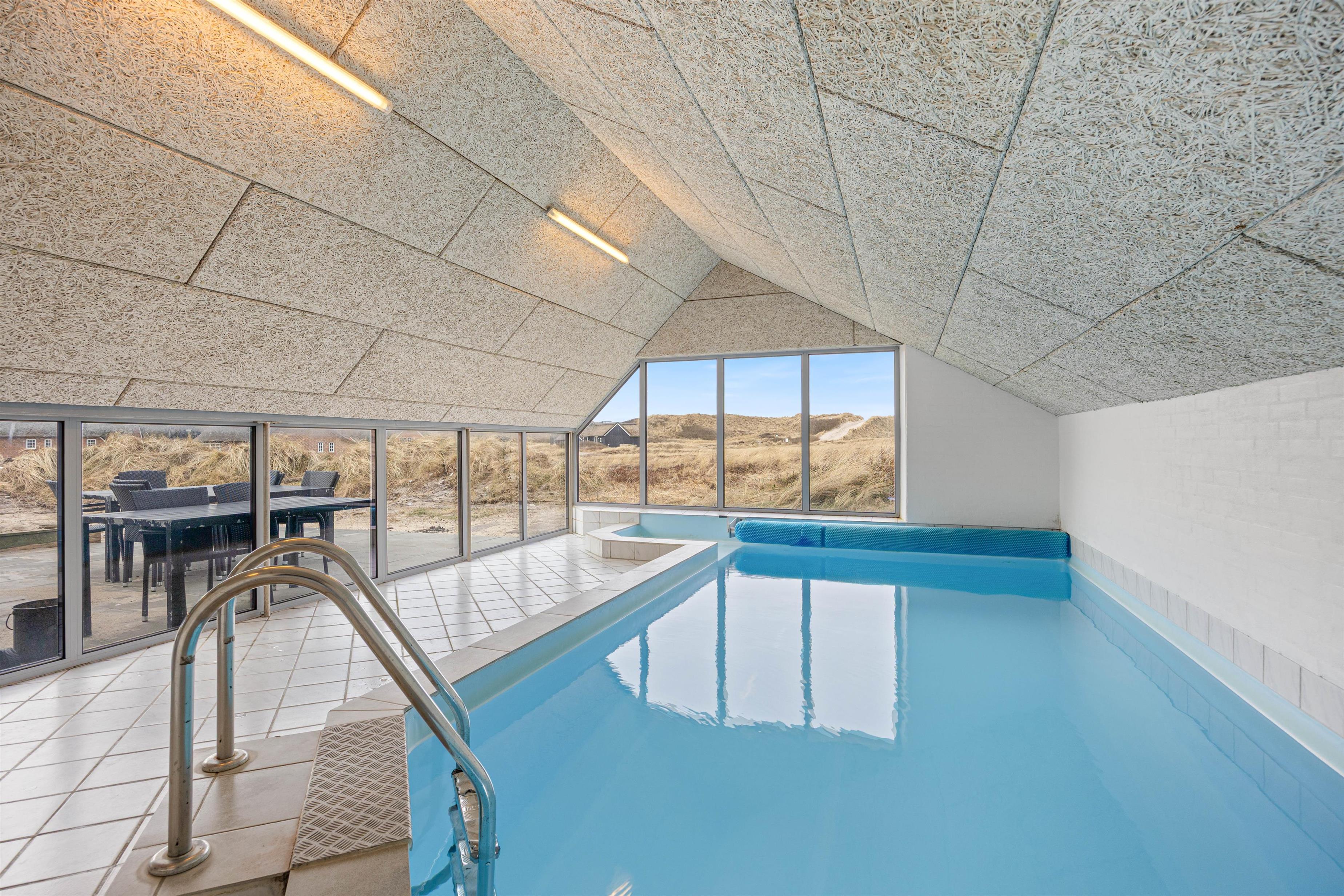 Indendørs venter timevis af underholdning og afslapning. Den 15 m² store pool bliver hurtigt samlingspunkt for både børn og voksne – her kan der leges, svømmes og trænes med svømmetræner. Når kroppen trænger til ro, kan I lade varmen omslutte jer i saunaen eller synke ned i tømmespaen og bare nyde øjeblikket.