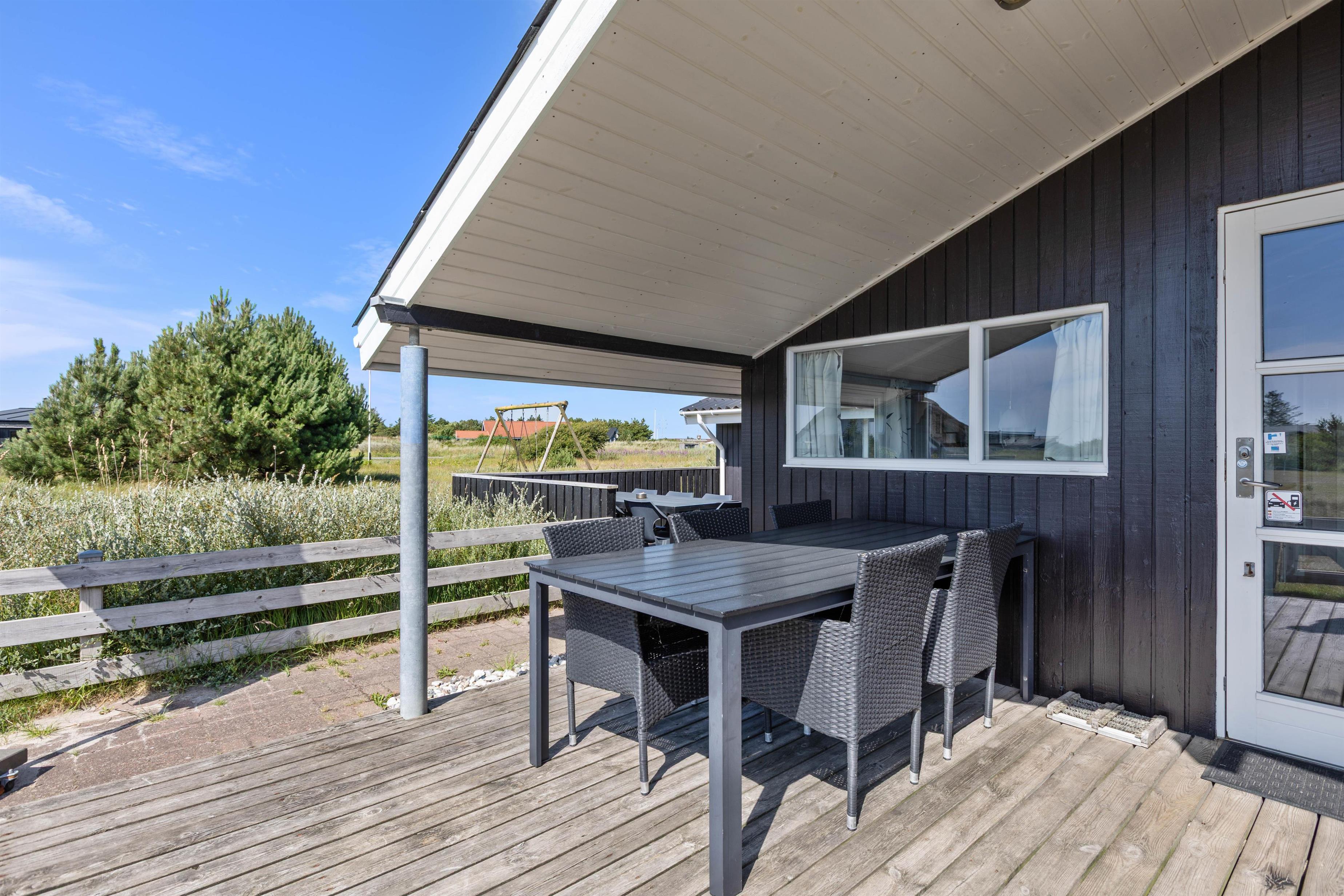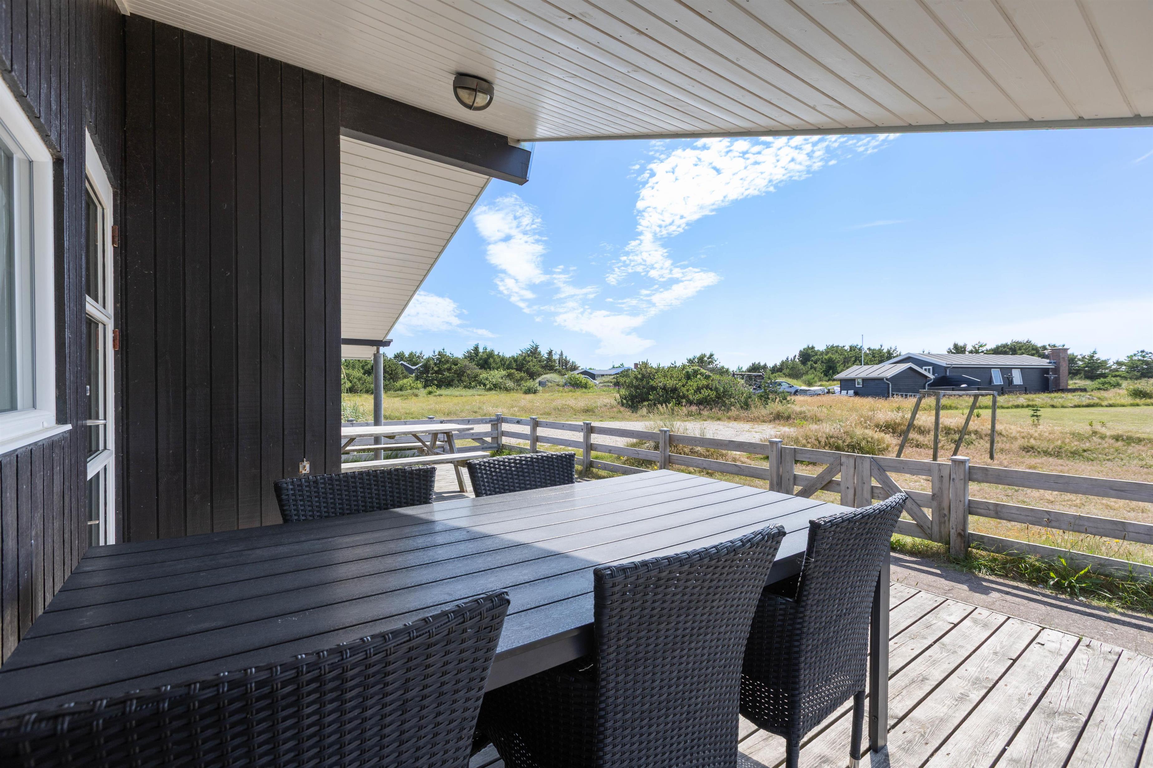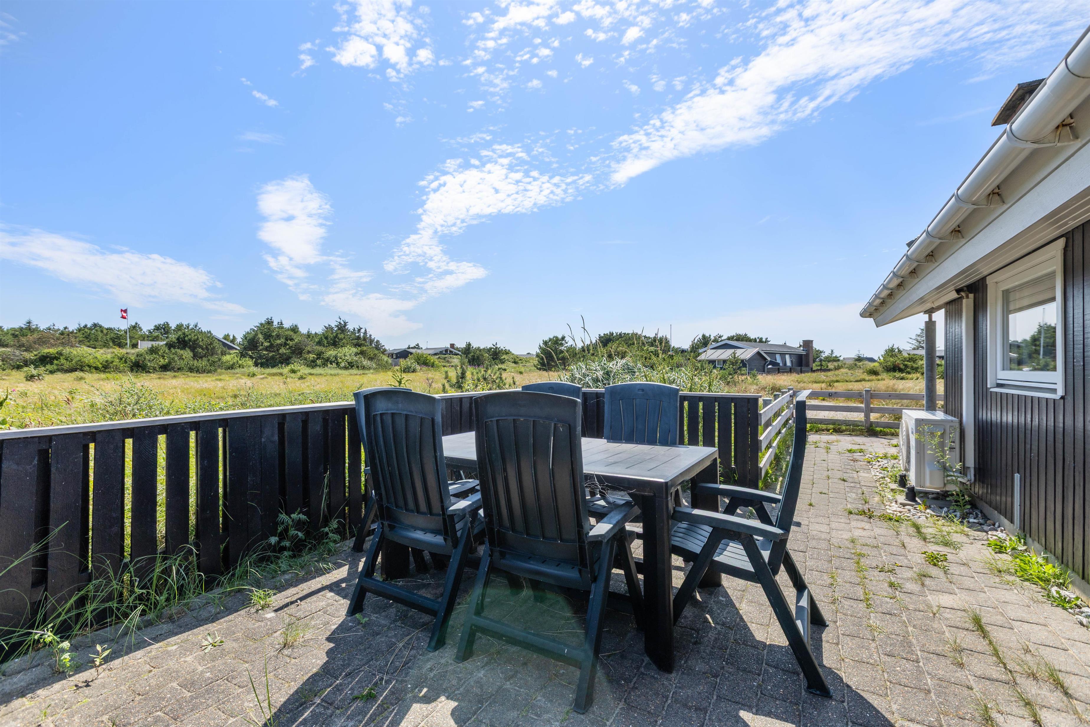 Der er terrasse næsten hele vejen rundt om feriehuset - både en åben, lukket, afskærmet og overdækket del. Der er altså både mulighed for at slappe af i skyggen eller nyde solens stråler i liggestolene.