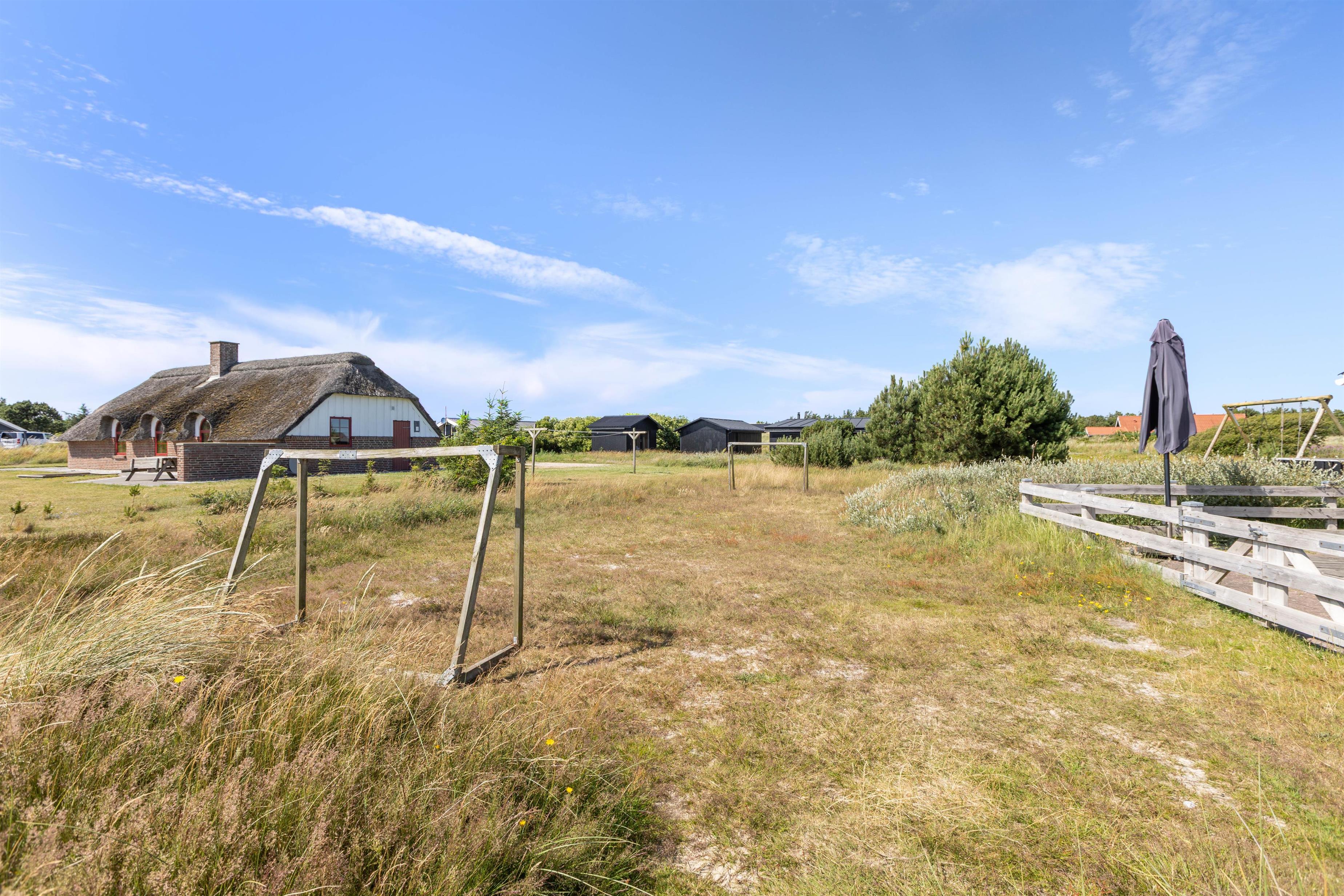 På græsplænen er der legemuligheder for både store og små med fodboldmål, gyngestativ og sandkasse. Måske skal de voksne udfordres til en fodboldturnering i det gode vejr - eller også kan I se til, mens aftensmaden tilberedes på feriehusets grill?