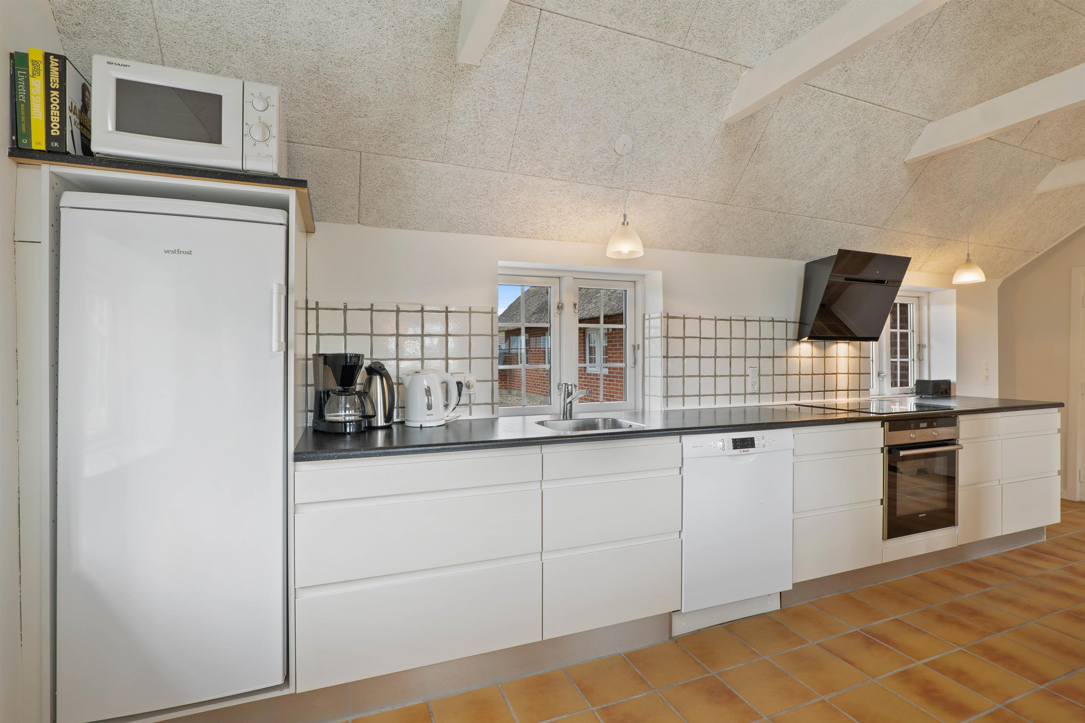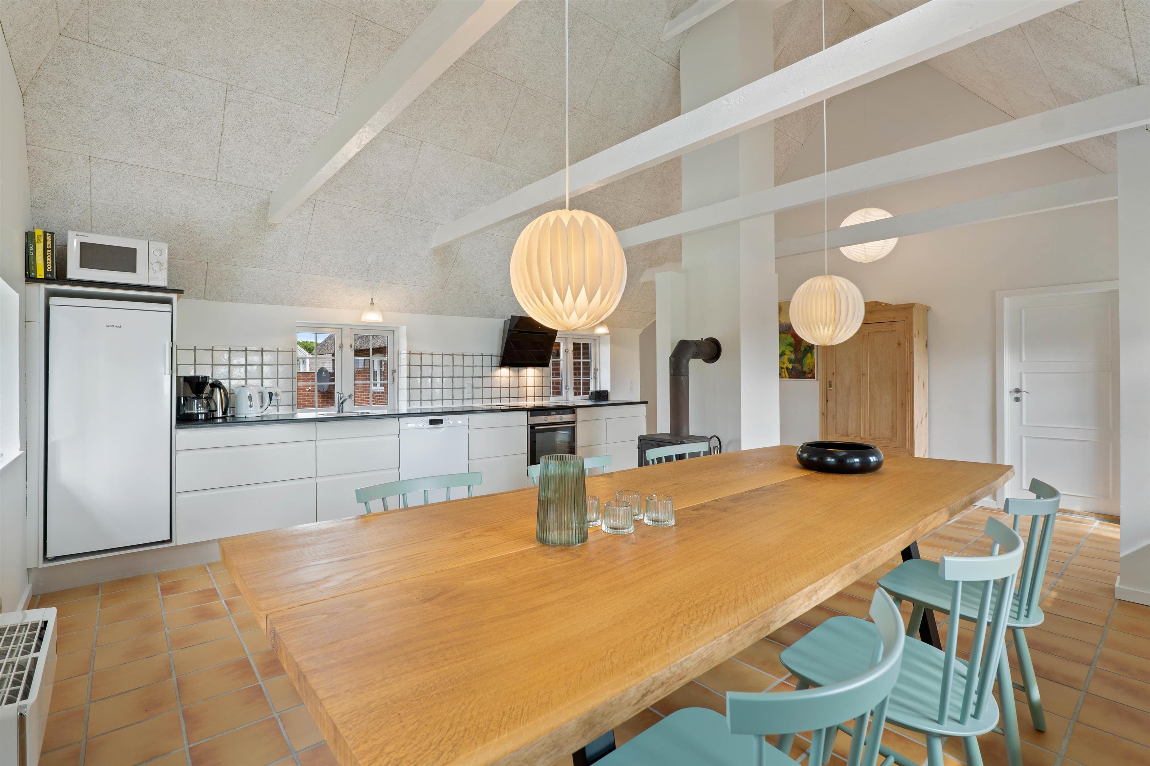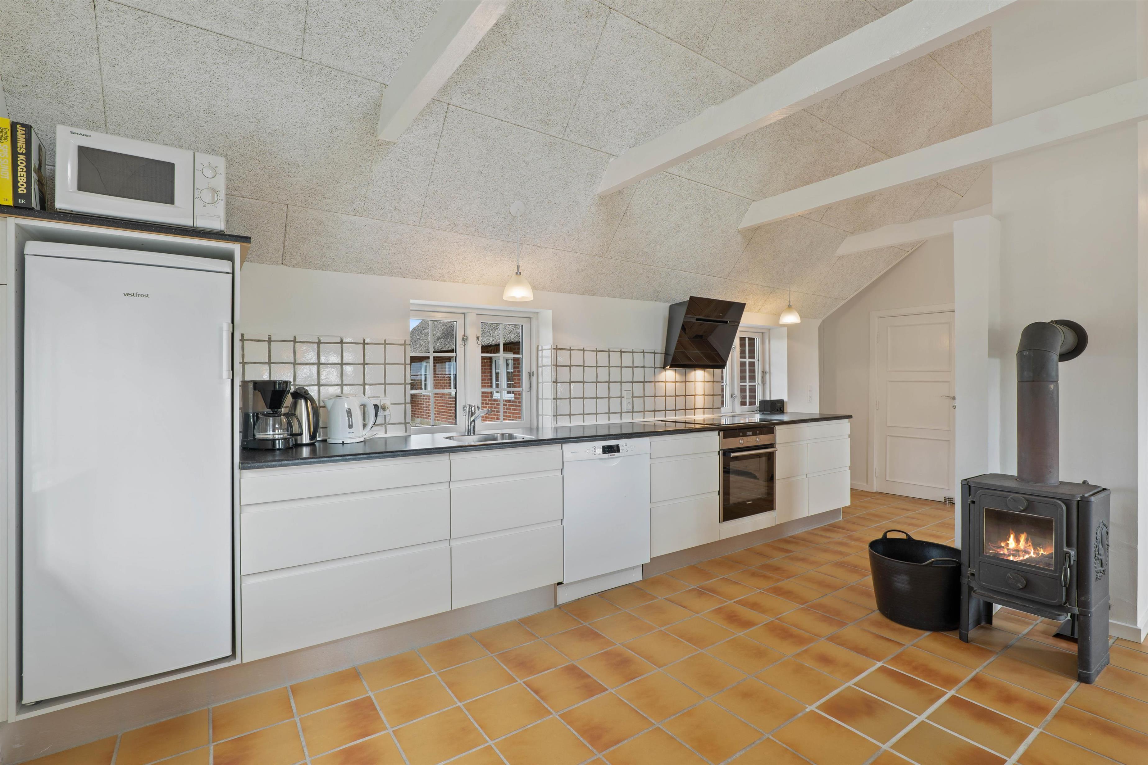 Sommerhuset er renoveret i 2022 og traditionelt opdelt med et flot køkken-alrum med brændeovn. Hvorfra der er udsigt til Ringkøbing Fjord. Køkkenafdelingen er bl.a. udstyret med induktions-komfur, mikroovn, opvaskemaskine og en stor fryser.