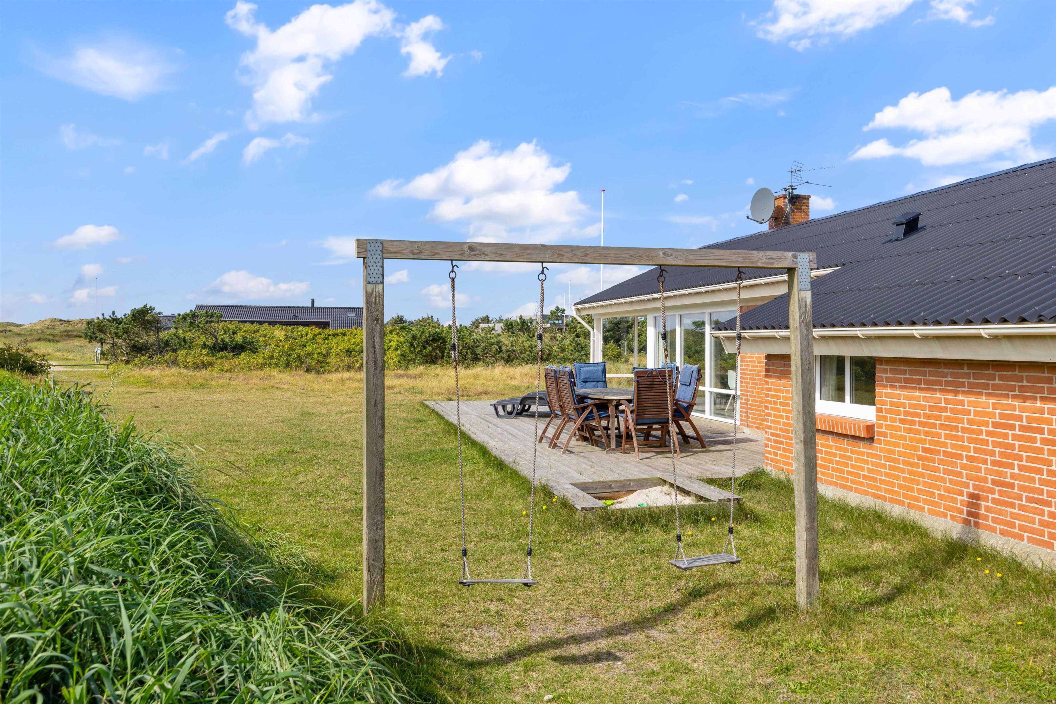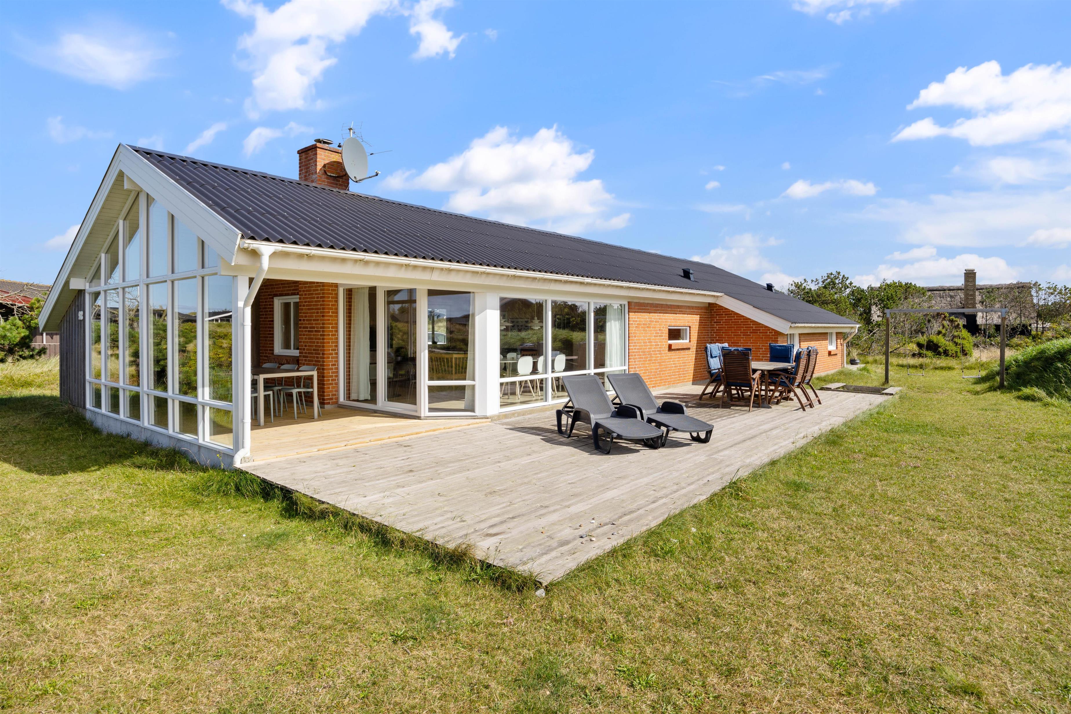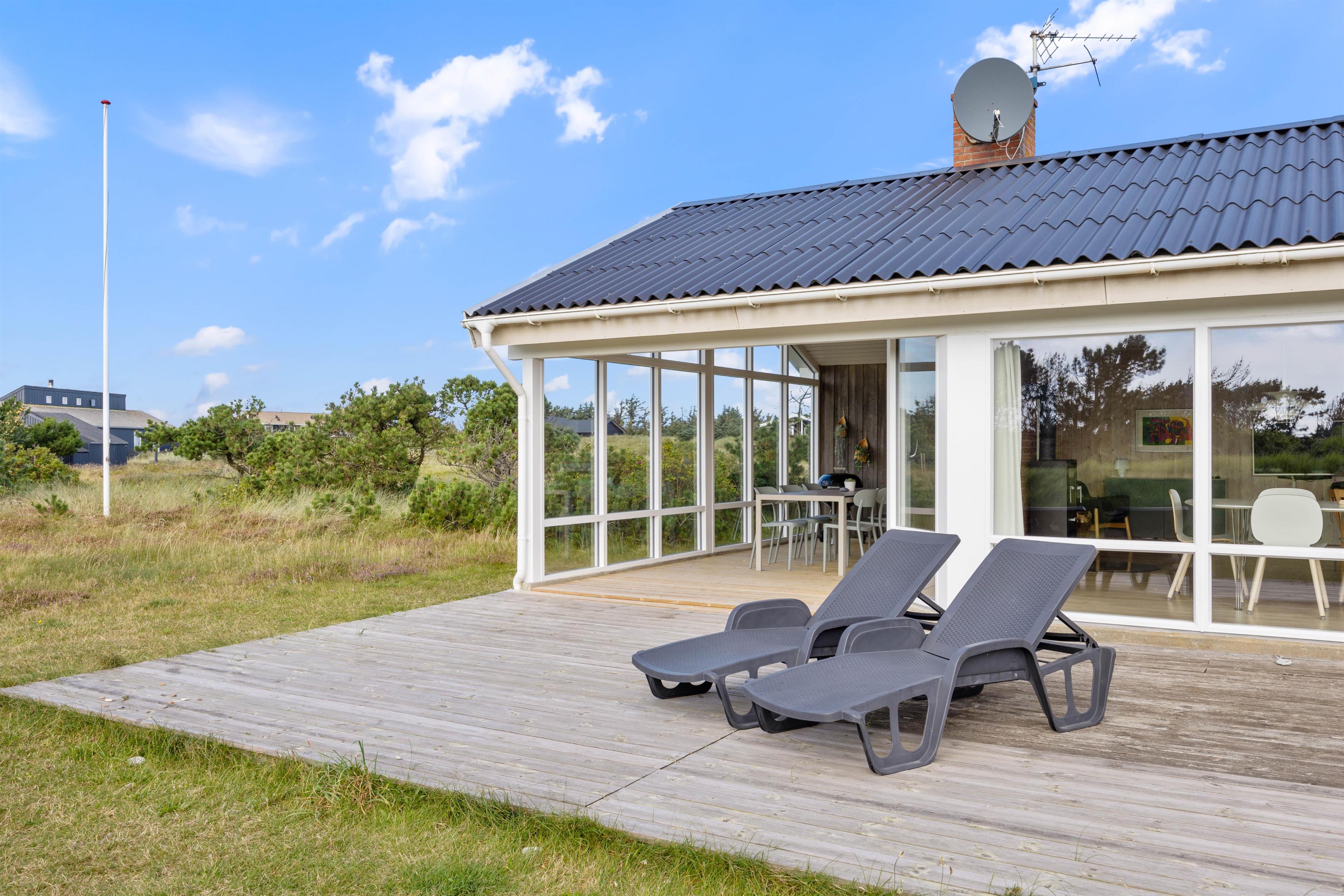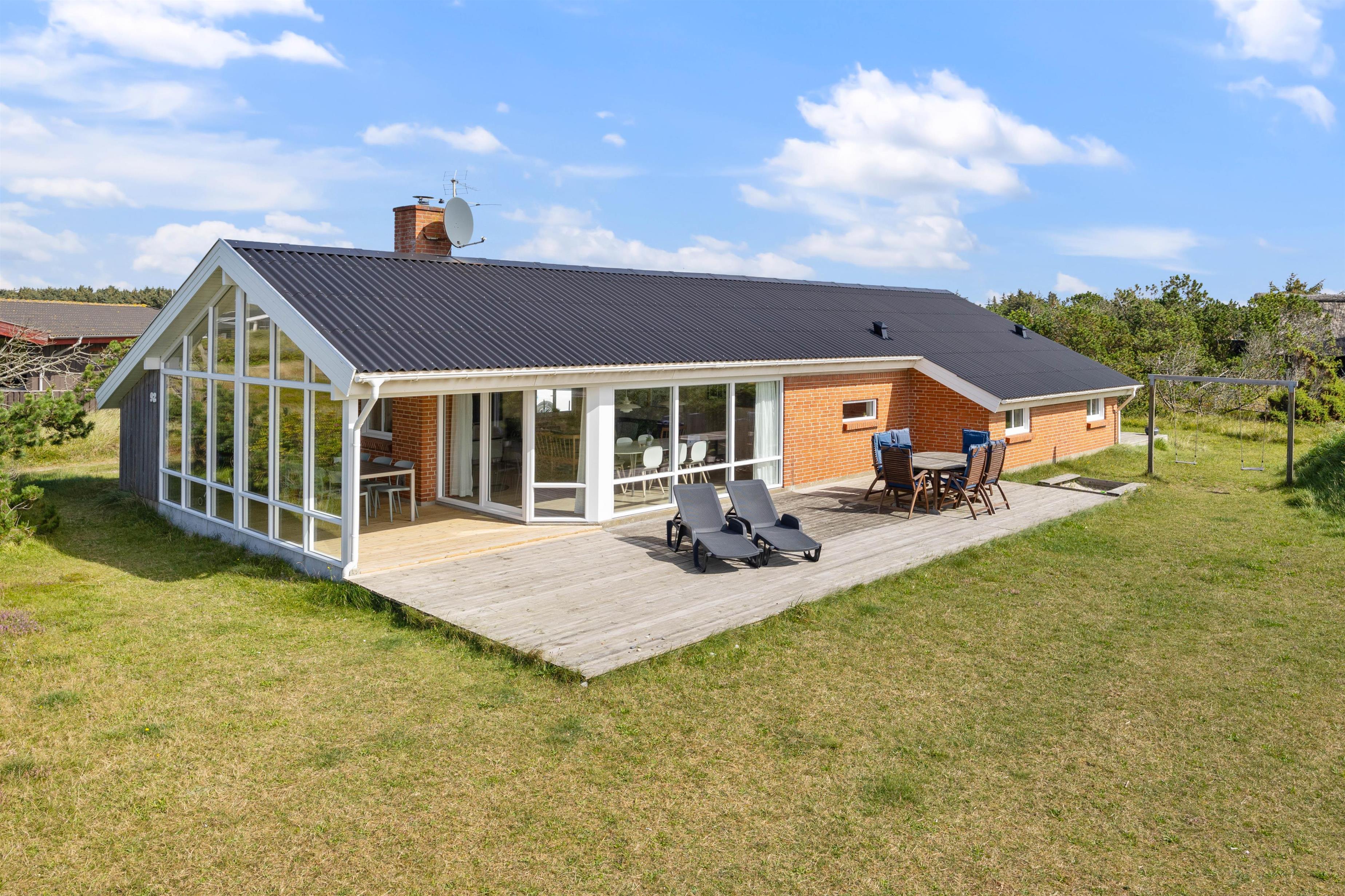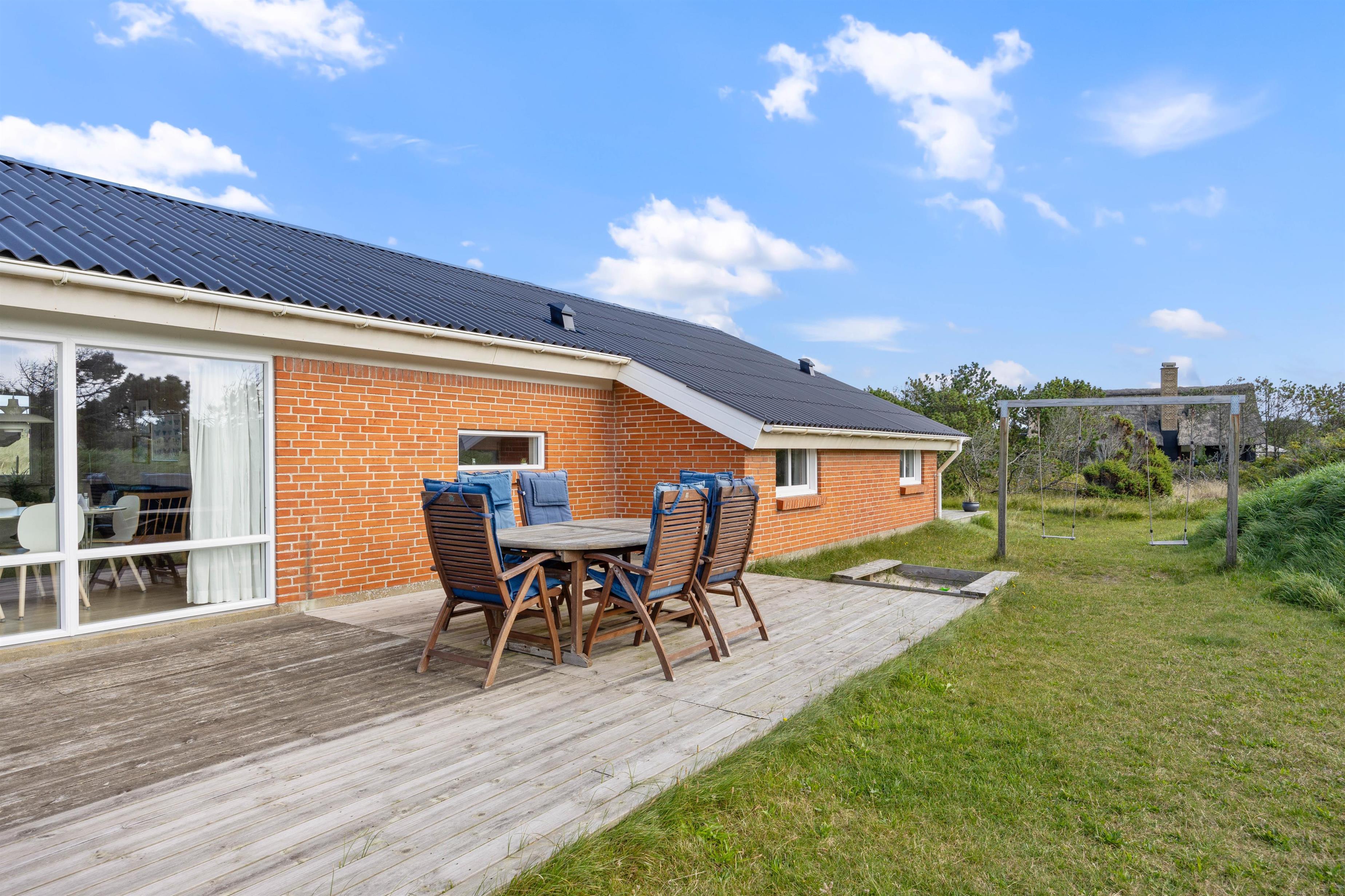 Kun 500 meter fra Vesterhavet på en stor klitgrund ligger dette dejlige sommerhus med skøn overdækket terrasse til de lange sommeraftener.