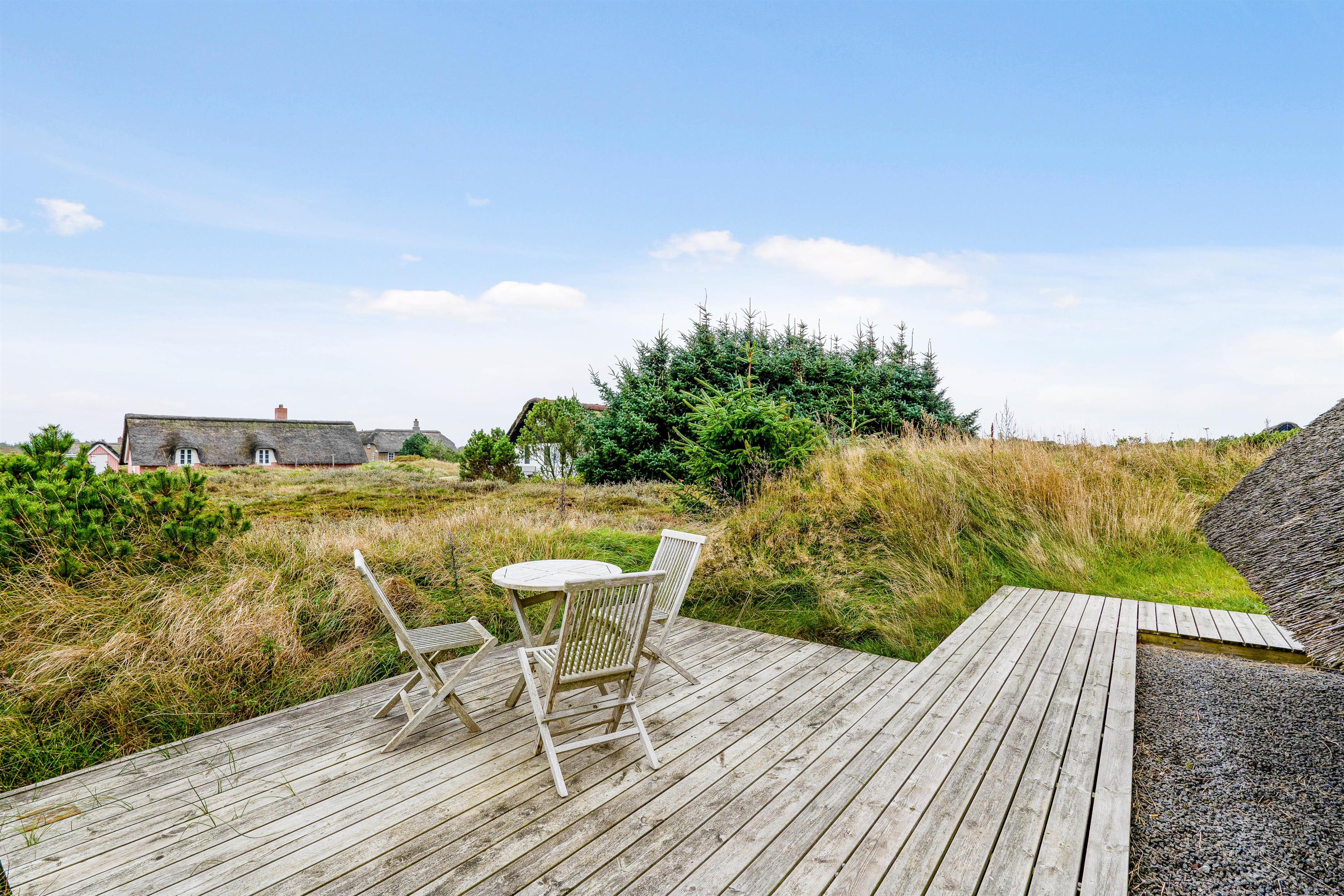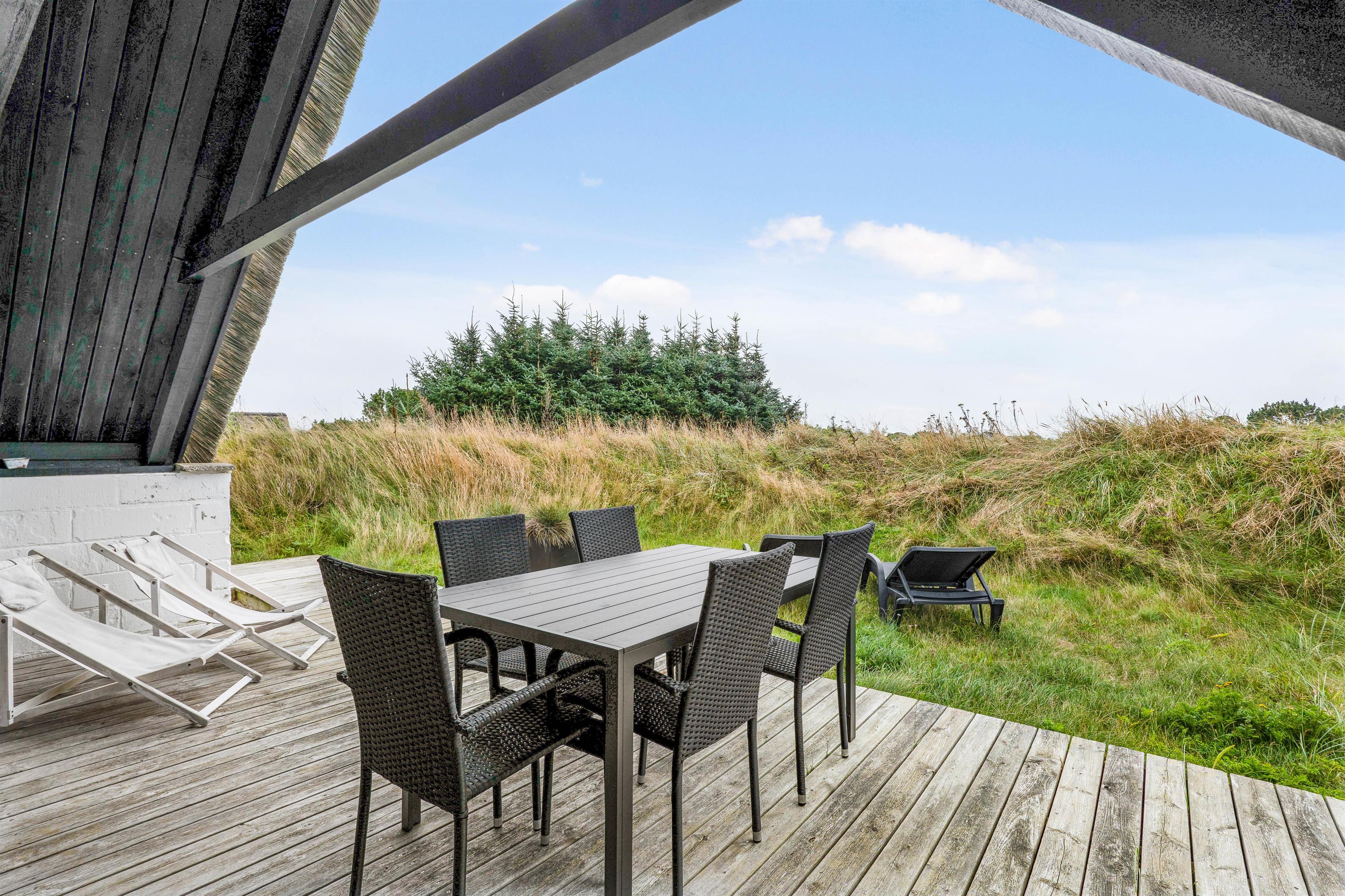 Omkring det meste af sommerhuset løber en træterrasse, hvor I vil kunne finde jer en god plads at nyde de varme og solrige feriedage fra. På terrassen står der både havemøbler og liggestole til jer, som I kan finde jer godt til rette i. Terrassen er delvist overdækket og afskærmet, så her har I mulighed for at sidde i ly og læ.
