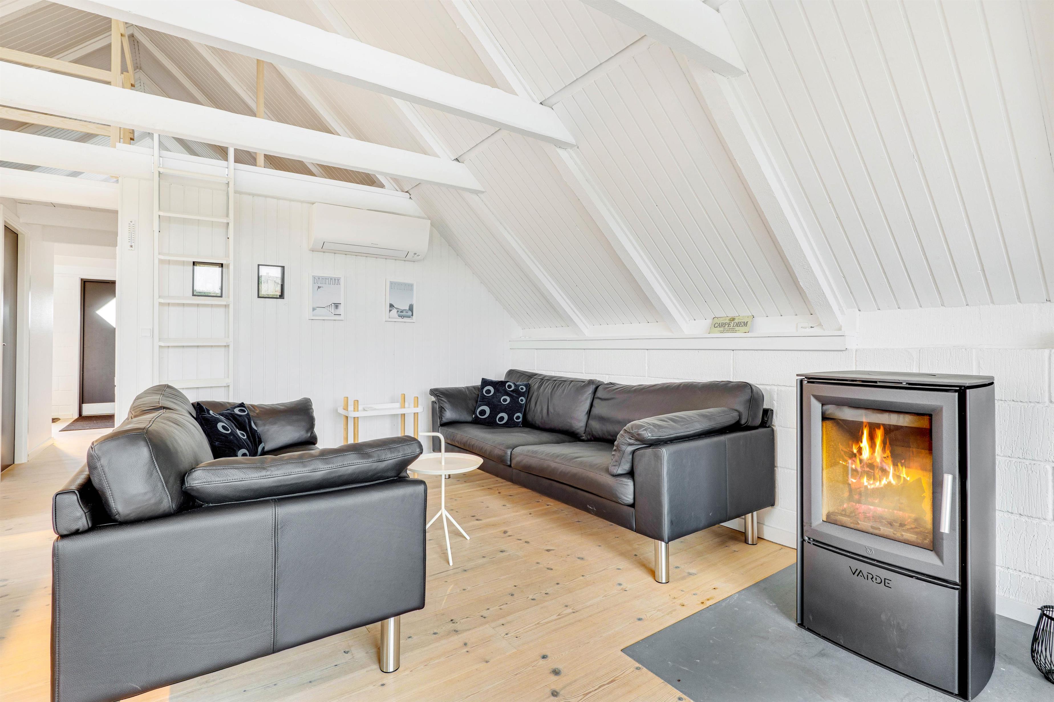 I sommerhuset kommer I uden tvivl til at tilbringe mange hyggelige feriestunder i alrummet, hvor køkken, stue og spisestue er forenet i ét rum. I alrummet sørger brændeovnen for at sprede god stemning og dejlig varme. Desuden er der en energivenlig varmepumpe i sommerhuset, der sikrer jer et godt indeklima på ferien.