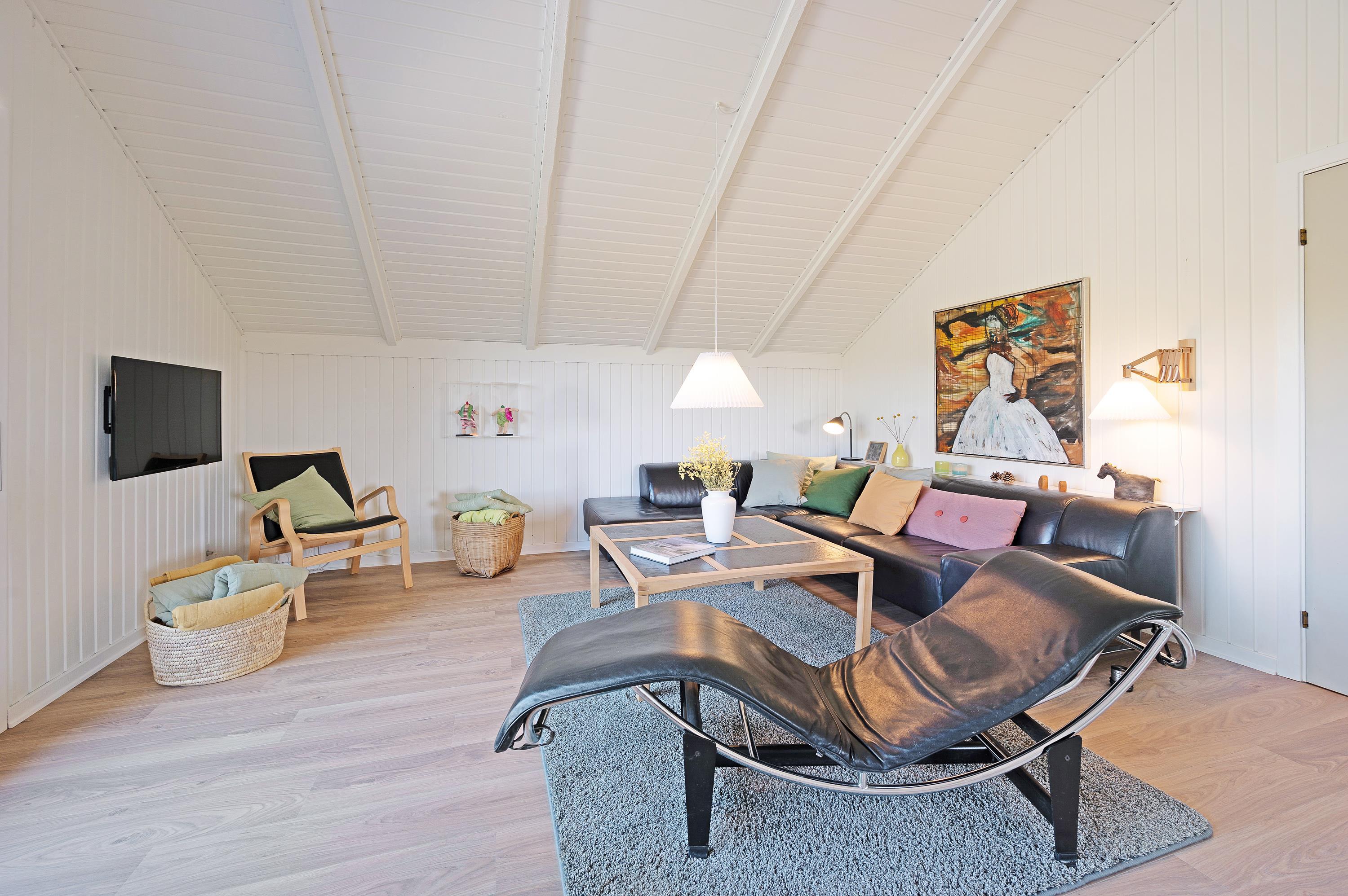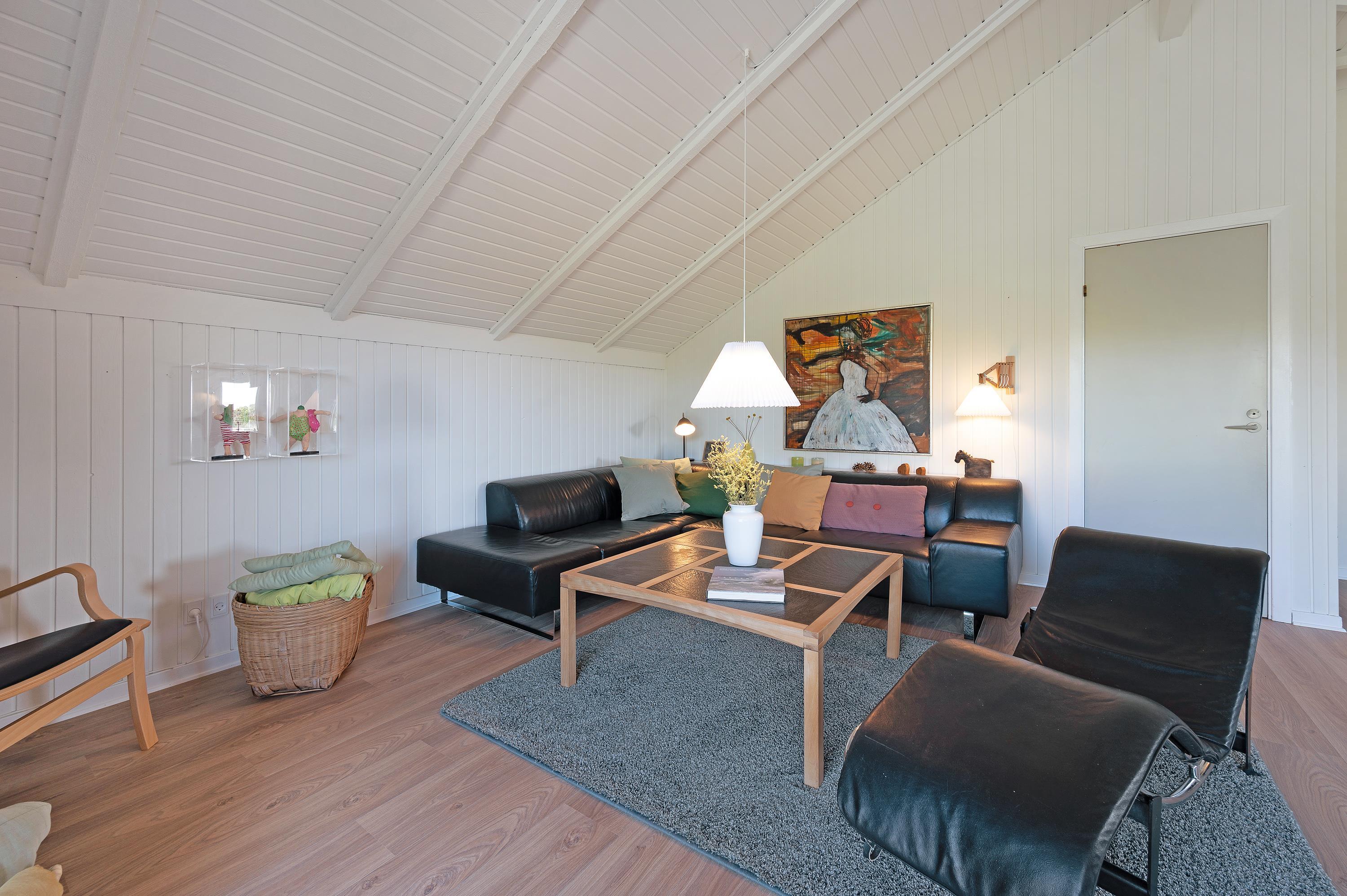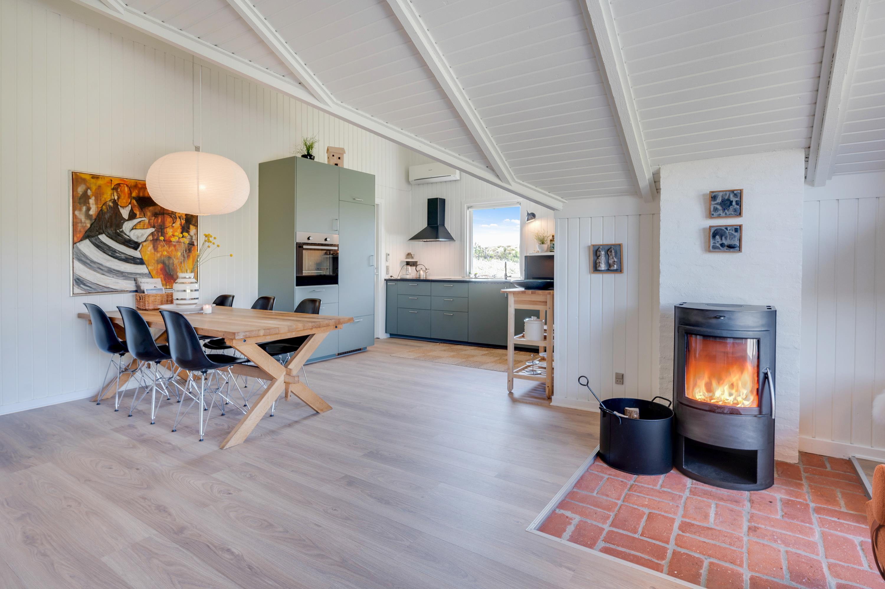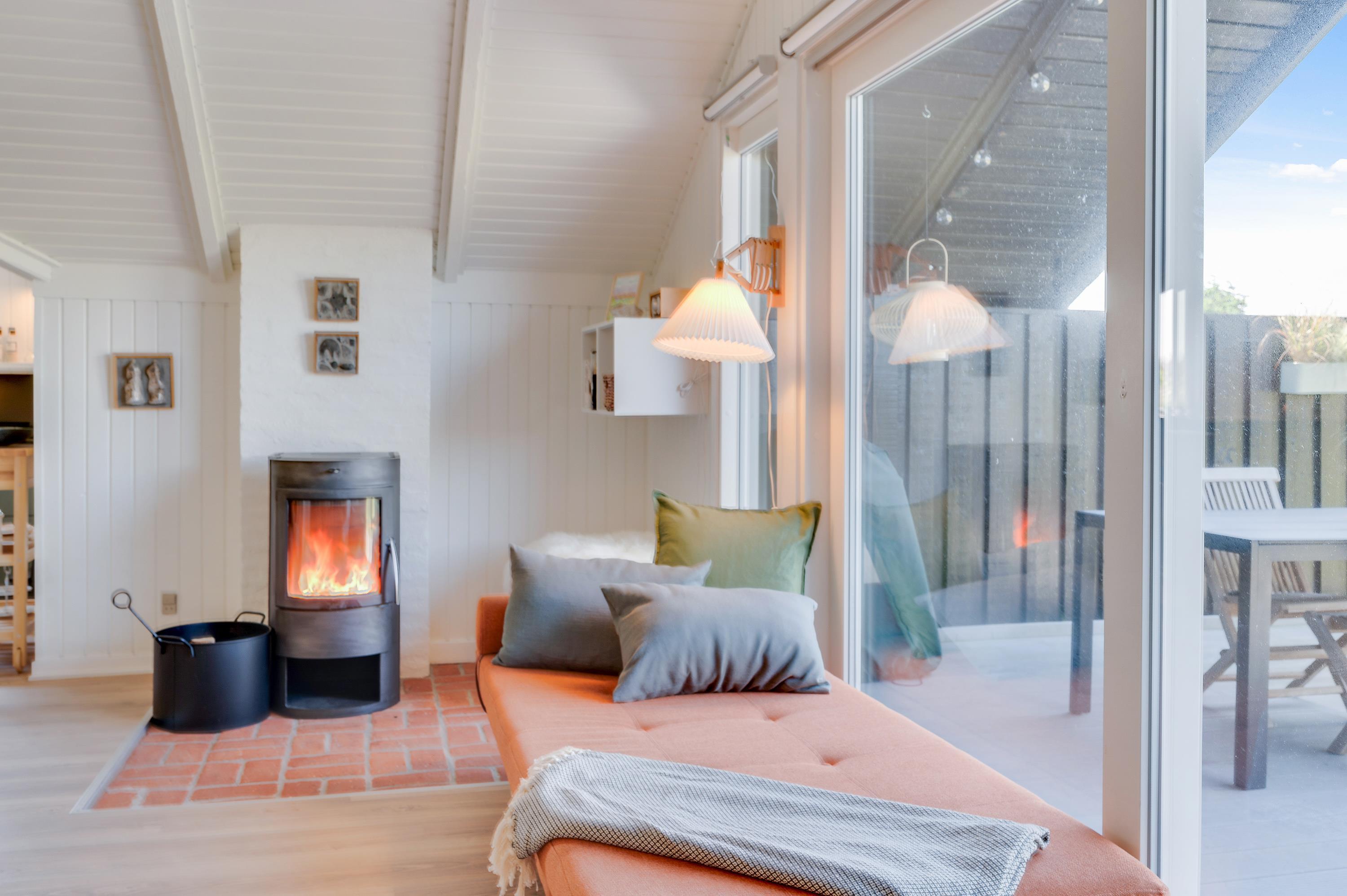 Der er et lækkert køkken med opvaskemaskine, og køkkenet ligger i åben forbindelse til stuen. I stueafdelingen er der en hyggelig brændeovn, en stor fladskærm og en lækker sofa, hvor du kan slappe af til en god film med ild i brændeovnen.