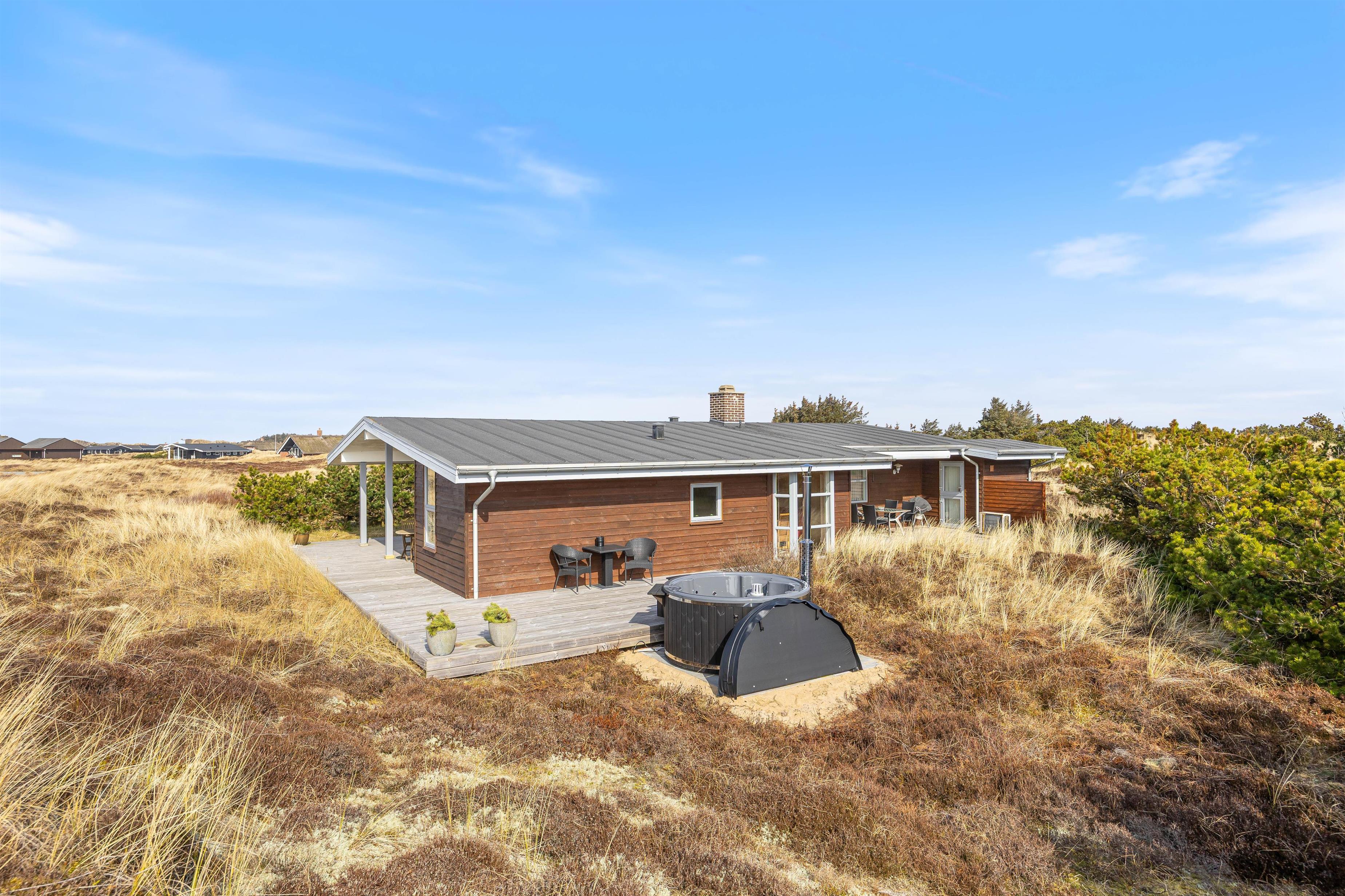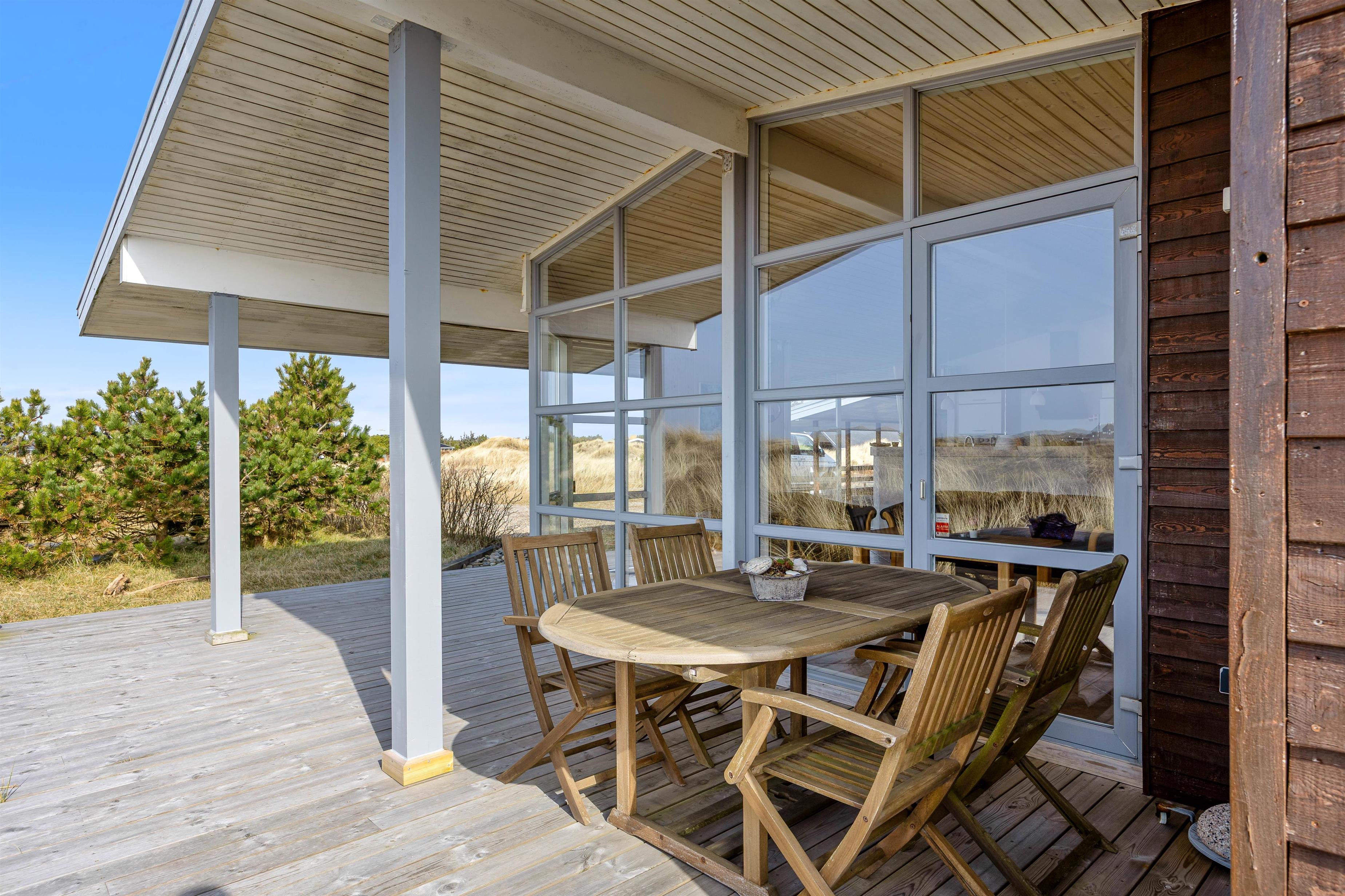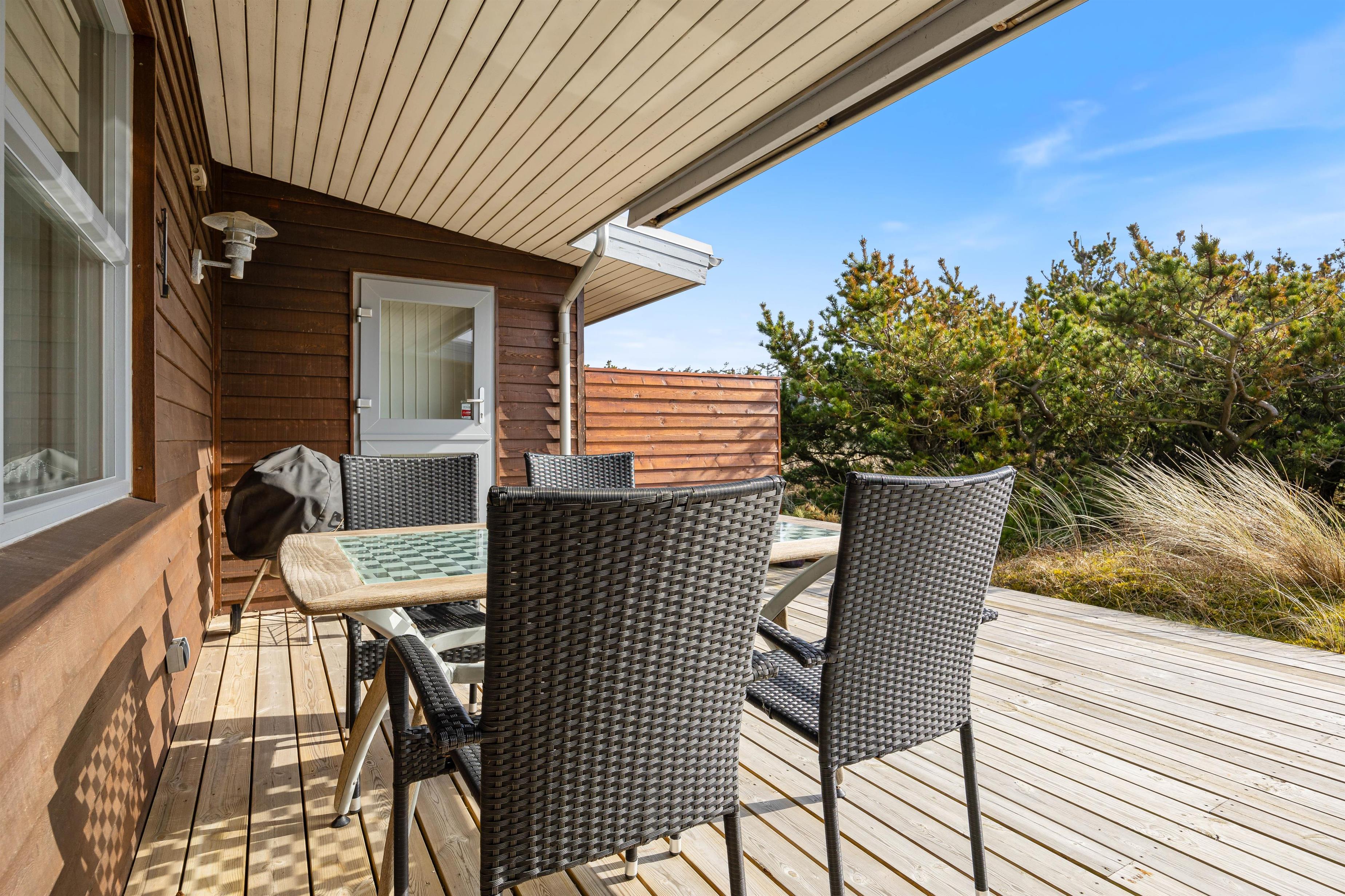 Sommerhuset ligger på en klitgrund med masser af muligheder for at nyde ferien udenfor. På terrassen finder I både havemøbler og grill, så I kan slappe af og nyde solen. Om aften kan I tilberede aftensmaden på grillen og nyde maden under åben himmel.