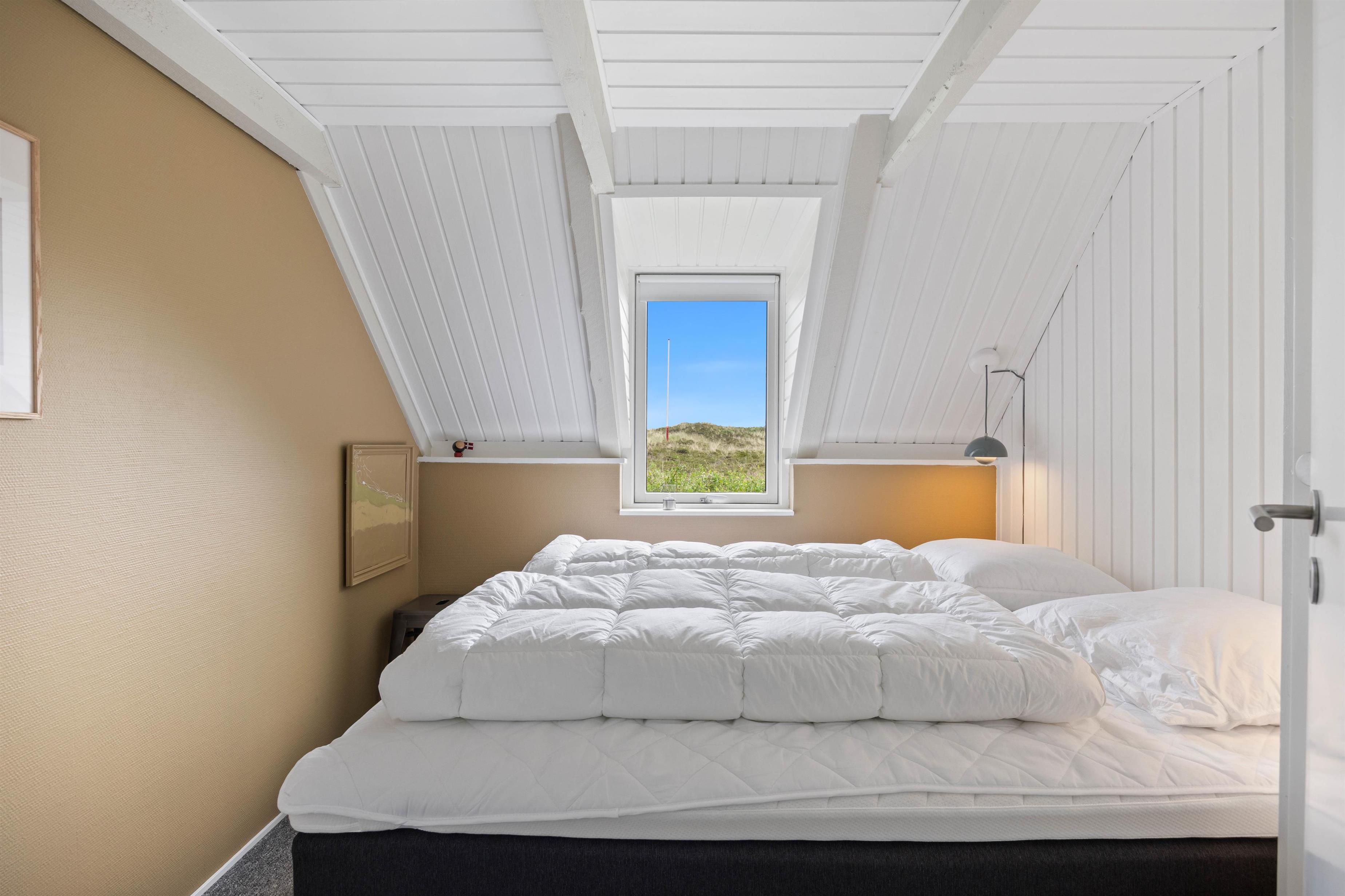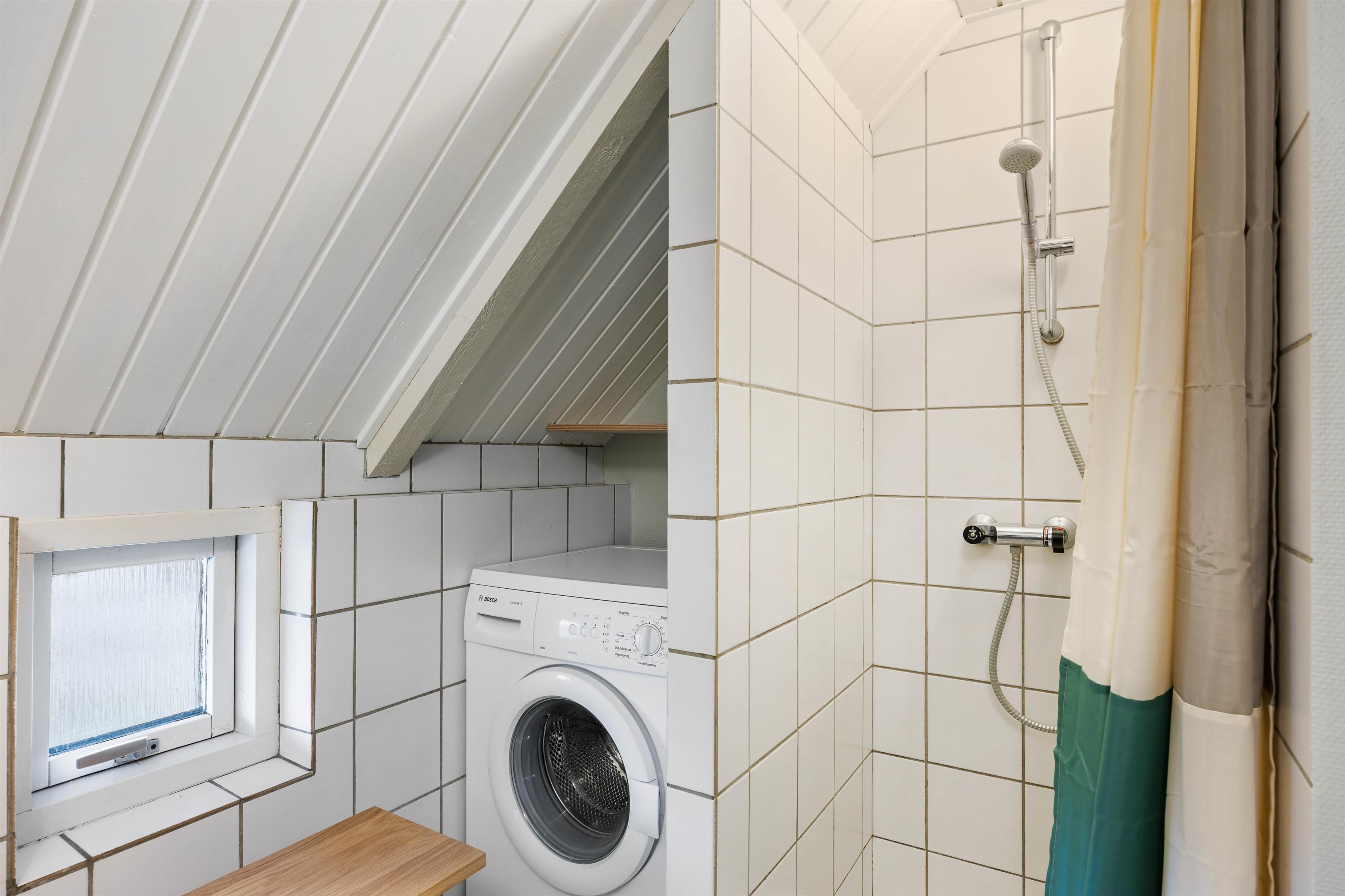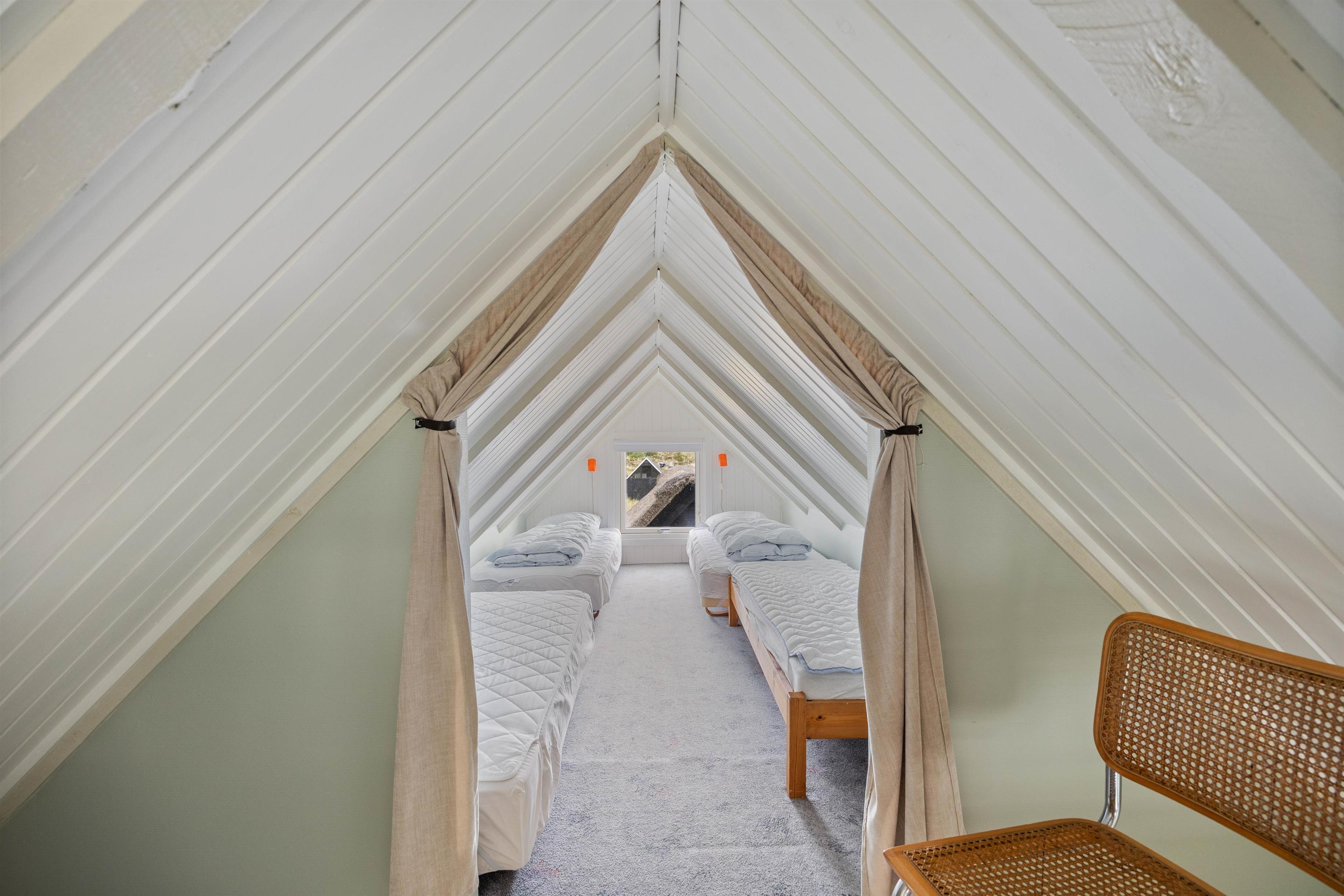 Trappen i stuen fører jer op på den store hems, hvor der er rigeligt med sovepladser. I stueetagen findes der to lukkede soveværelser samt det fine badeværelse med brus og gulvvarme. Praktisk har I også en vaskemaskine, så badehåndklæderne kan blive vasket under ferien.
