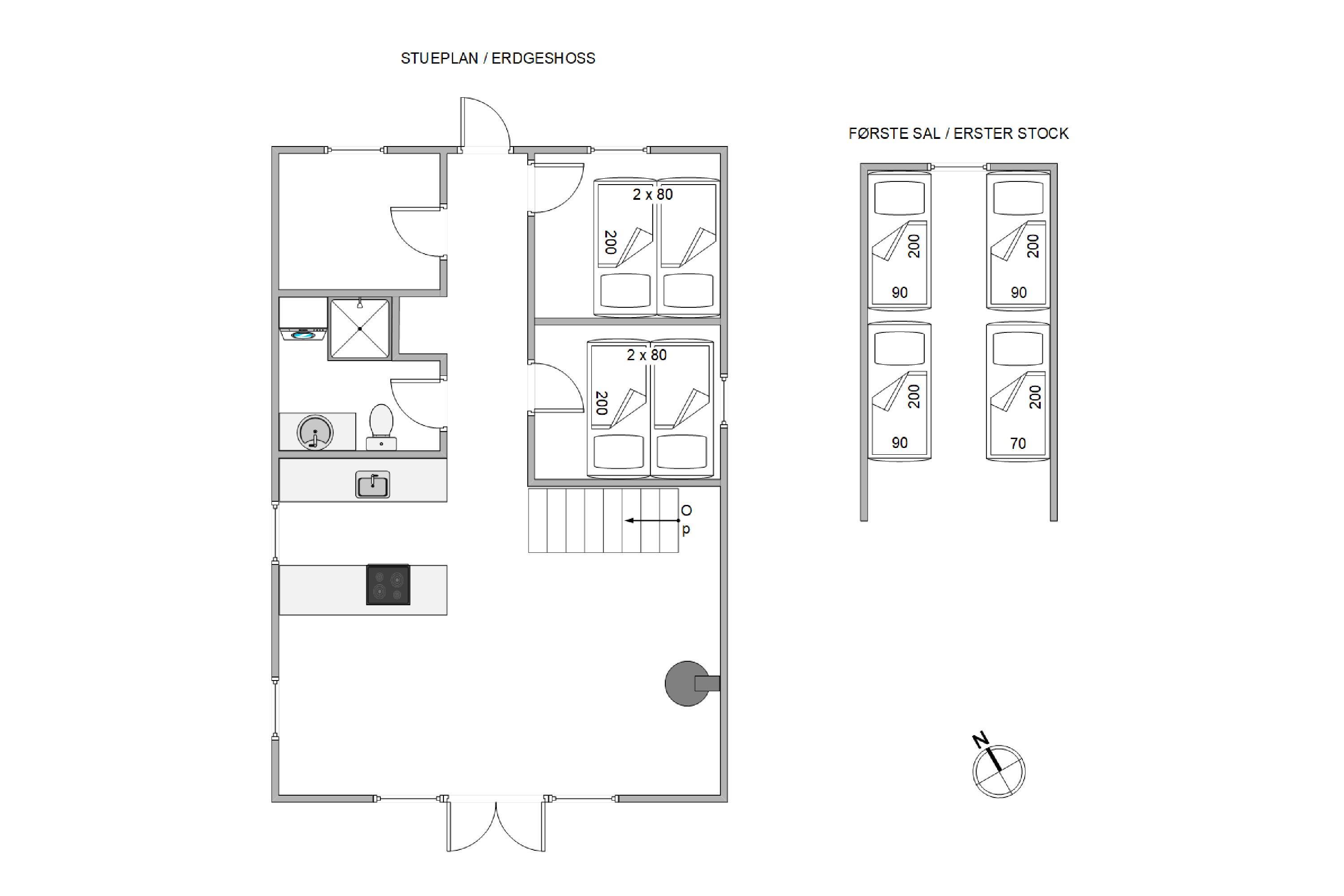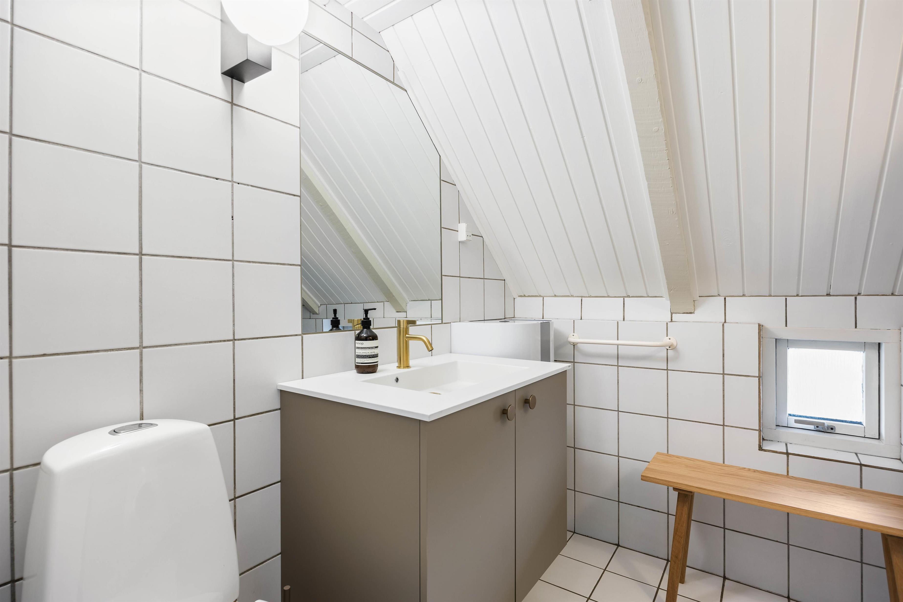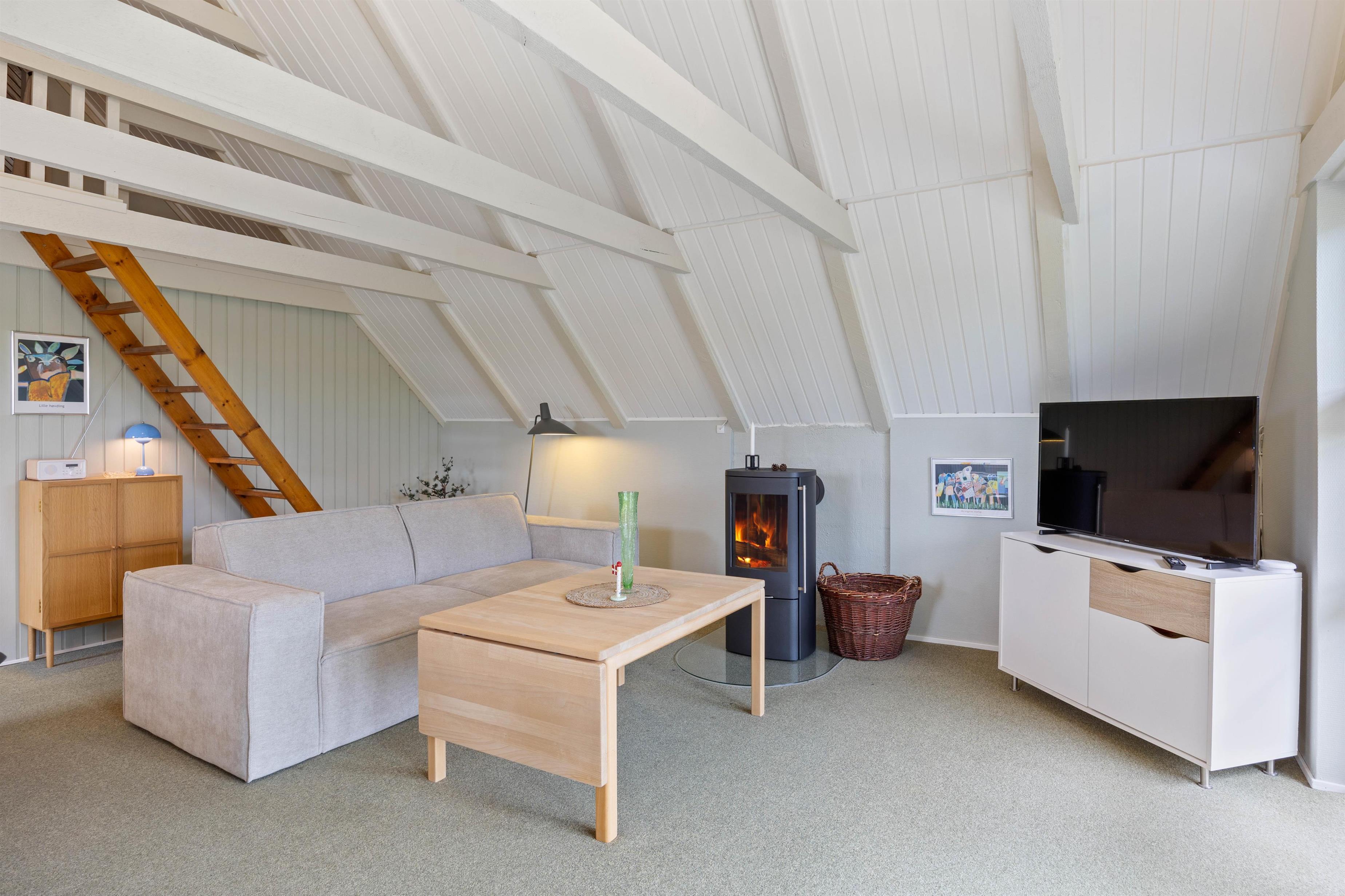 Trappen i stuen fører jer op på den store hems, hvor der er rigeligt med sovepladser. I stueetagen findes der to lukkede soveværelser samt det fine badeværelse med brus og gulvvarme. Praktisk har I også en vaskemaskine, så badehåndklæderne kan blive vasket under ferien.