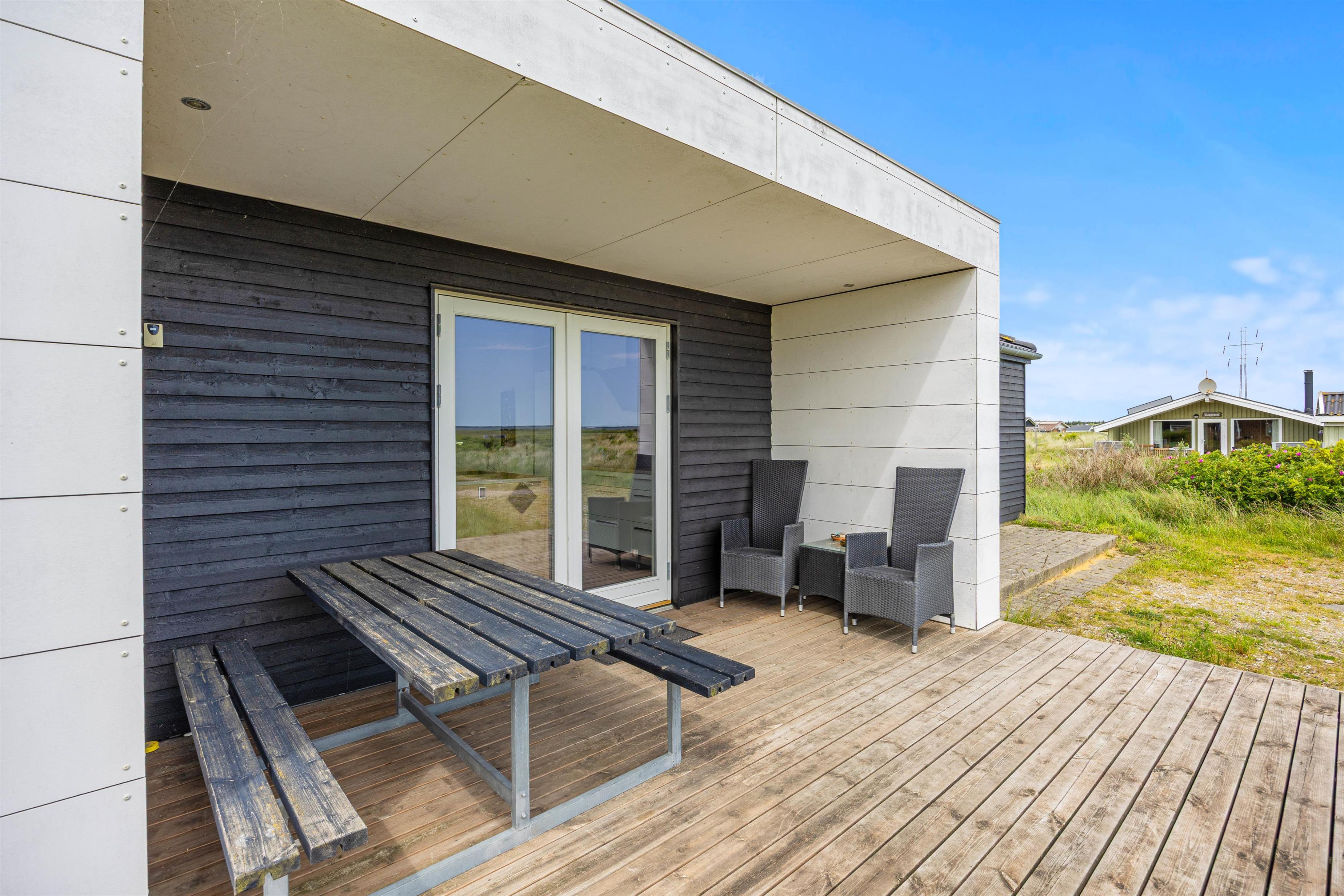 Der er terrasse på begge sider af huset, så I hele dagen kan følge solen og nyde de dejlige feriedage fra havemøblerne. Både den lille nordlige og den store sydvestvendte terrasse er delvist overdækket og afskærmet, så I til hver en tid kan finde ly og læ samtidig med, at I nyder den friske havluft.