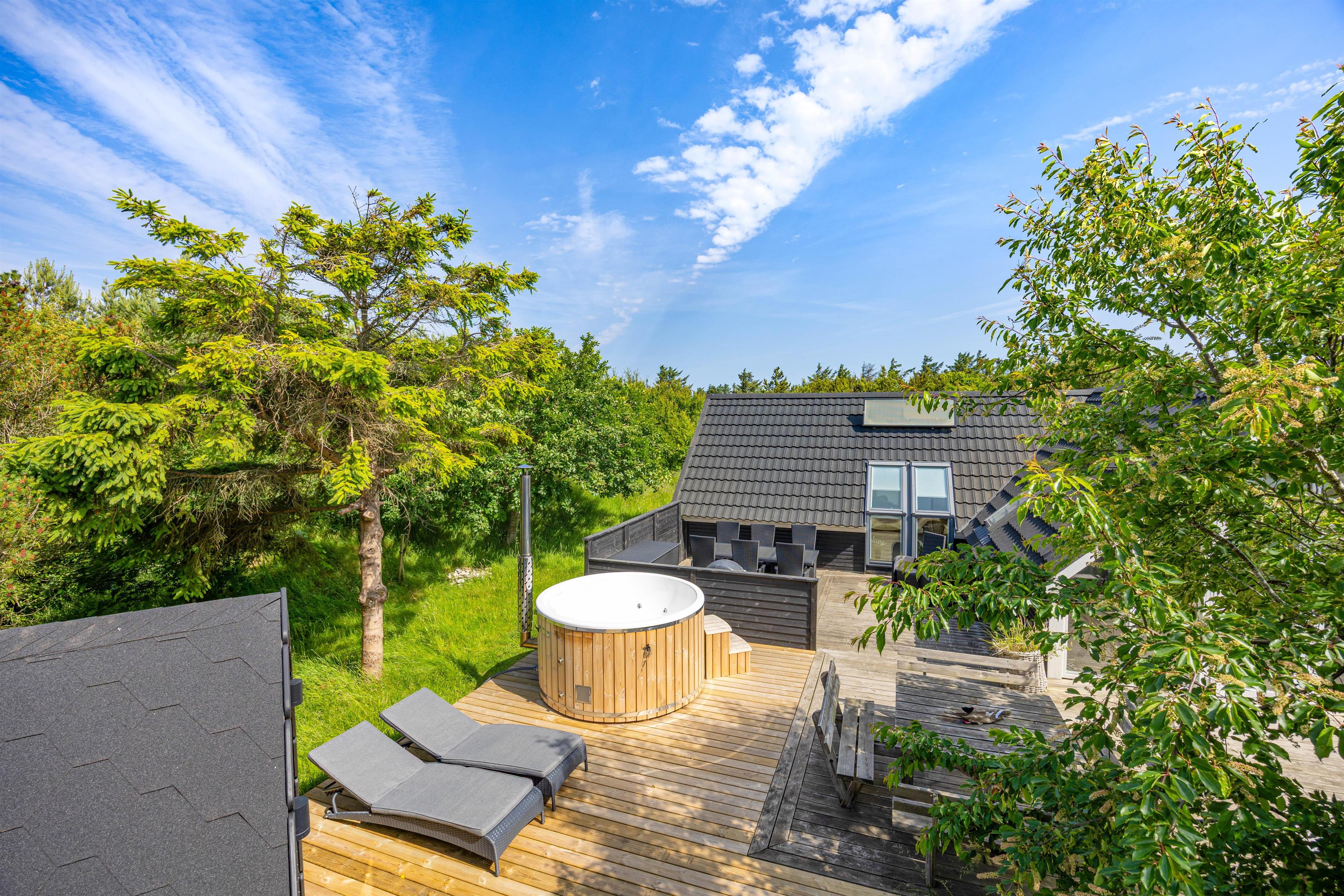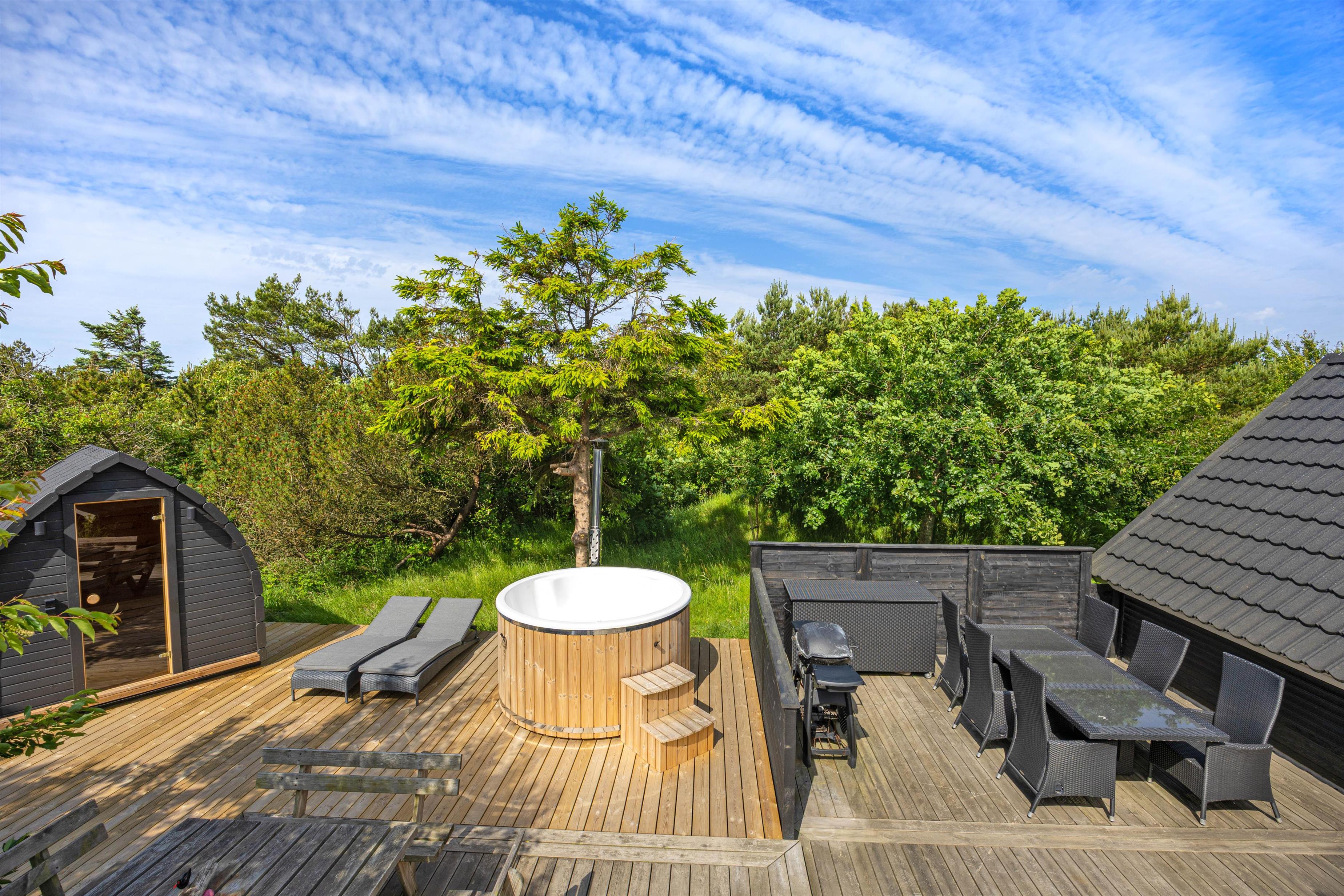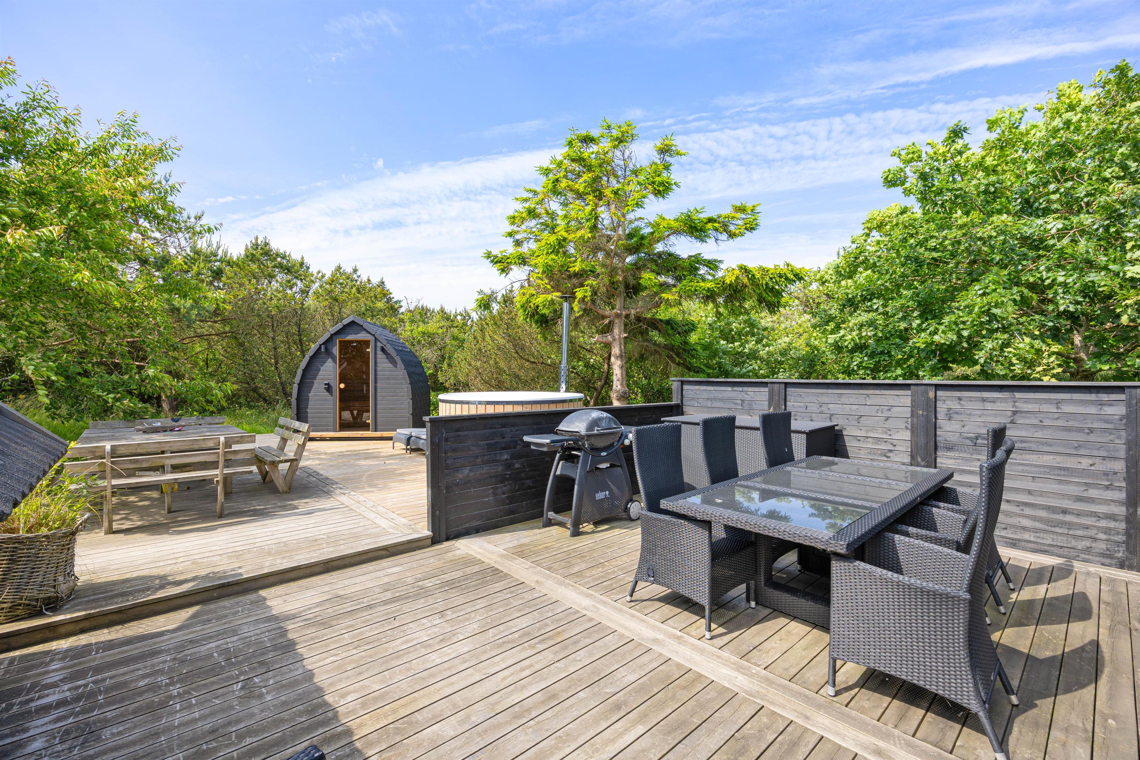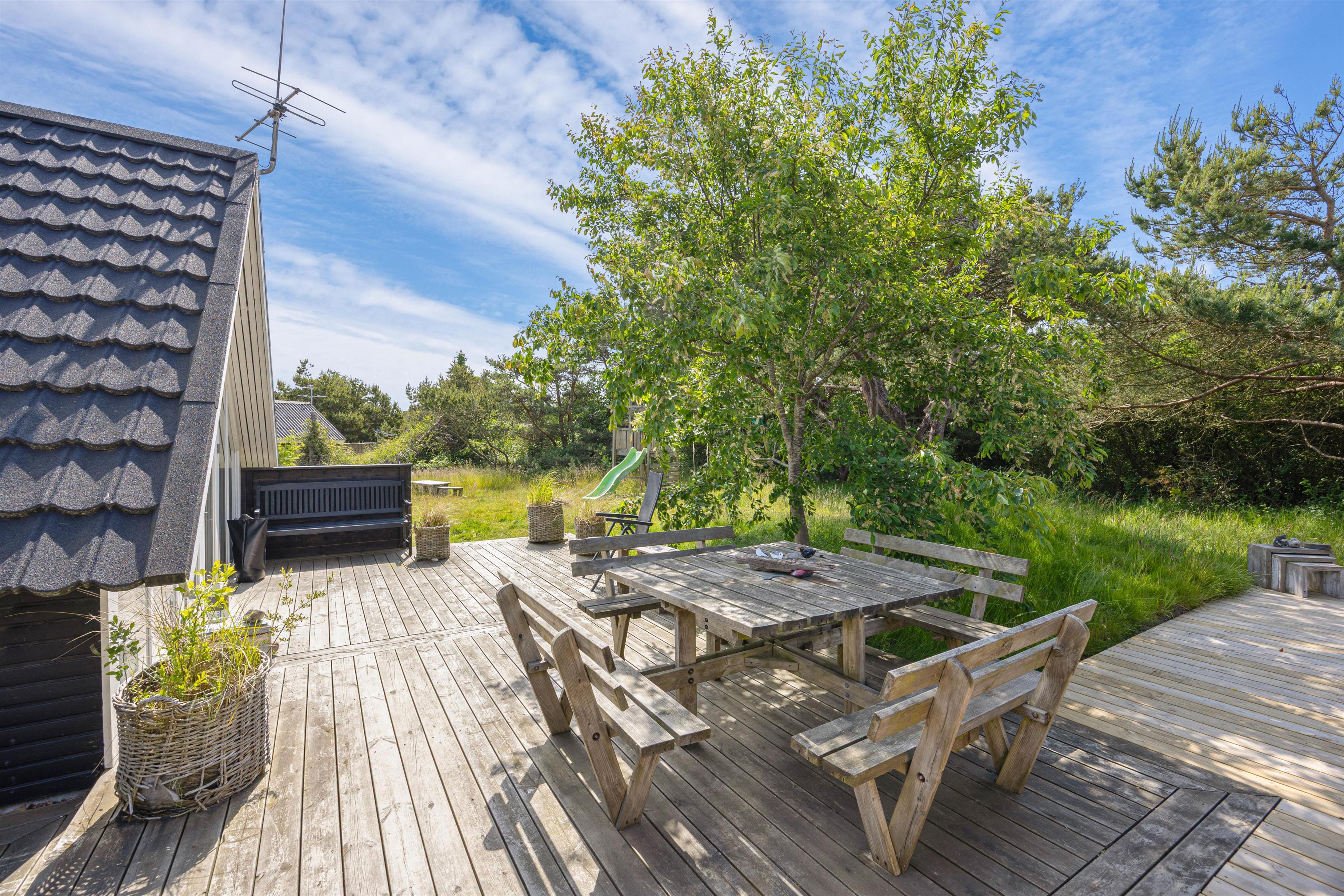 Udenfor fortsætter forkælelsen. Her kan I nyde solen på den åbne terrasse, hvor I også finder havemøbler, så der er rig mulighed for at spise ude og nyde de lange sommeraftener. Terrassen er delvist afskærmet, så I har masser af privatliv, og børnene og hunden kan lege på den store naturgrund eller tage en tur på gyngen.