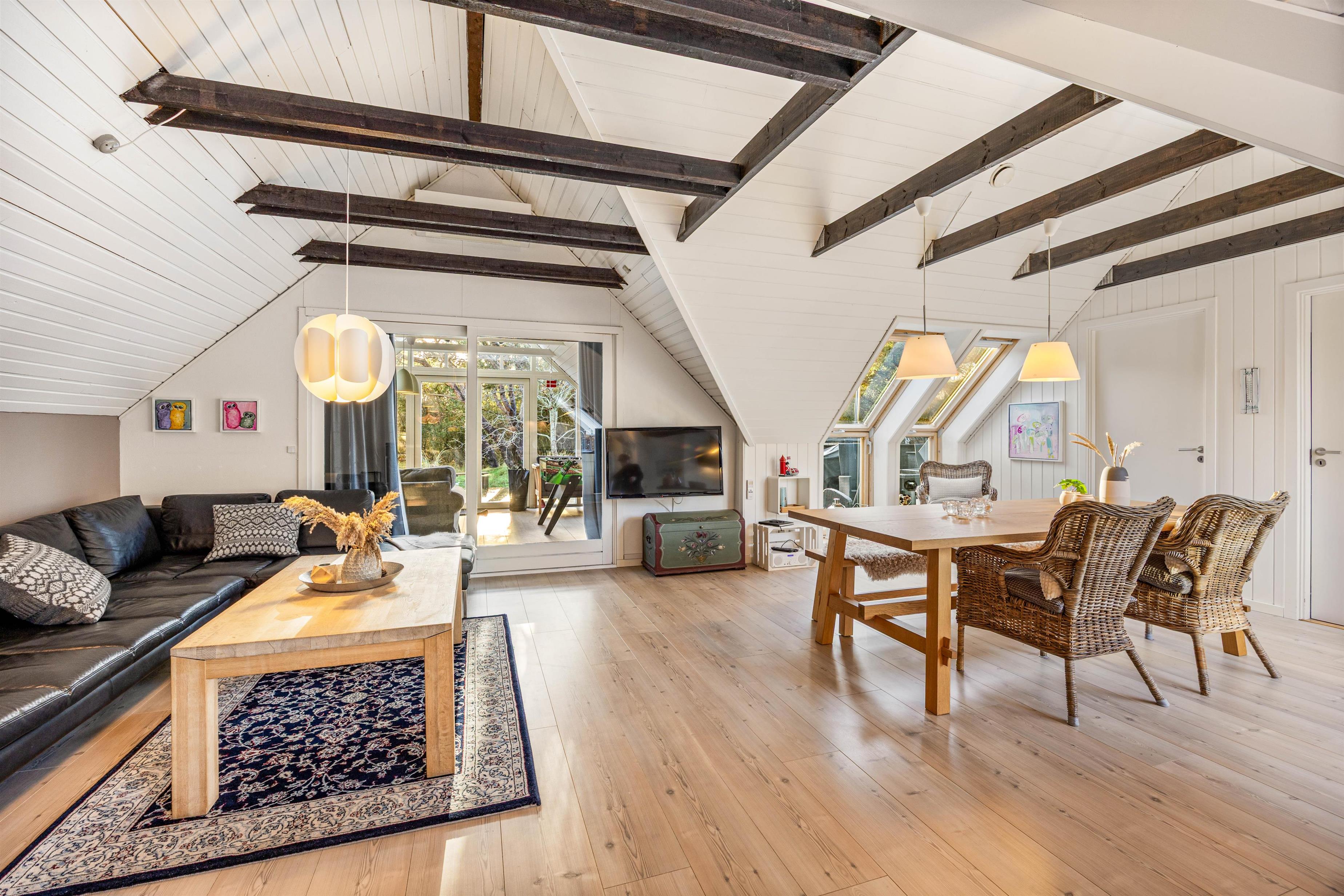 Indenfor i sommerhuset bliver I mødt af en lys og imødekommende atmosfære. Stuen, som er i åben forbindelse med køkkenet, byder på dejlige siddepladser og en skøn brændeovn, der skaber en hyggelig stemning, uanset om det er sommer eller vinter. Køkkenet er moderne og veludstyret, inklusive en opvaskemaskine, så I slipper for opvasken i ferien.