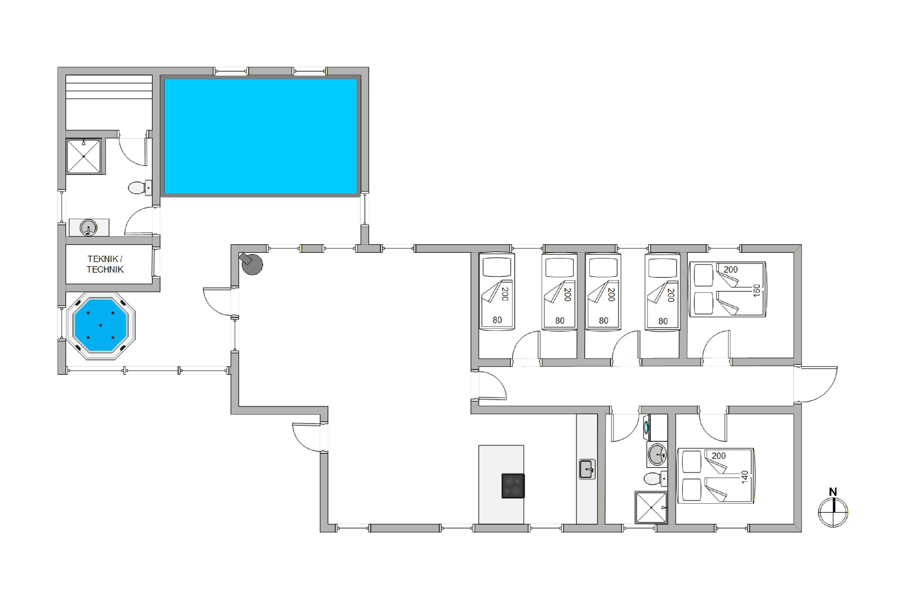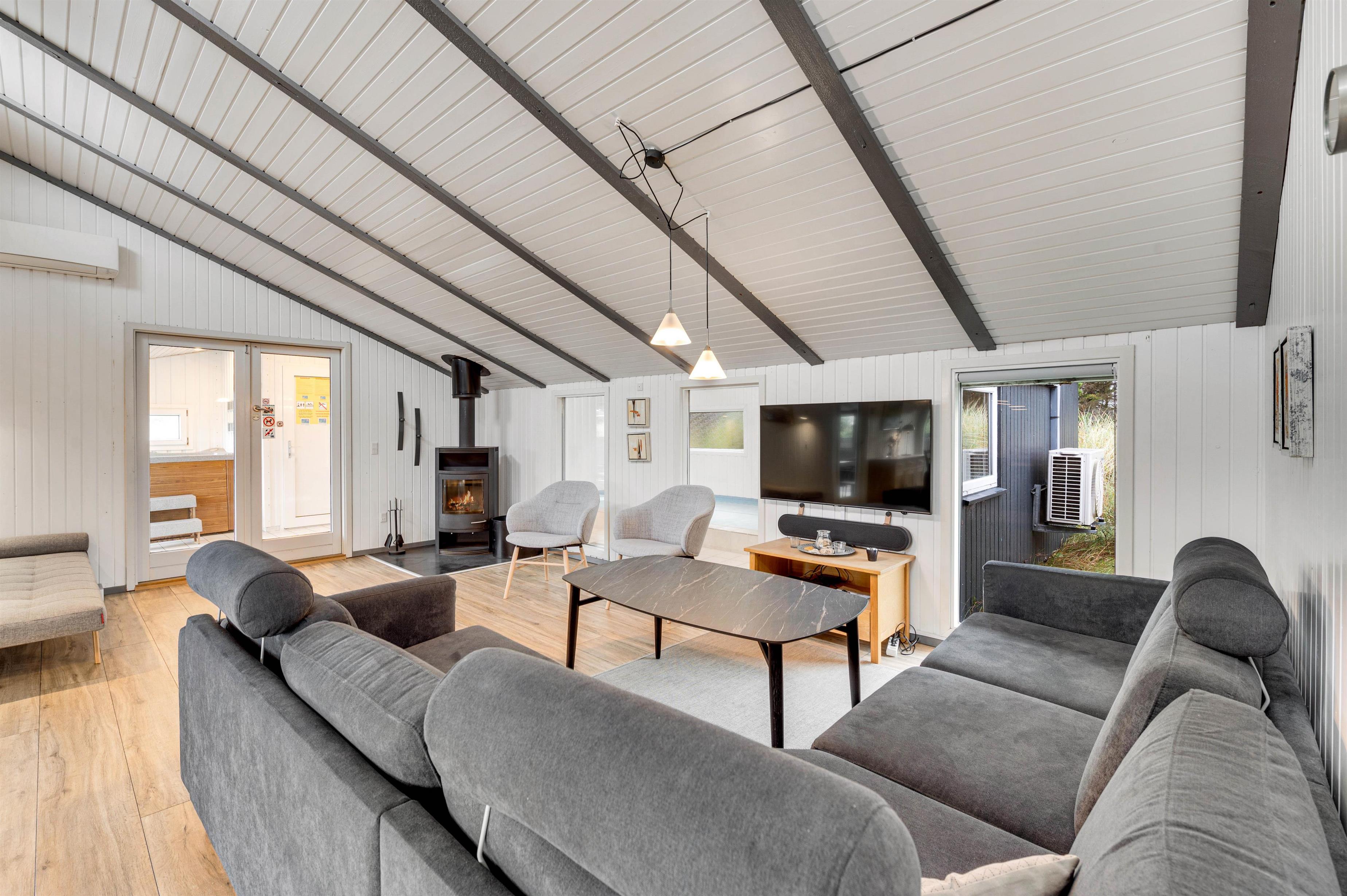 Huset har en stor dejlig opvarmet swimmingpool der indbyder til sjov og leg for hele familien. Her er de perfekte rammer for timevis af sjov i swimmingpoolen, og husets store 5 personers opvarmede spabad er et hit efter lange spadsereture eller hvis man bare ønsker total afslapning i dejlige varme vand. I poolrummet er der også installeret en luft til vand varmepumpe, som sørger for en energivenlig opvarmning af poolrummet. Derudover er der også 2 energibesparende luft til lift varmepumper.