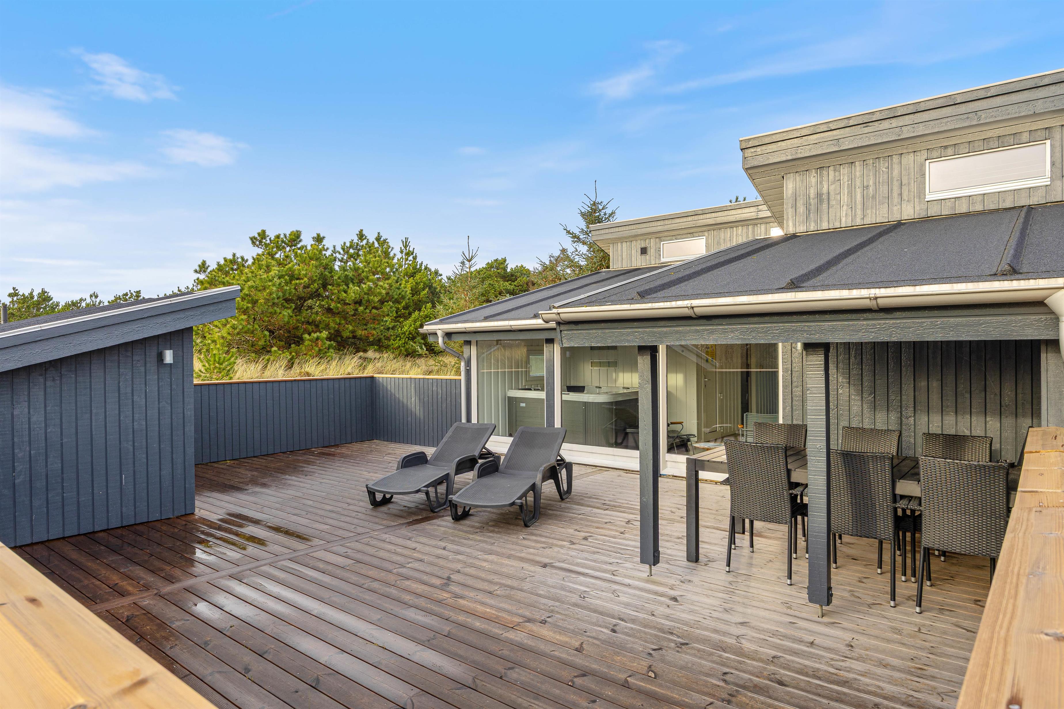 Rundt om huset findes flere gode terrasser, helt lukkede , så hund og børn ikke kommer på afveje. Nyd solen på alle tider af dagen, og om aftenen er den overdækkede terrasse det perfekte samlingspunkt når grillen tændes.