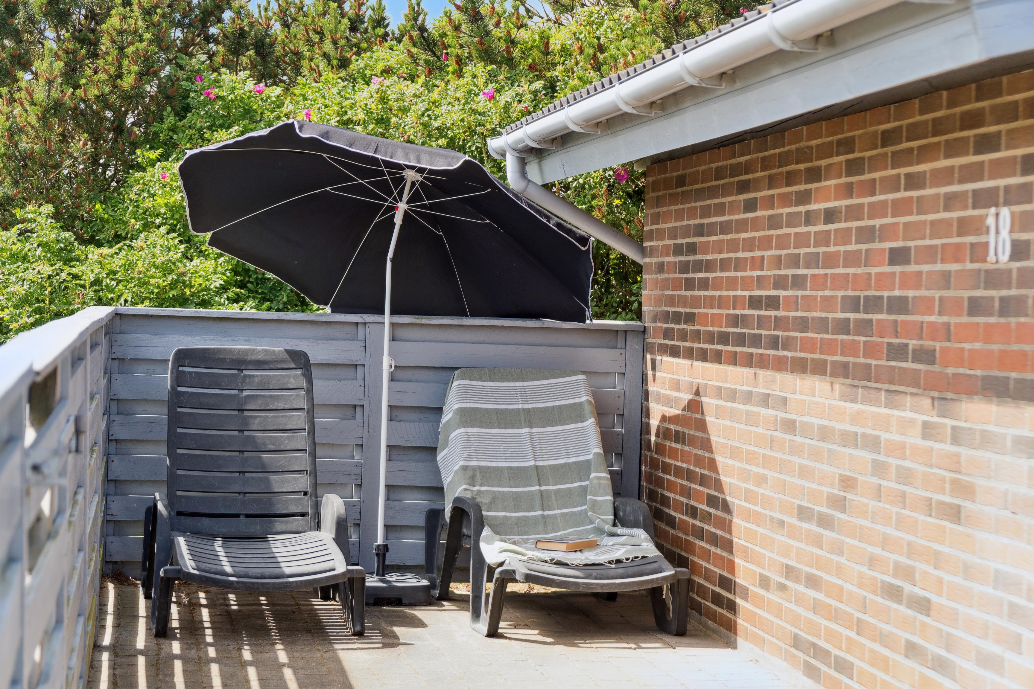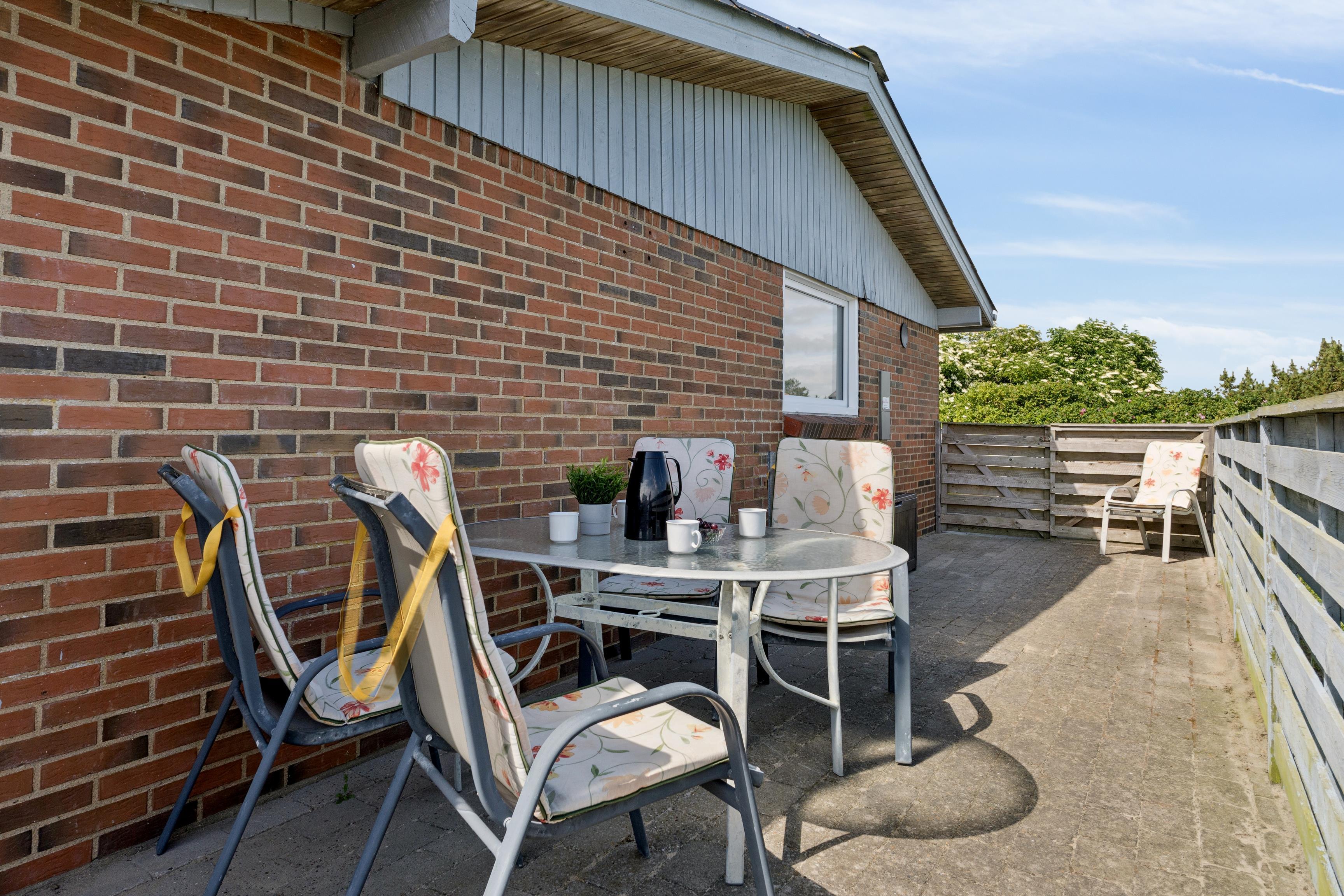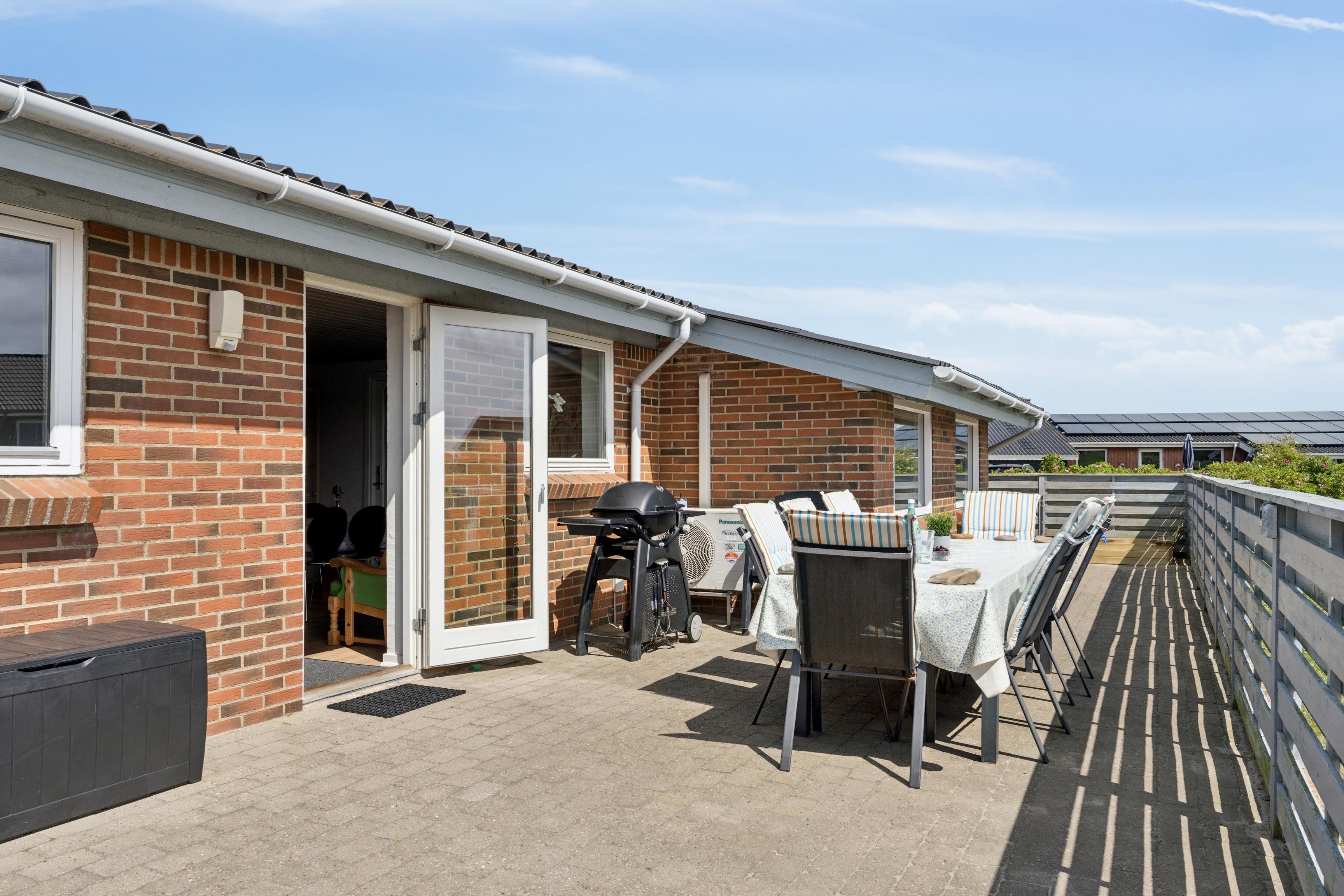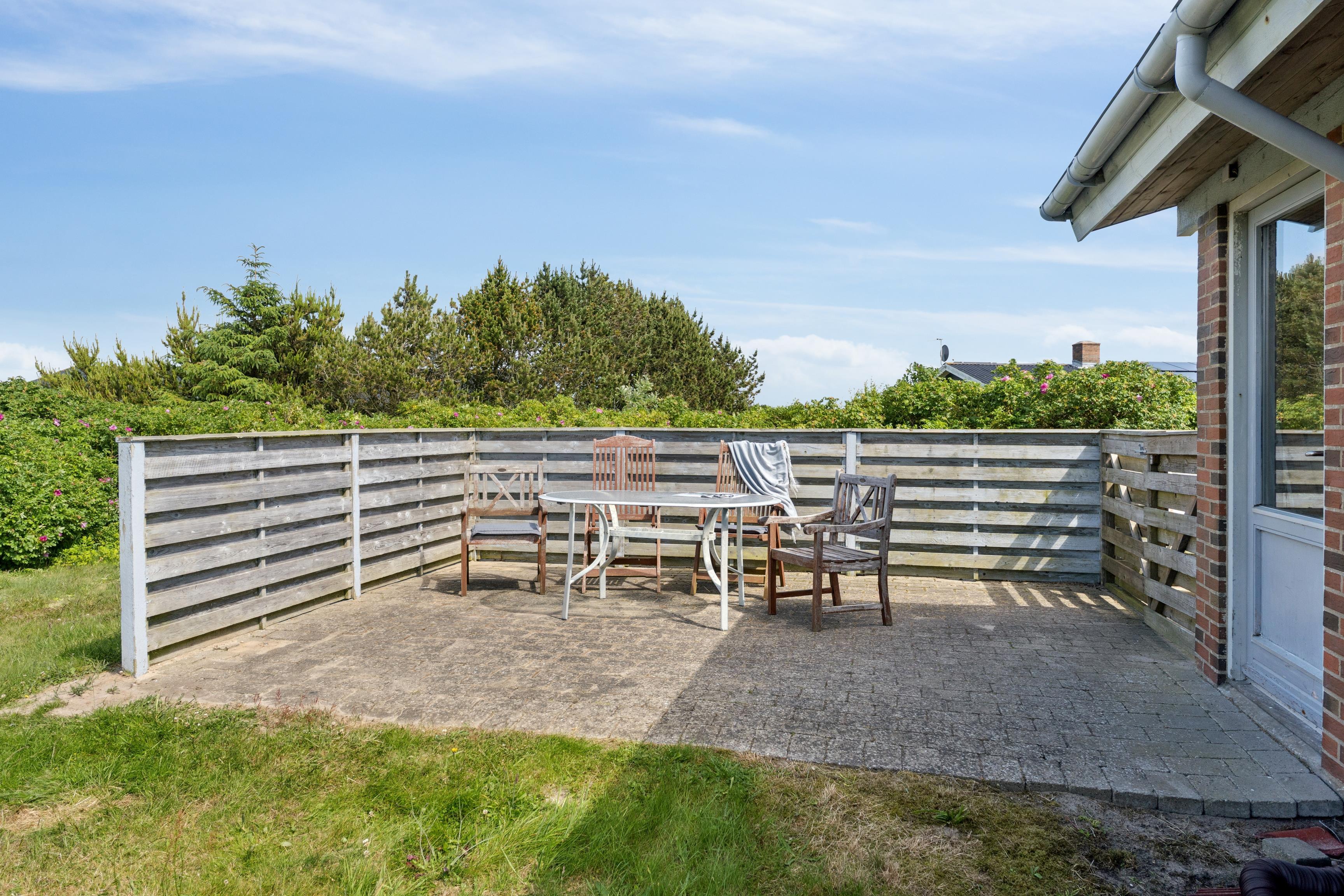 Sommerhuset har en stor skøn sydvendt terrasse, der er lukket, så børn og hunde kan rende frit. Terrassen fører også rundt om huset mod øst, hvor solen står op udover fjorden. Mod vest er der en lille terrasse omgivet af træer.