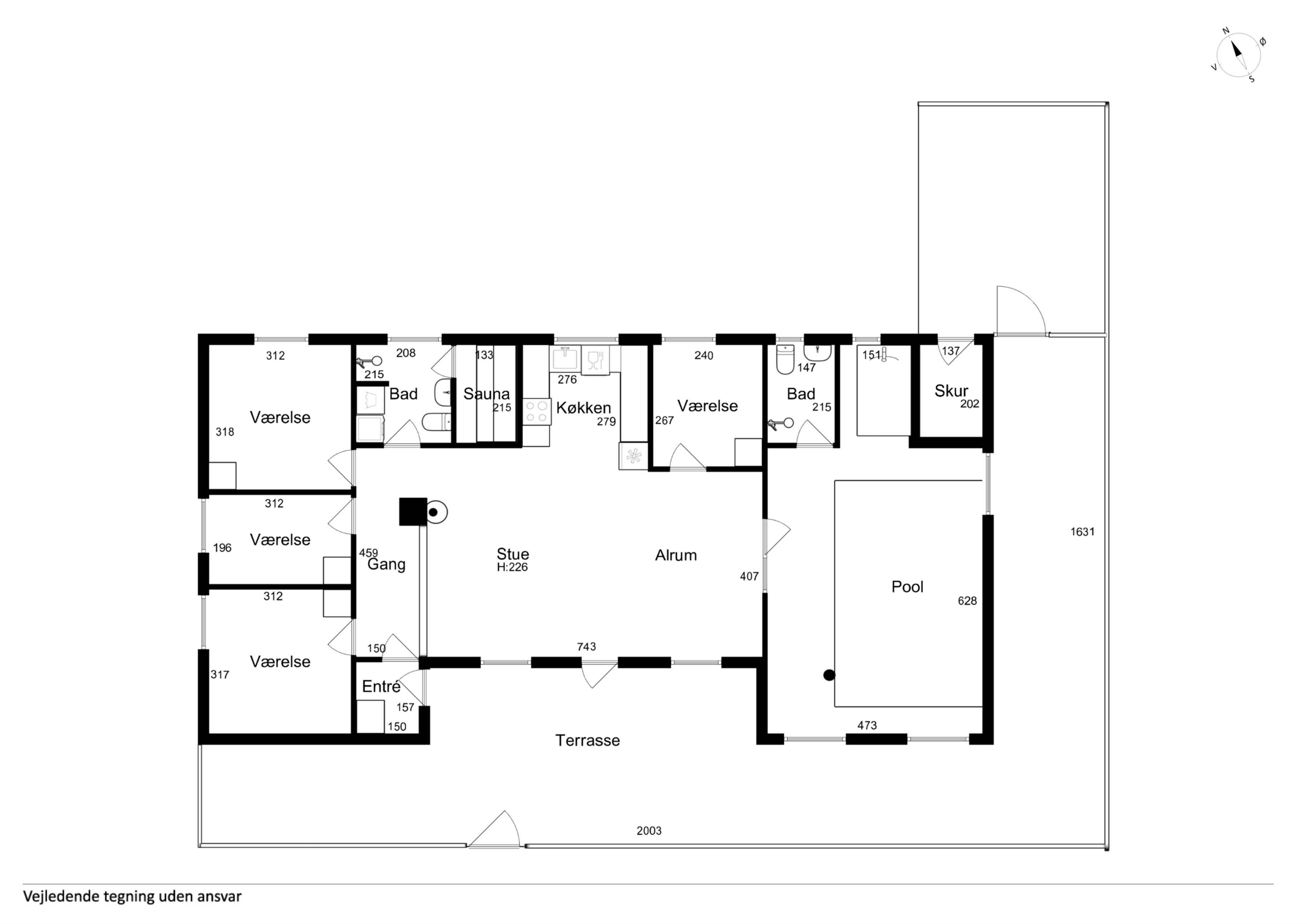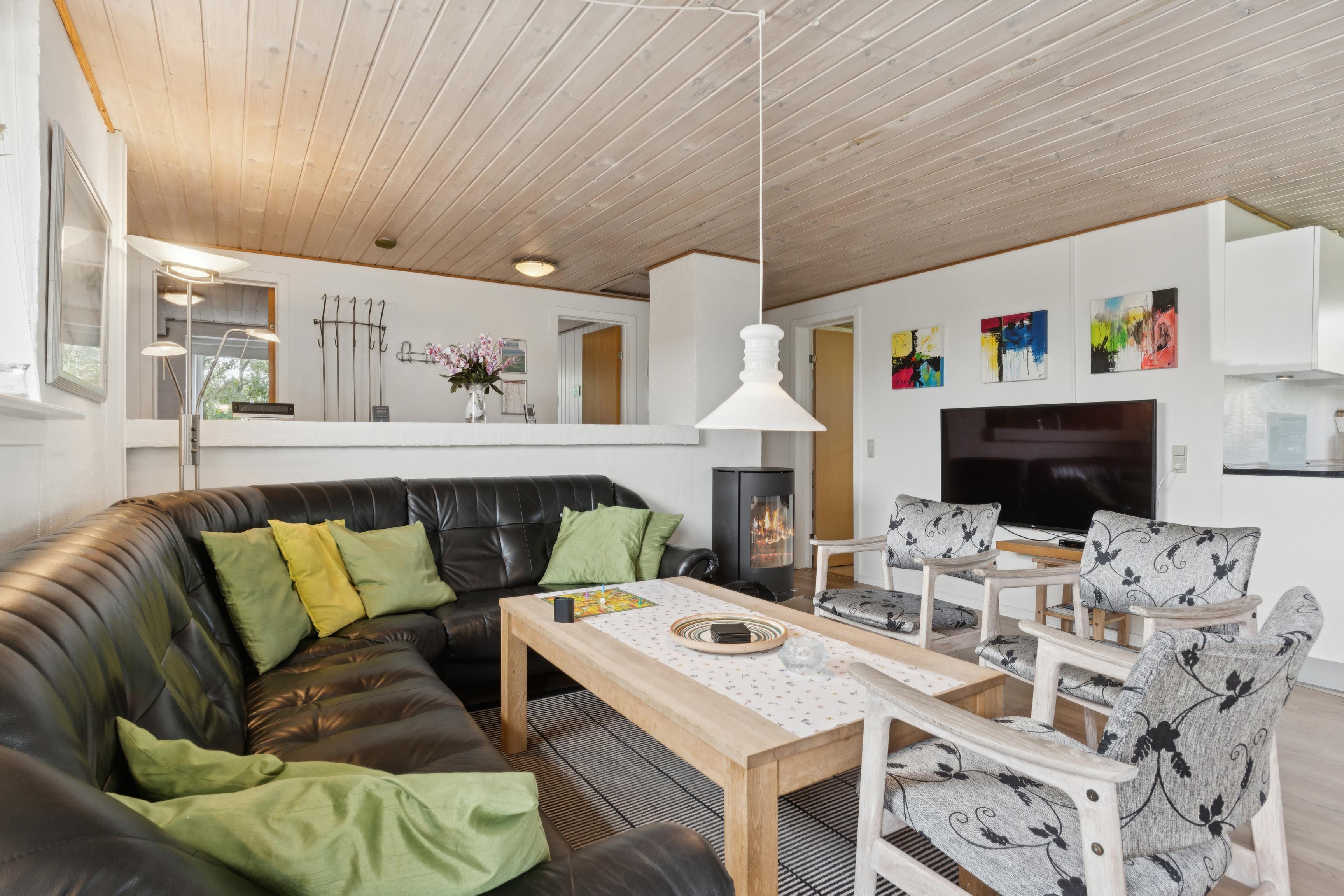 Husets hjerte er det lyse opholdsrum med åben køkken sammen med den hyggelige stue. Her er brændeovn, et stort 65" Smart-TV med Chromecast samt både DR1 og TV2. Fra stuen er der direkte udgang til den store sydvendte lukkede terrasse med gasgrill – perfekt til aftensmad under åben himmel. Fra stuen er der også direkte adgang til husets wellnessafdeling med swimmingpool, spabad og sauna – ideel til afslapning og sjov for hele familien, uanset årstid.
