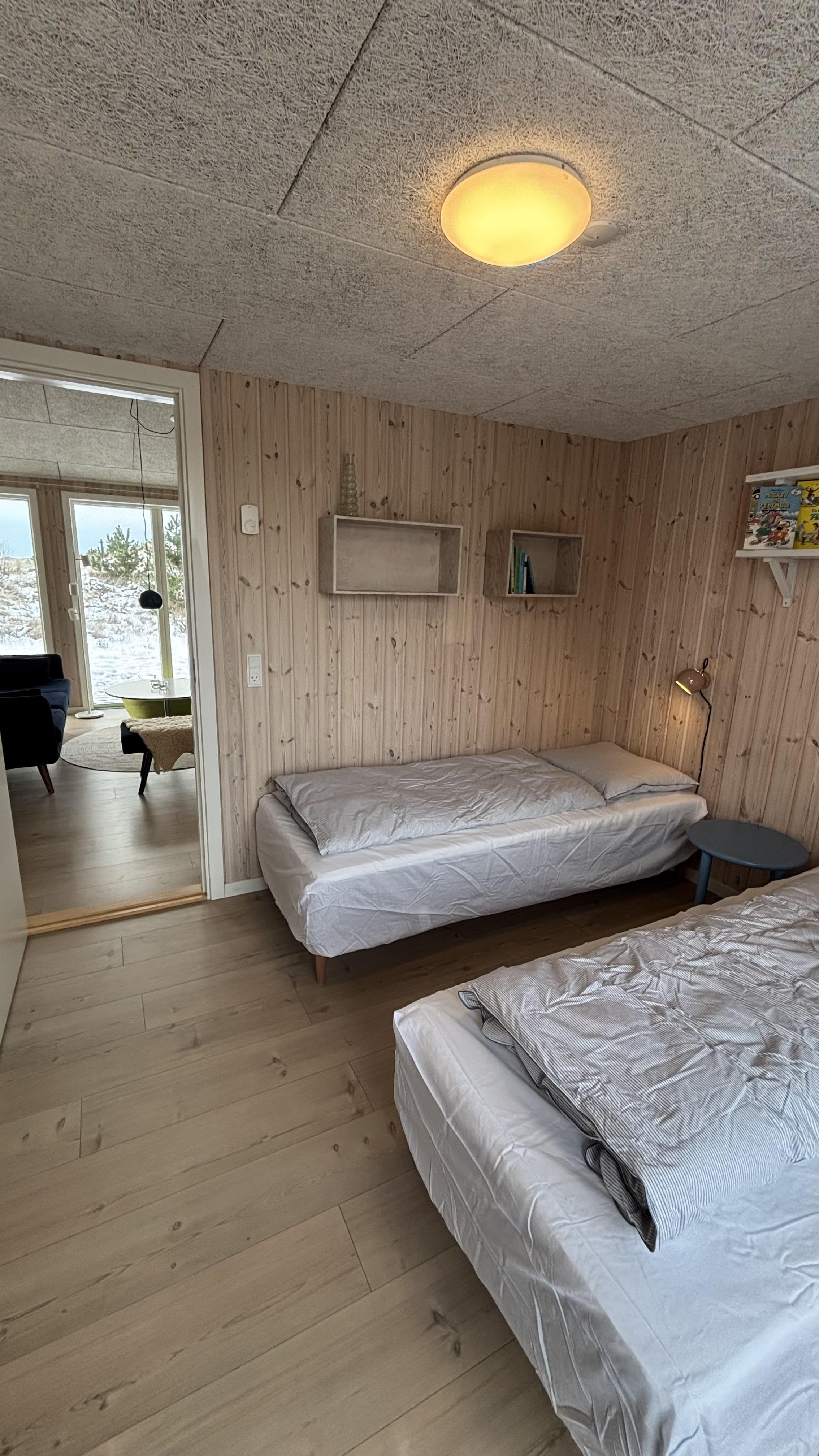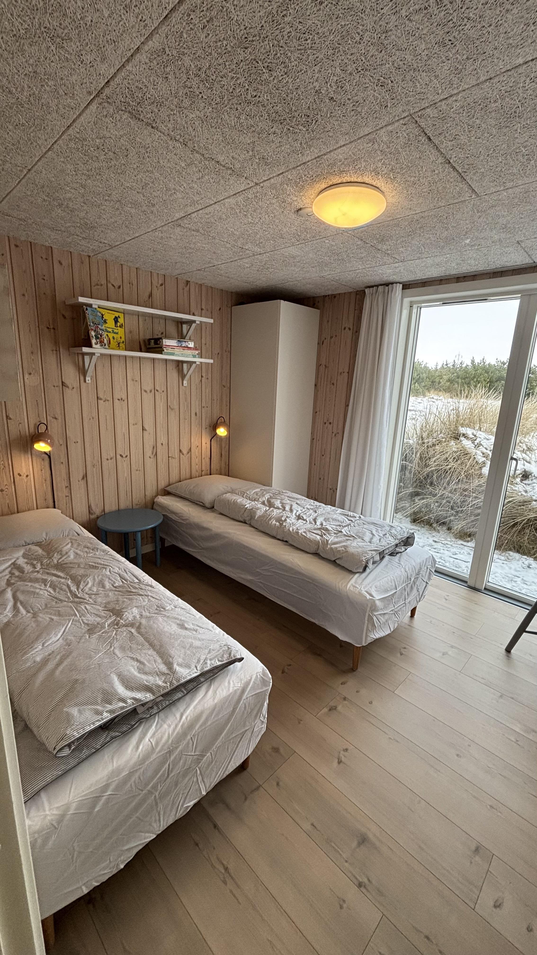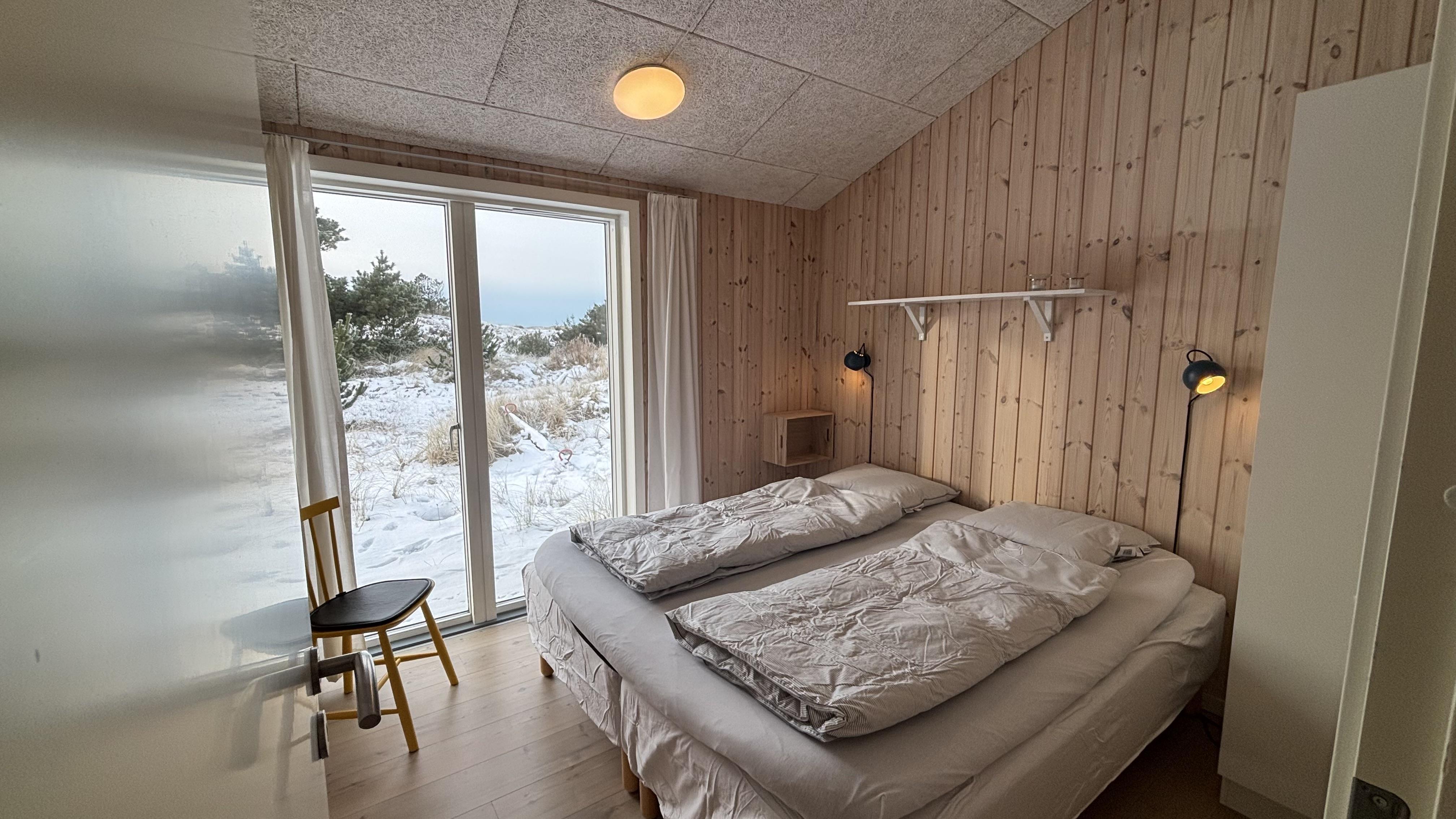 Tre soveværelser med dobbeltsenge og to badeværelser med bruser – det ene med adgang til en dejlig sauna – fuldender udstyret. Udenfor kan I nyde jeres ferie på den store terrasse, der går hele vejen rundt om huset. En del af terrassen er overdækket, så I også kan opholde jer udendørs og spise sammen, selv når vejret er omskifteligt.