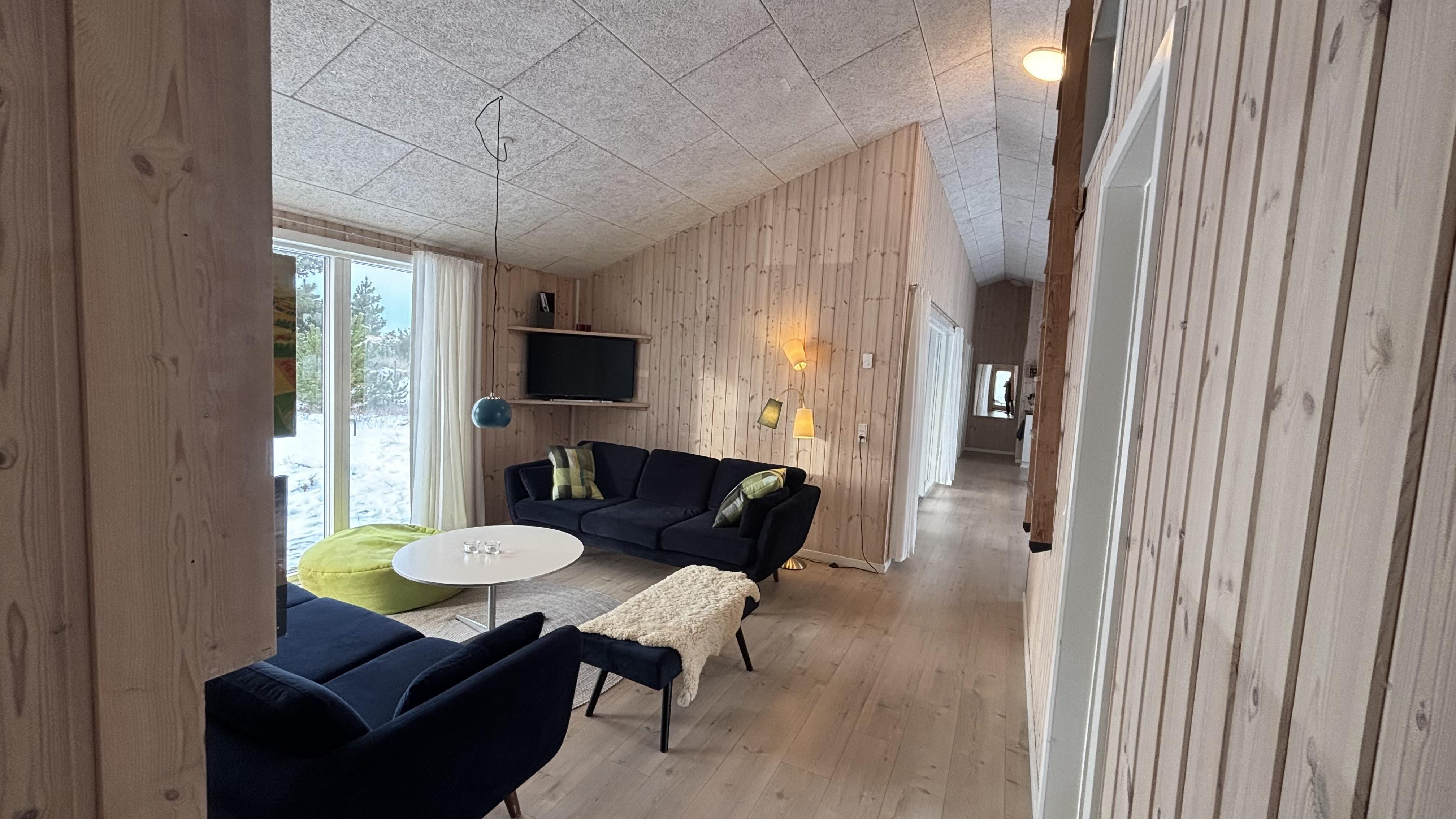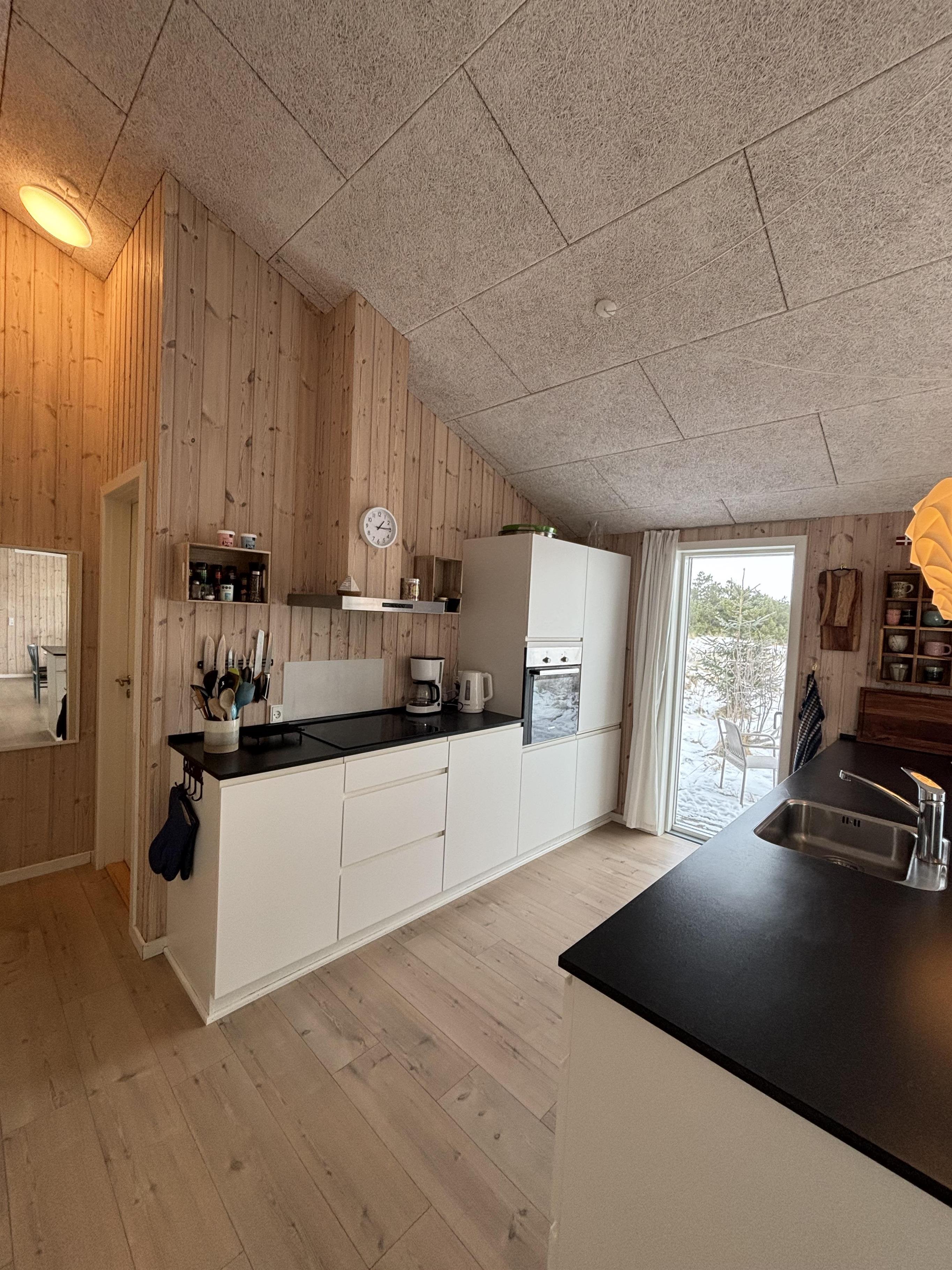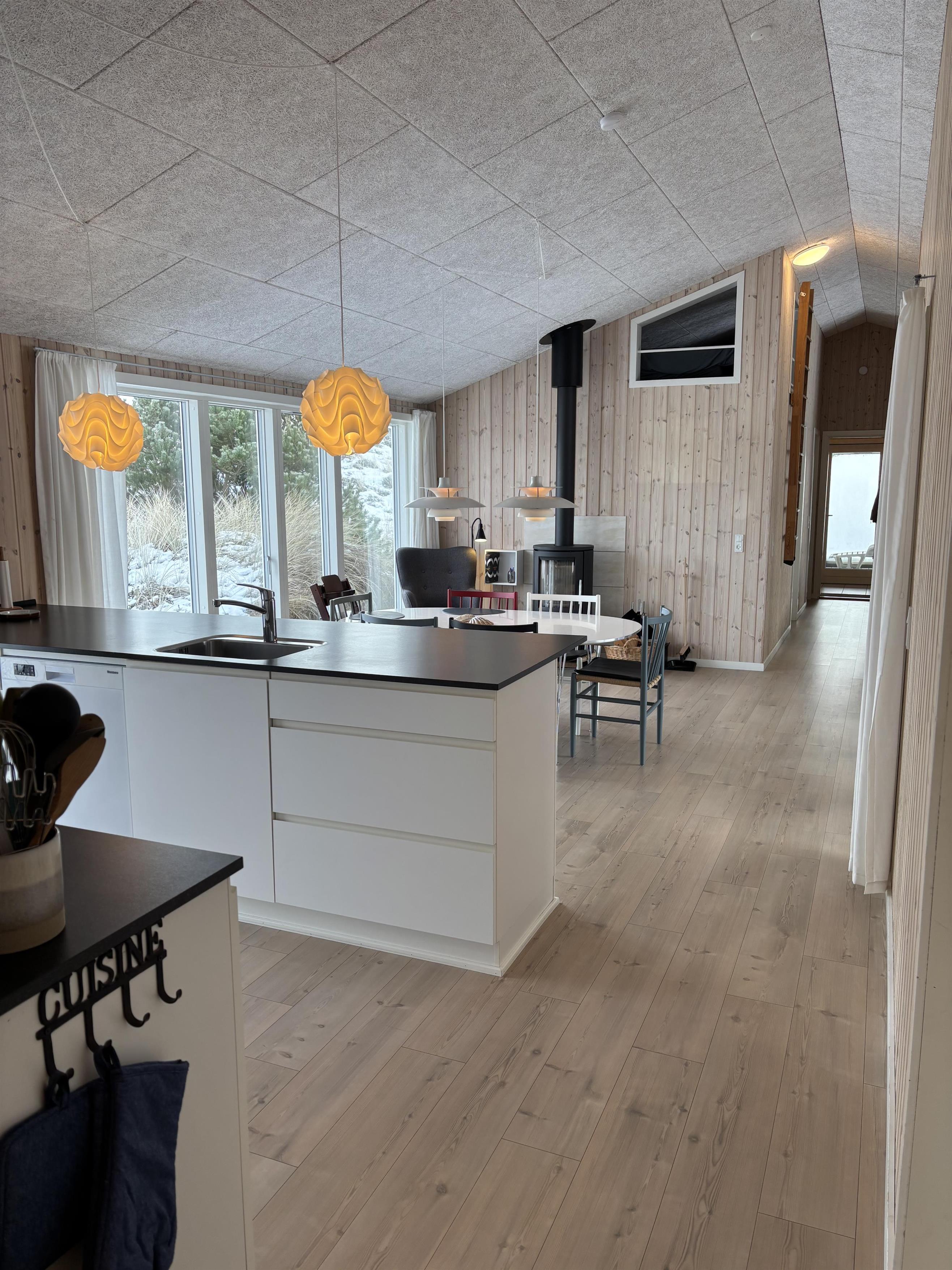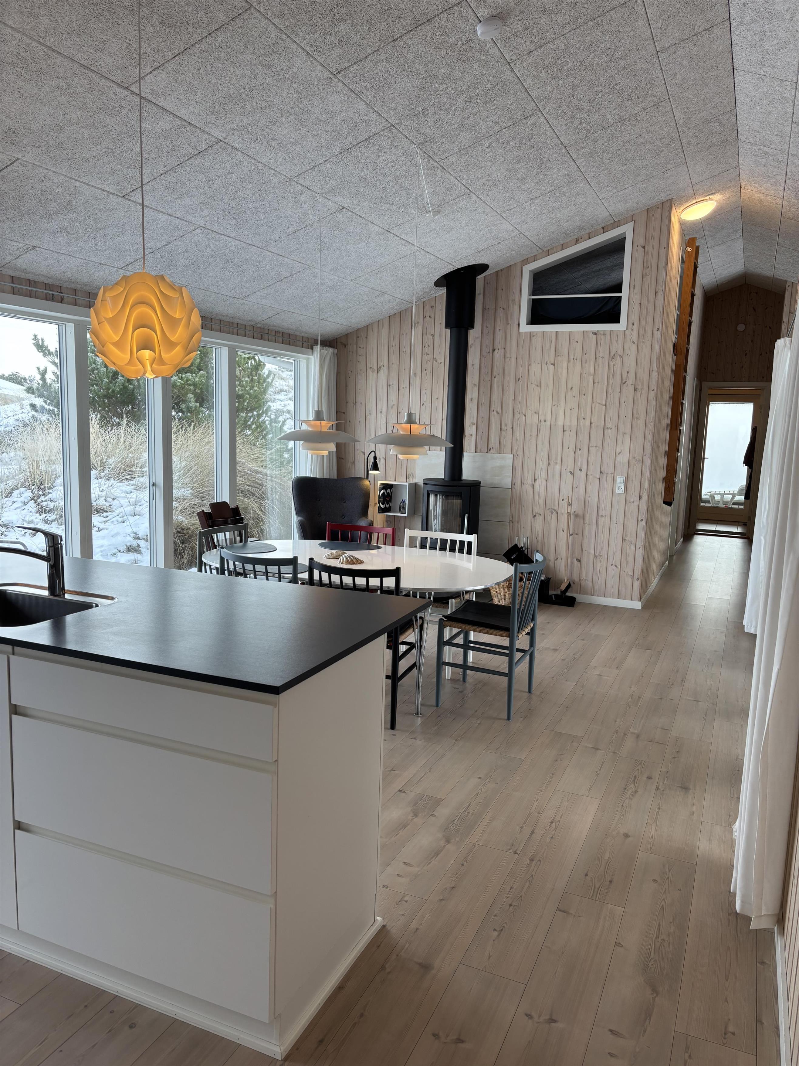 Indrettet i en charmerende, hyggelig retrostil og med smagfulde møbler kan I nyde en fantastisk tid her. De dybe, store vinduer på begge sider af feriehuset lukker meget lys ind og skaber dermed en lys og venlig atmosfære. Køkkenet er forbundet med den åbne stue, hvor en brændeovn sørger for en hyggelig stemning på kølige aftener. En energibesparende varmepumpe og gulvvarme i hele huset sørger også for en behagelig stuetemperatur.
