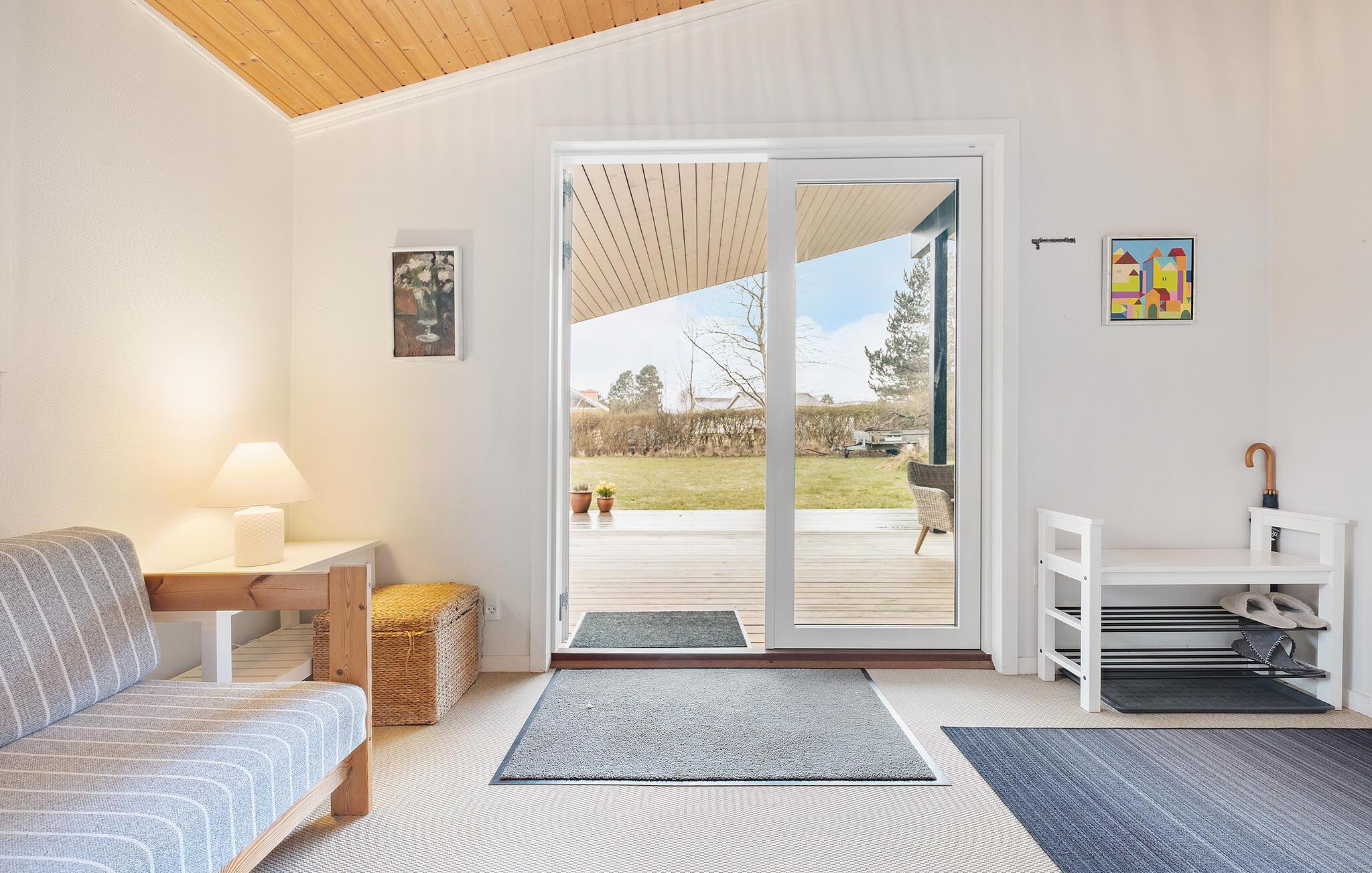 Sommerhuset ligger på en naturgrund med store græsplæner, hvor børnene har masser af plads til at lege og være aktive, og jeres hund kan boltre sig. Den åbne, overdækkede terrasse er det perfekte sted at nyde de lange, lyse sommeraftener med et glas vin eller en kold drink i hånden. I er også meget velkomne til at benytte grillen, så I kan tilberede lækker grillmad.