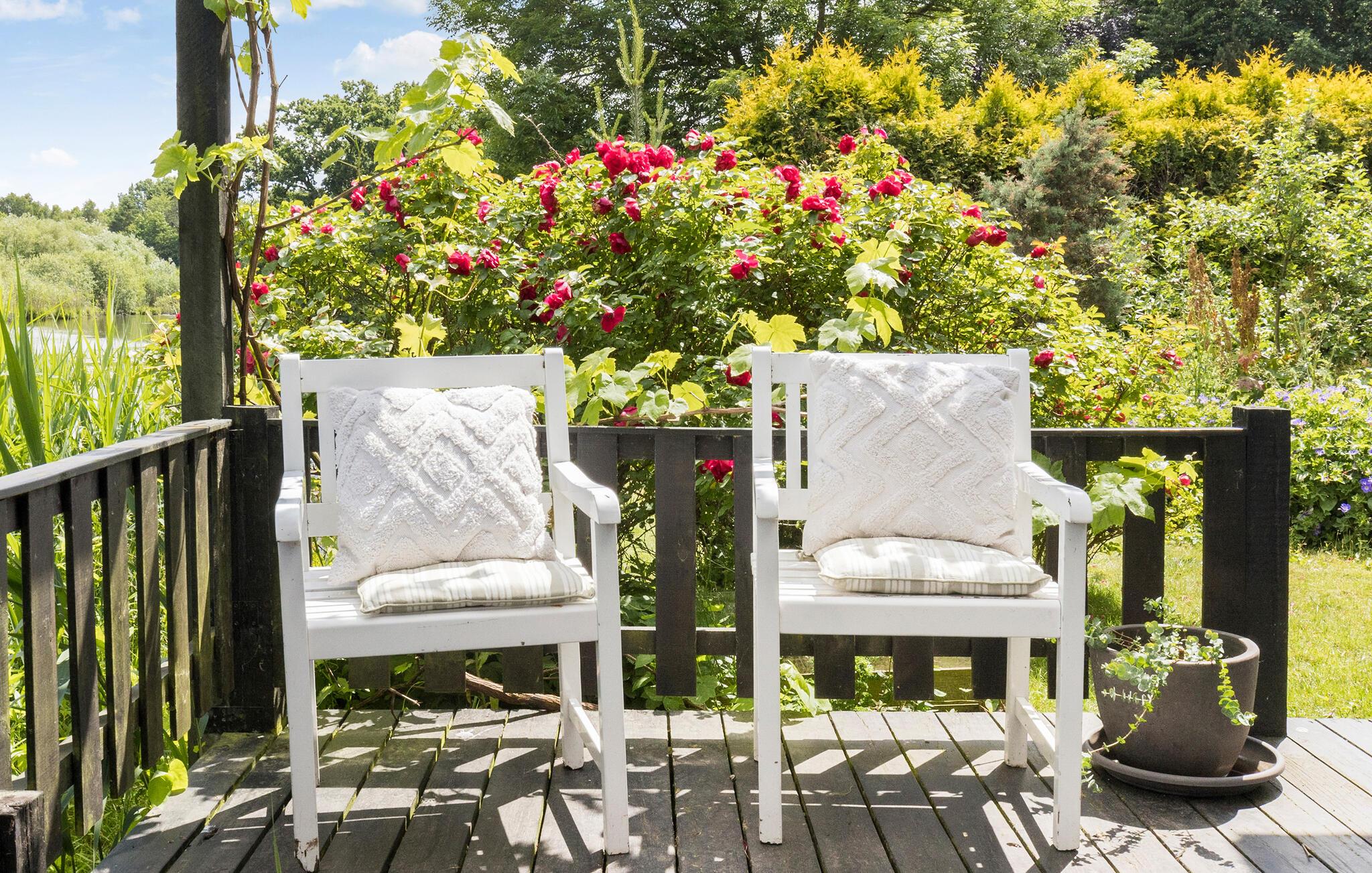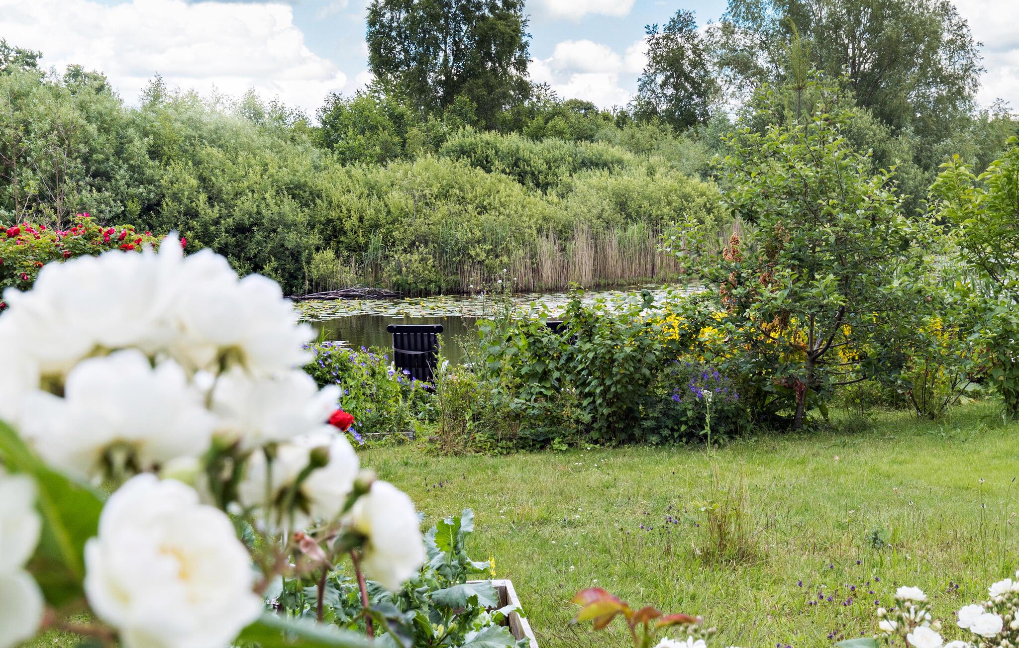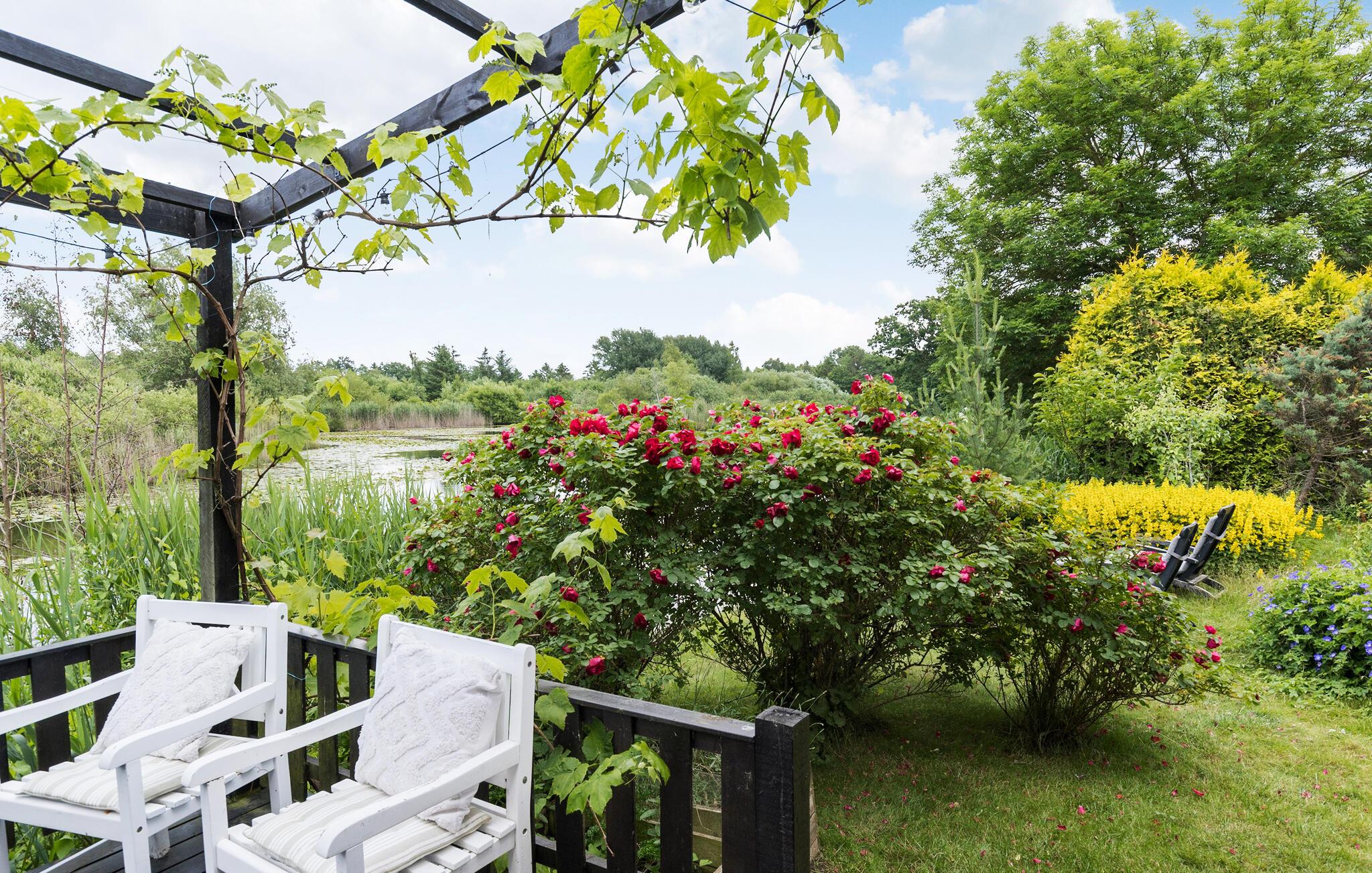 På de lune sommerdage kan I dække op til en dejlig grillmiddag på verandaen. Lad blikket vandre over den store have, mens I nyder den friske luft og den særlige ro. Der er god plads i haven til, at de små gæster kan løbe og lege. Noget helt igennem idyllisk ved dette hus er den lille sø lige ved siden af ??grunden. Sæt jer til rette ved vandet med en kop kaffe og nyd den friske luft og den smukke udsigt over vandet.