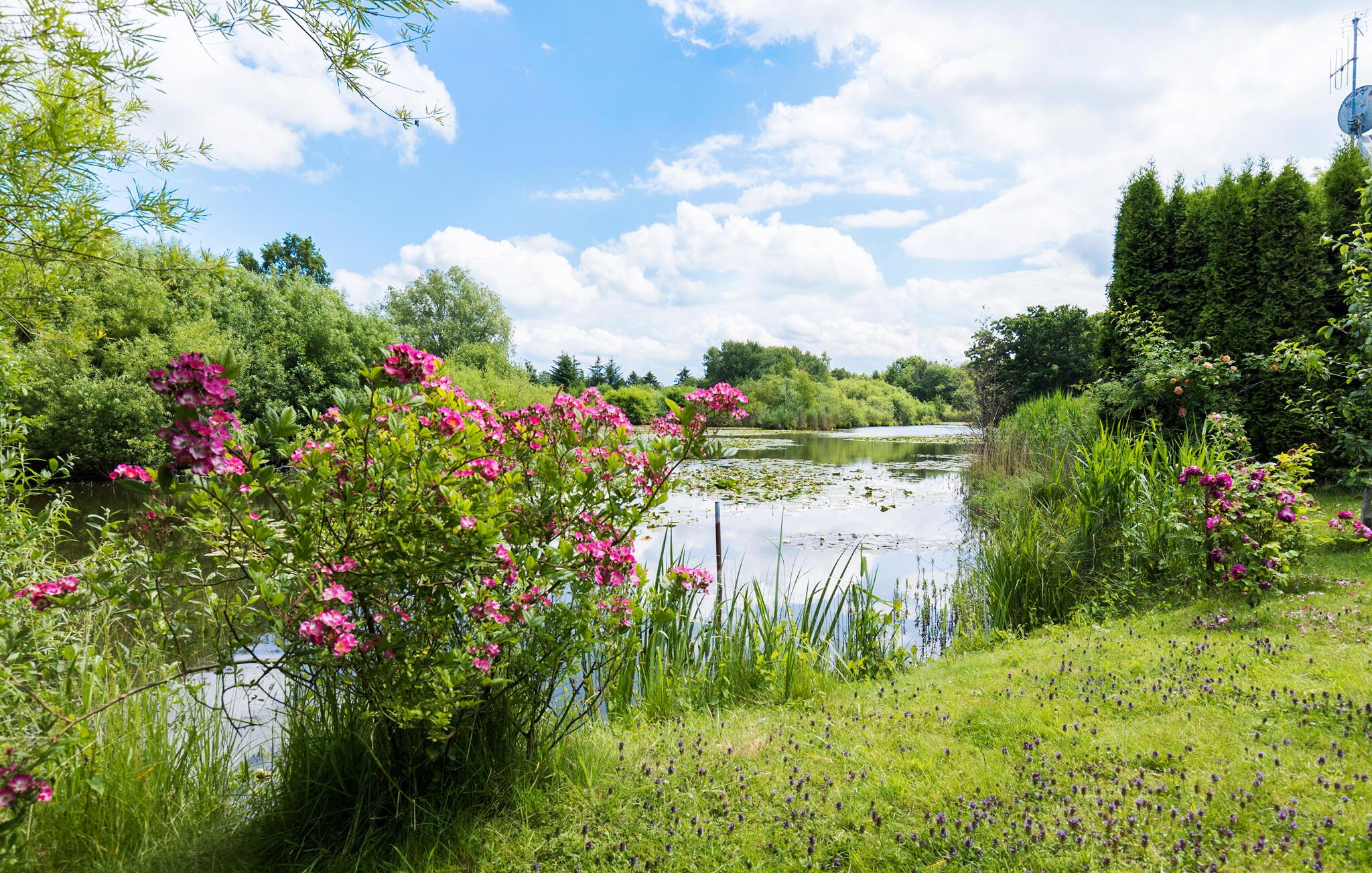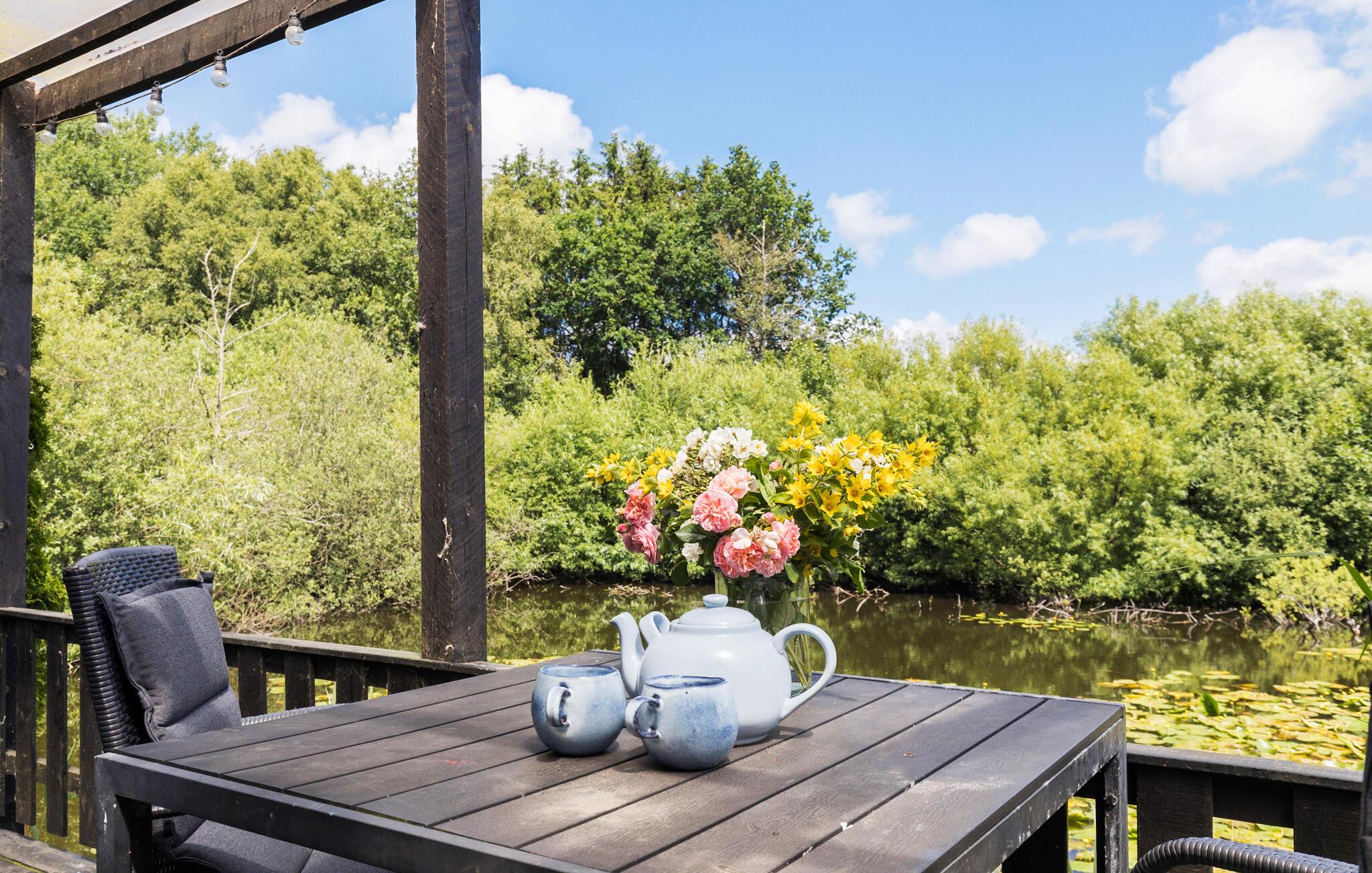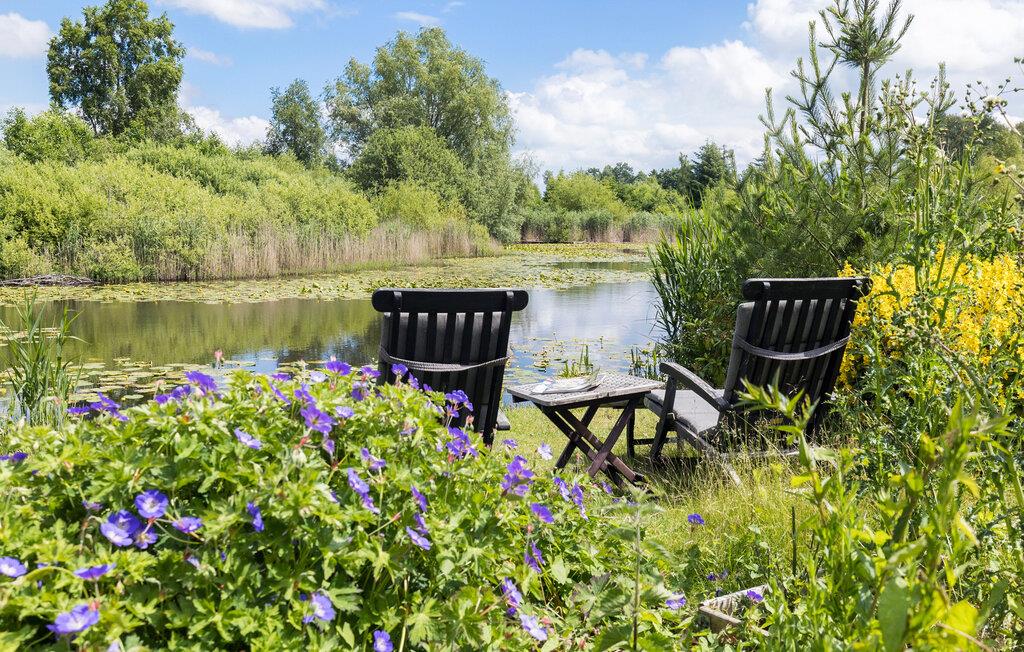 På de lune sommerdage kan I dække op til en dejlig grillmiddag på verandaen. Lad blikket vandre over den store have, mens I nyder den friske luft og den særlige ro. Der er god plads i haven til, at de små gæster kan løbe og lege. Noget helt igennem idyllisk ved dette hus er den lille sø lige ved siden af ??grunden. Sæt jer til rette ved vandet med en kop kaffe og nyd den friske luft og den smukke udsigt over vandet.