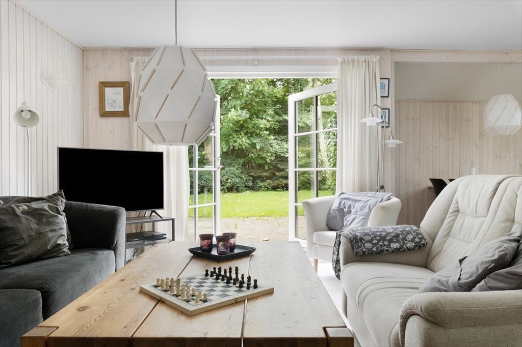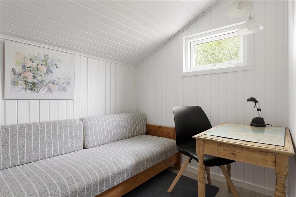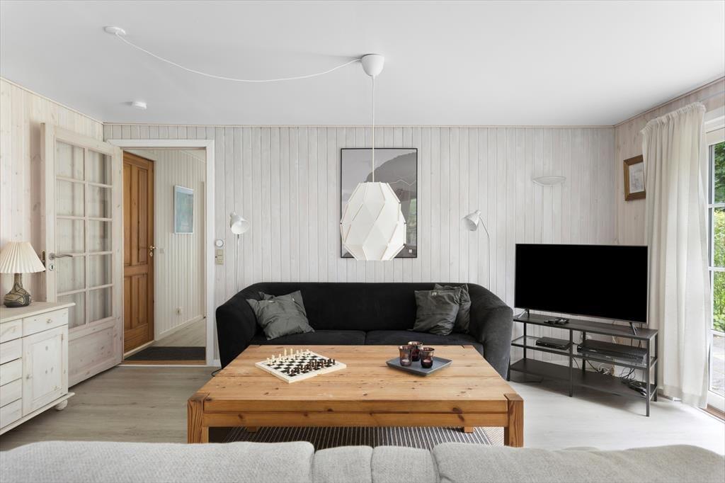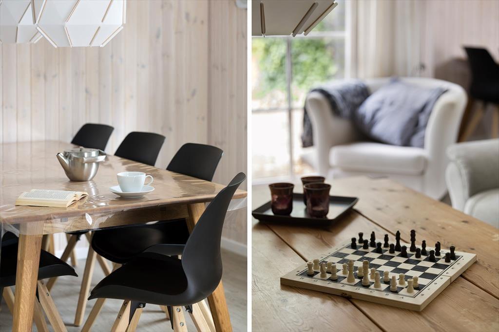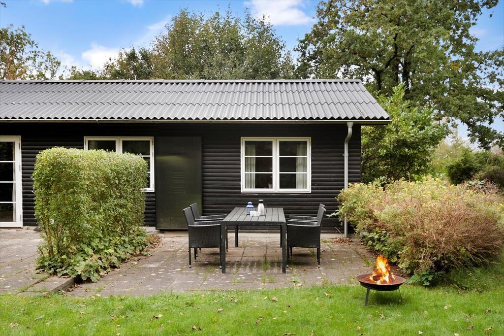 Det sortmalede træsommerhus rummer en lys og indbydende opholdsstue, der har brændeovn til de køligere tidspunkter af året, hvor det stadig kan være fristende at tage en time-out fra hverdagen i hyggelige rammer. Spisepladsen er et hyggeligt samlingspunkt, ikke kun for måltider, men også for brætspil og timelange hyggesnakke – og køkkenet er placeret lige ved siden af, så det er nemt at smutte hen for at hente desserten fra fryseren eller sætte kaffe over. Der er to store soveværelser og et mindre rum at overnatte i, og husets hems vil børnene sikkert blive begejstrede for. Alt i alt en planløsning, der passer glimrende til seks personer.