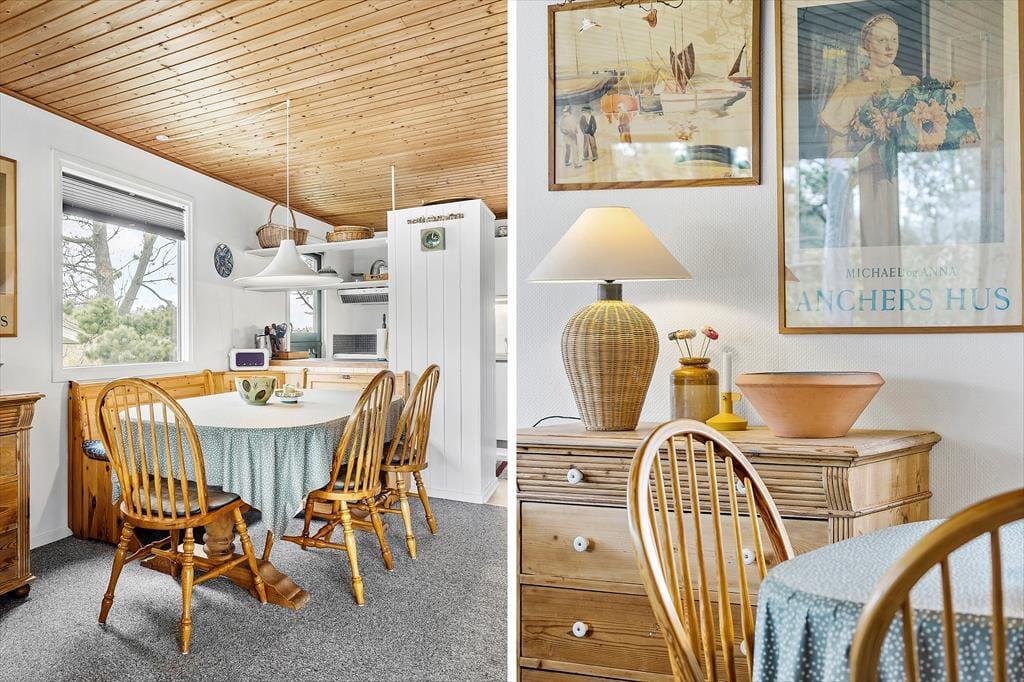 Træd indenfor i dette skønne sommerhus, hvor den ældre stil går hånd i hånd med en tidløs hygge. Allerede i entréen mærker du den varme stemning, som især forstærkes af den charmerende brændeovn, der spreder en blid og indbydende varme. Det er et sted, hvor du kan drømme dig væk fra hverdagens travlhed og i stedet nyde de små, men betydningsfulde øjeblikke, mens ilden knitrer i baggrunden. De bløde, nostalgiske materialer og den gennemarbejdede indretning skaber en følelse af ro og hjemlig tryghed, der indbyder til lange, afslappede aftener i godt selskab. Her bliver du mødt af en indretning, der emmer af historie og charme – et perfekt fristed, hvor både krop og sjæl får lov at slappe helt af.