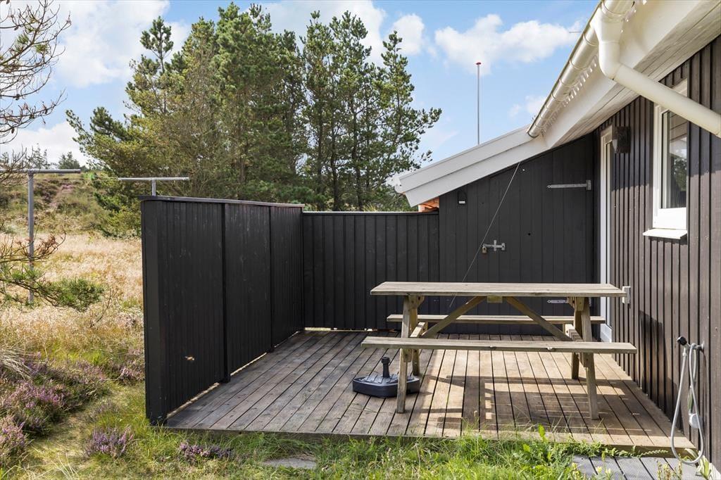 Den sydvestvendte terrasse er et skønt sted at opleve naturen på nært hold. Med udsigt til det grønne omkringliggende landskab kan du starte dagen med morgenkaffe i solen eller slutte af med en grillmiddag, mens fuglene synger omkring dig. Børnene kan lege i de naturlige omgivelser, mens de voksne nyder roen og den friske luft, der kendetegner området. Den fredelige atmosfære gør udendørsområdet til et ideelt sted for afslapning og nærvær.