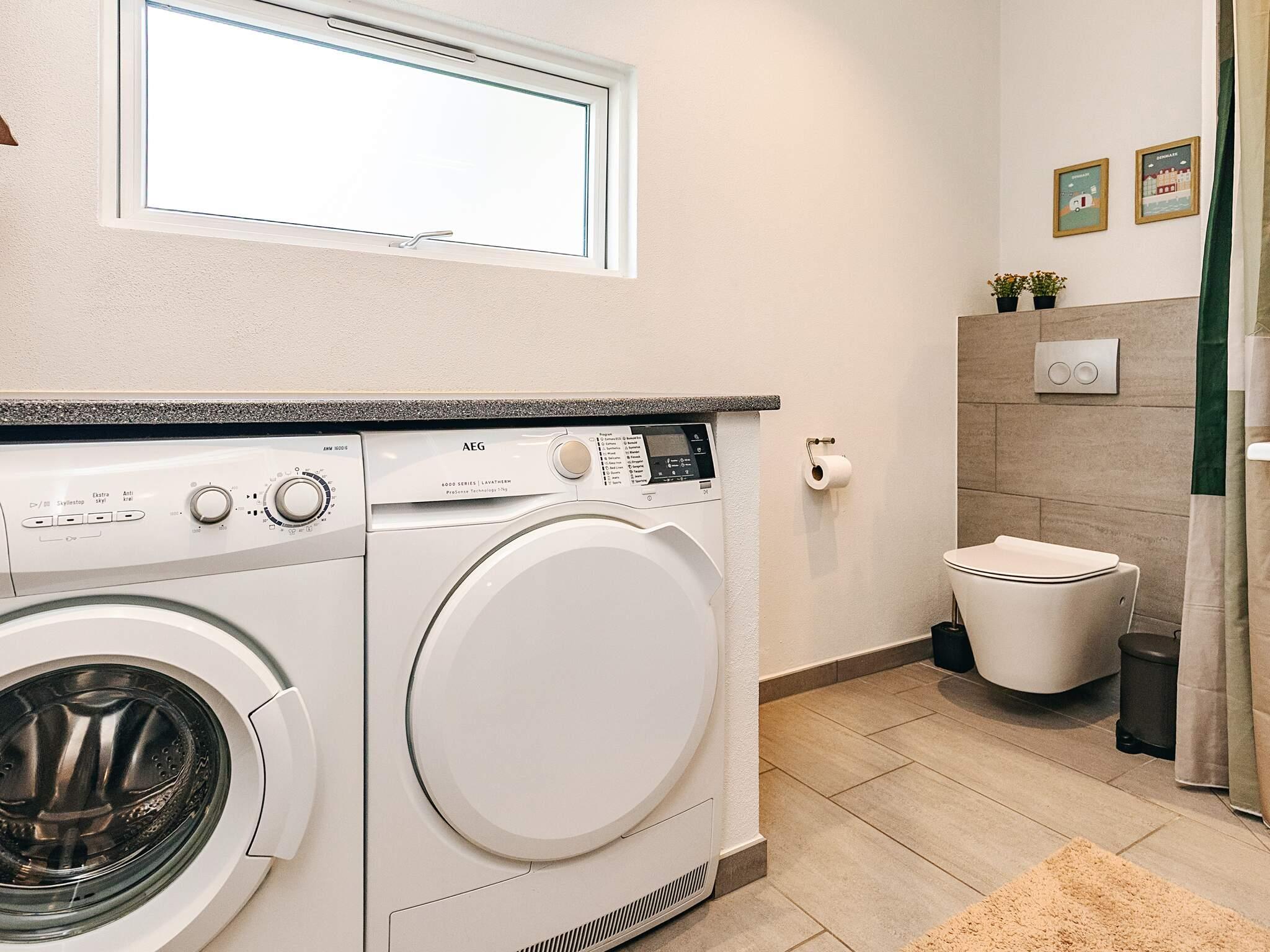 Bad/wc: Vaskemask., tørretumbler, wc, håndvask, bruser