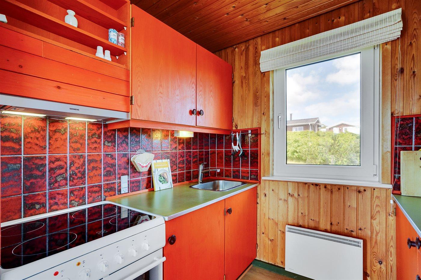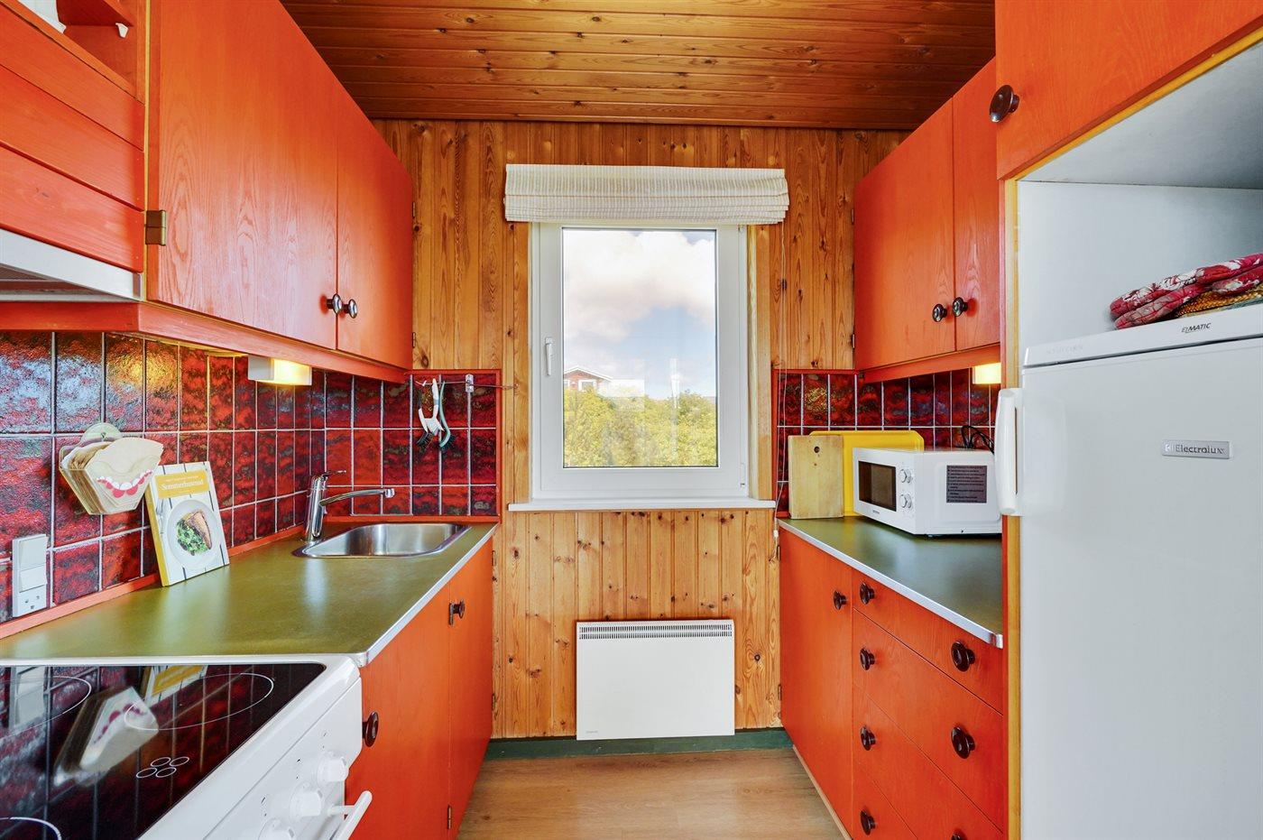 Køkkenet er udstyret med 1 køleskab. Der er 4 keramiske kogeplader, varmluftovn, mikrobølgeovn.