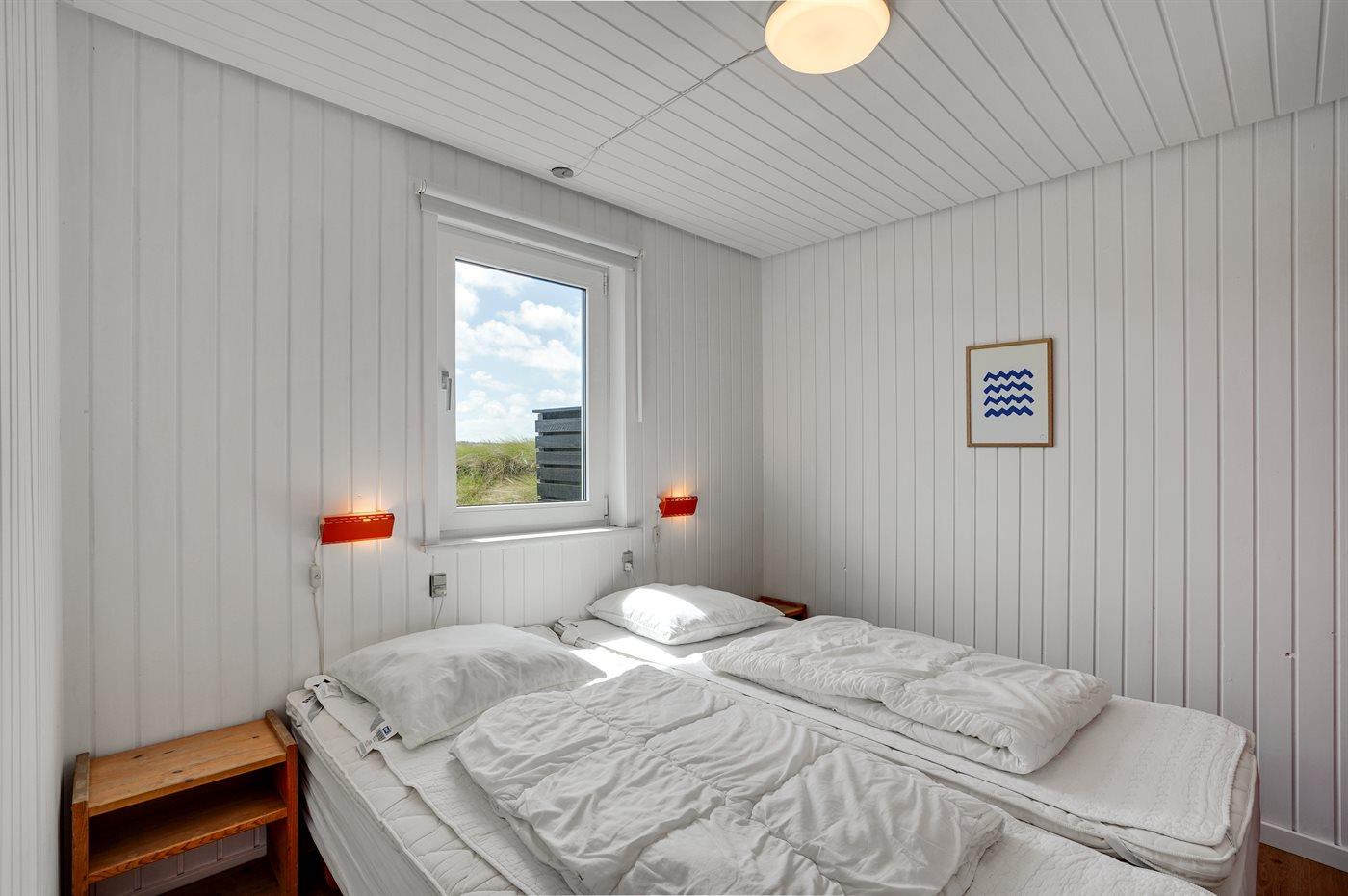 Der er i alt 2 soveværelser. Sovepladserne fordeler sig på: 2 sovepladser i dobbeltseng. 3 sovepladser i køjesenge. Der er tale om en norsk køjeseng (140 x 200 cm forneden og 90/200 foroven). Den øverste køjeplads er derfor bedst egnet til større børn.