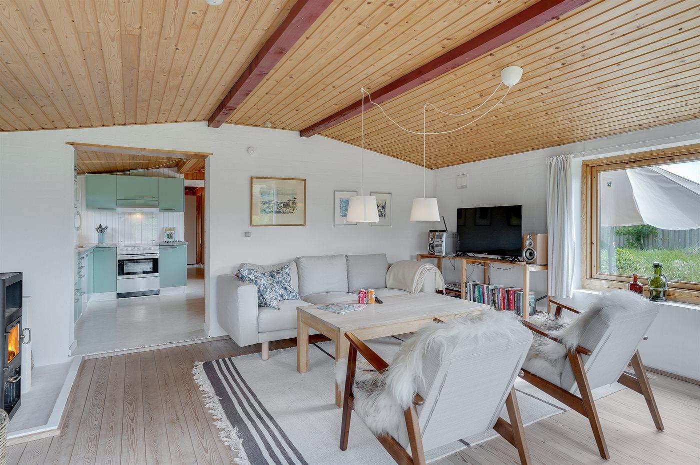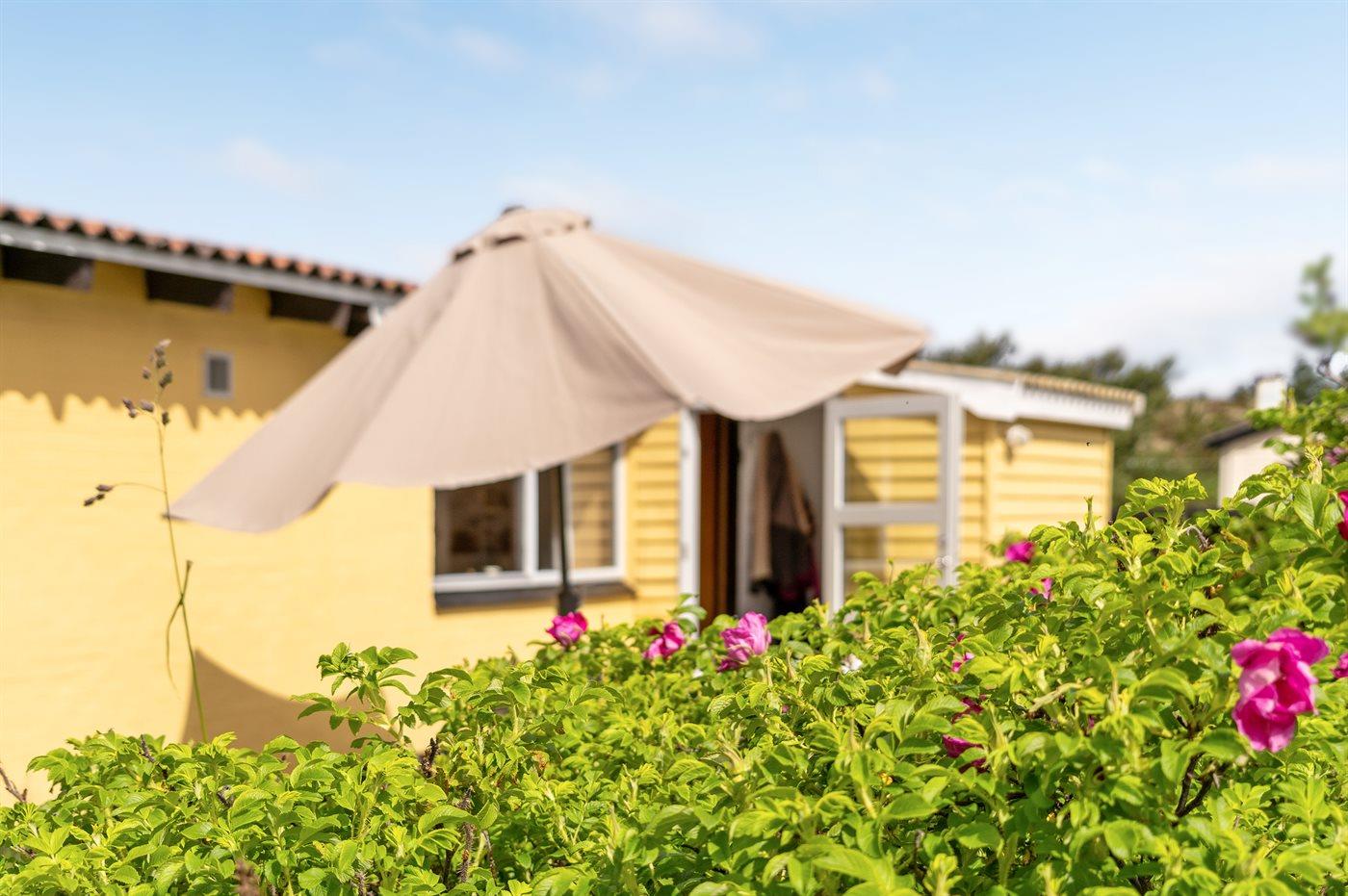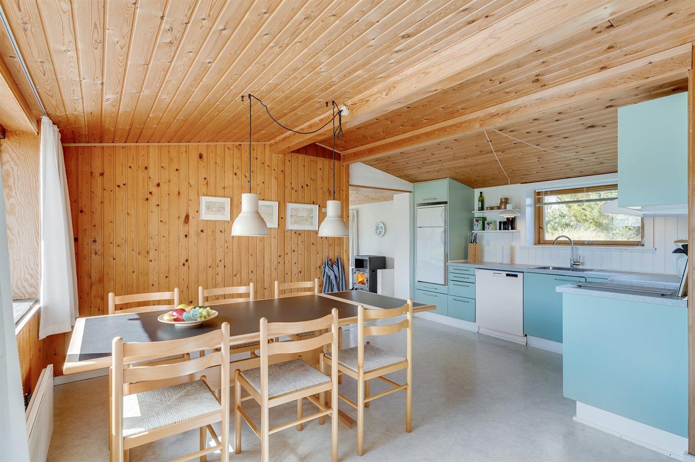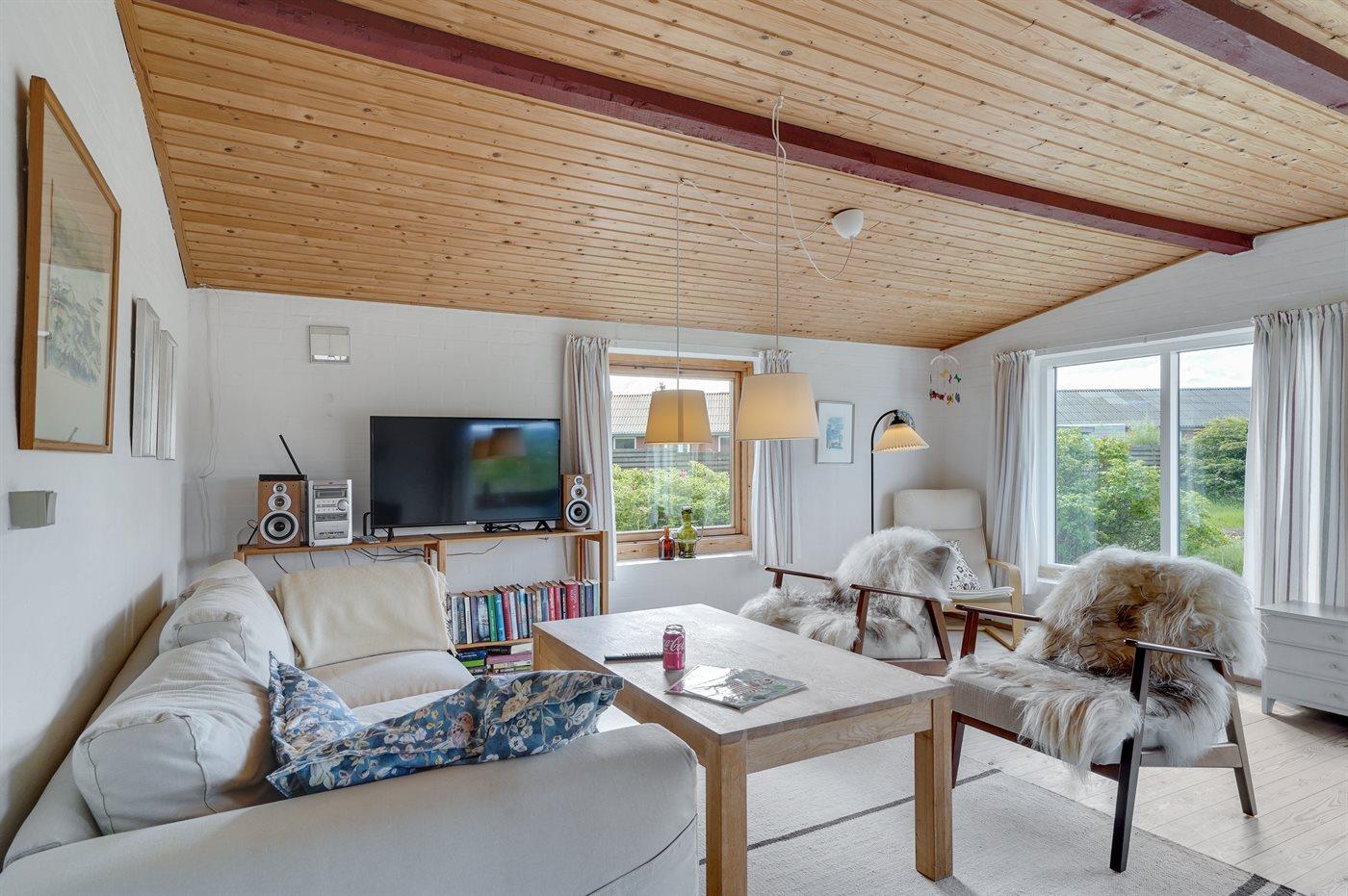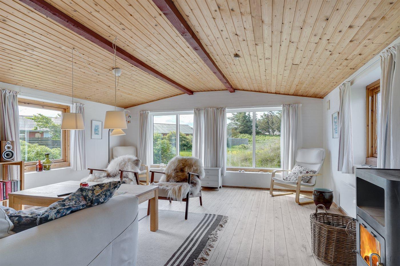 Godt beliggende sommerhus i sten, bygget i 1965 og renoveret i 1992. Huset ligger i et dejligt veludbygget sommerhusområde, i gåafstand til såvel byens forretninger som til det brusende Vesterhav. Til huset hører åben terrasse med havemøbler. Dels trægulve og dels linoleumsgulve samt trælofter og dels trævægge og dels vandskurede vægge. Pænt badeværelse med bruser og gulvvarme. Stort køkken/alrum, der er udstyret med bl.a. opvaskemaskine og fryser. Opholdsstue, der er indrettet med brændeovn, TV og stereoanlæg. Vaskemaskine til rådighed. Husets sovepladser fordeler sig på 3 soverum: 1 med dobbeltseng, 1 med 2 enkeltsenge og 1 med 1 enkeltseng. Et pænt sommerhus for familien, der ønsker en rolig ferie i et attraktivt område med gode aktivitetsmuligheder, bl.a. badning, fiskeri og windsurfing.
