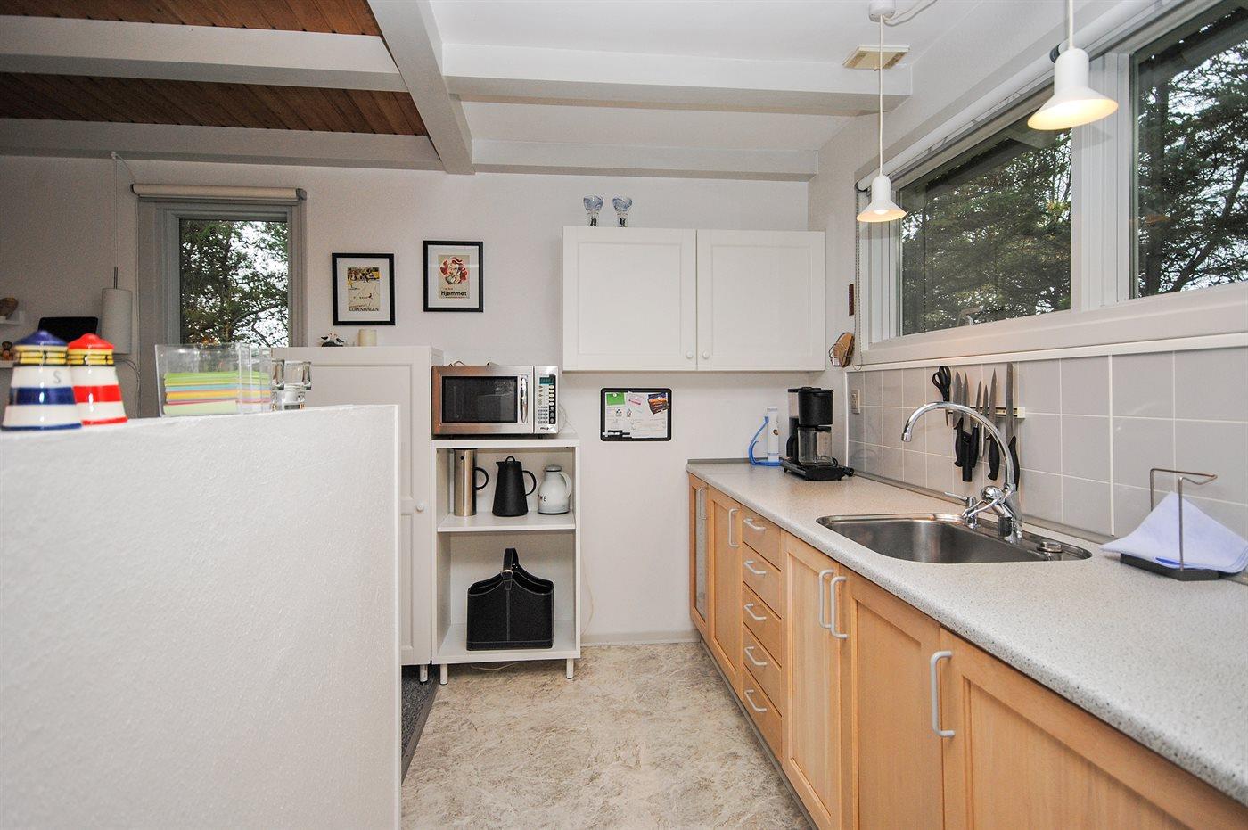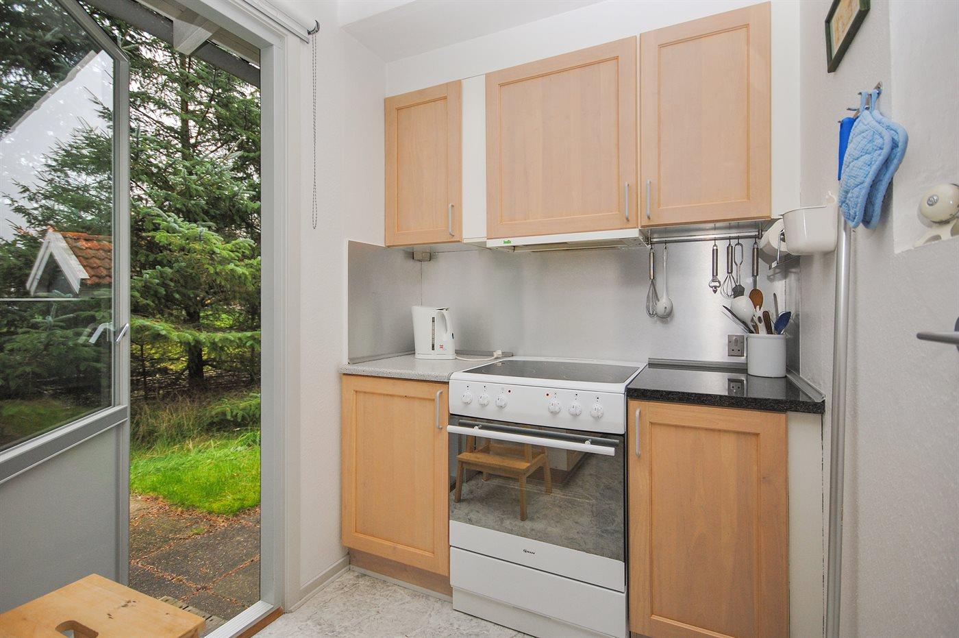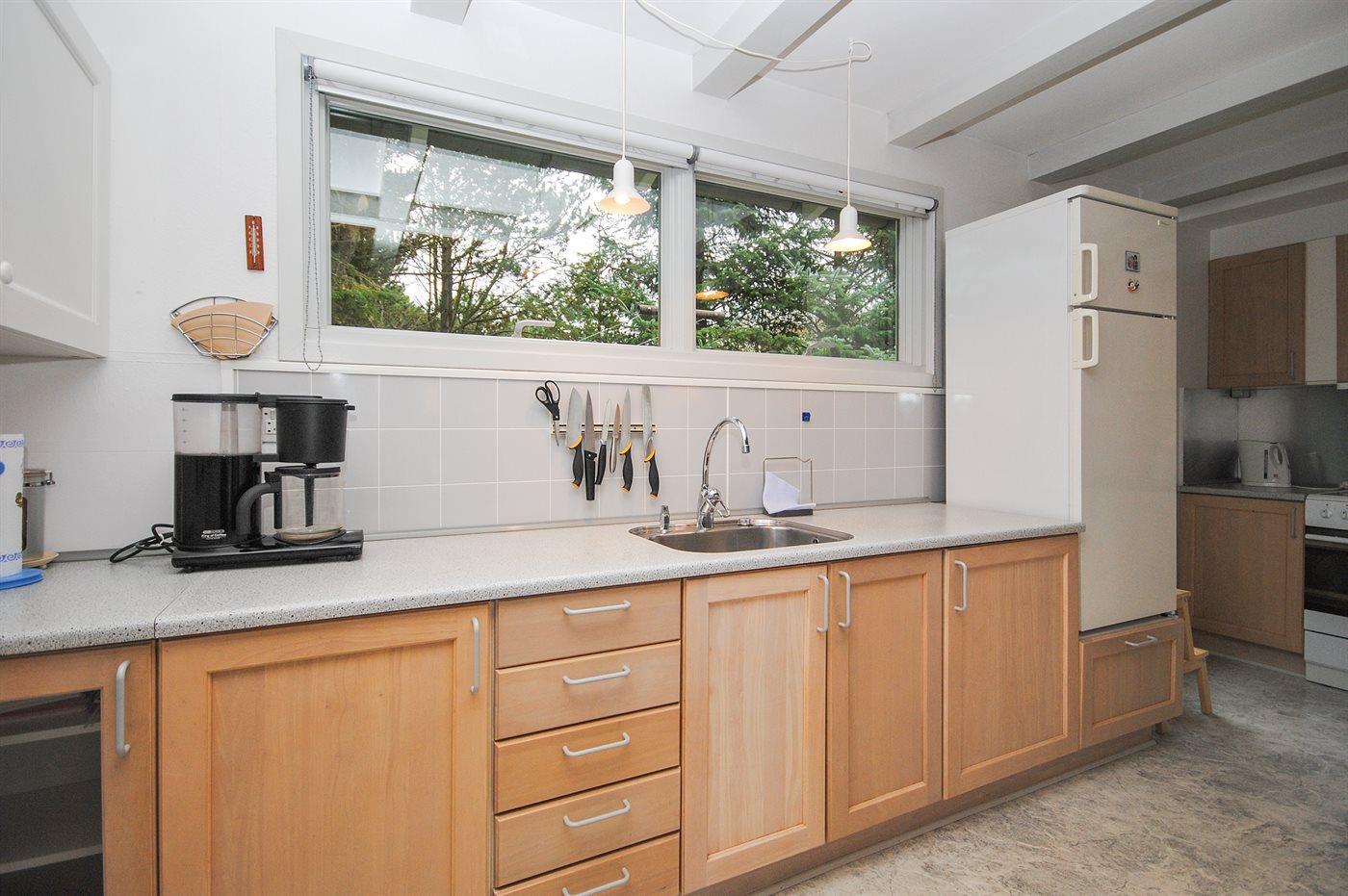 Køkkenet er udstyret med 1 køleskab. Der er 4 keramiske kogeplader, bageovn, mikrobølgeovn samt opvaskemaskine.