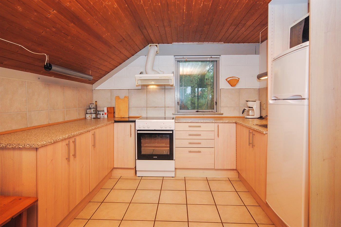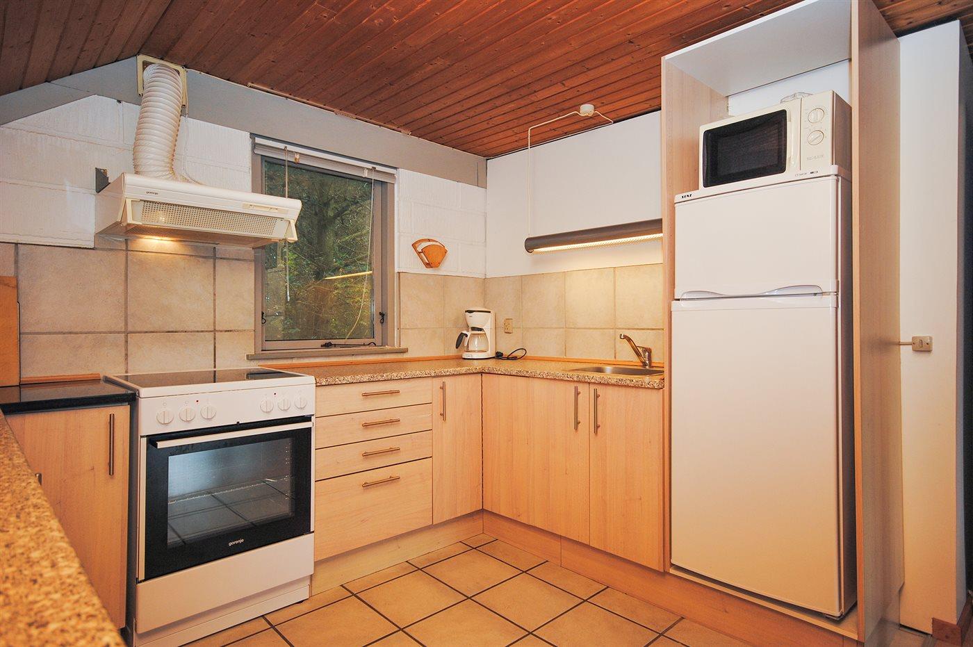 Køkkenet er udstyret med 1 køleskab. Der er 4 keramiske kogeplader, varmluftovn, mikrobølgeovn.