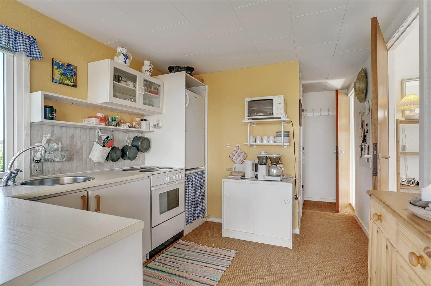 Køkkenet er udstyret med 1 køleskab. Der er 4 elkogeplader, bageovn, mikrobølgeovn.