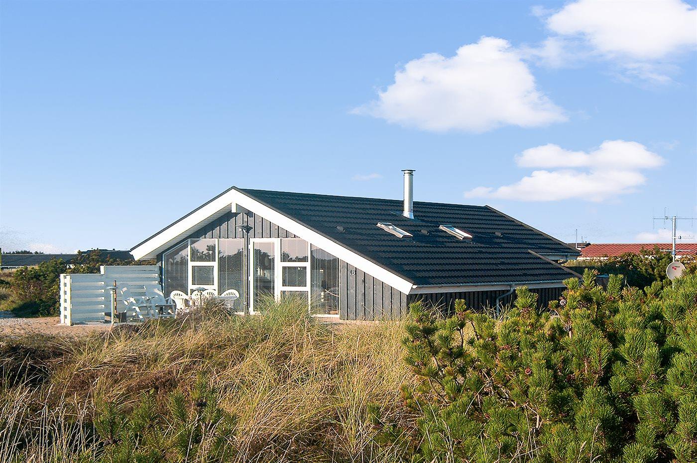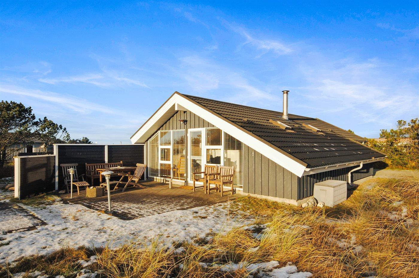 Særdeles hyggeligt træhus med tegltag. Fra huset er der dejlig udsigt ud over landskabet mod Nystrup Klitplantage.