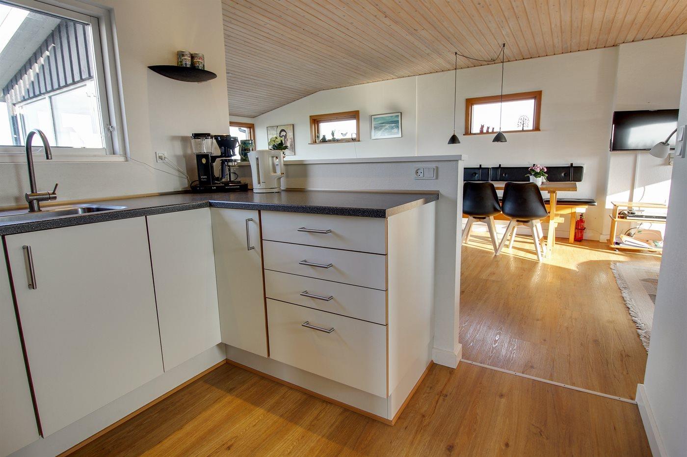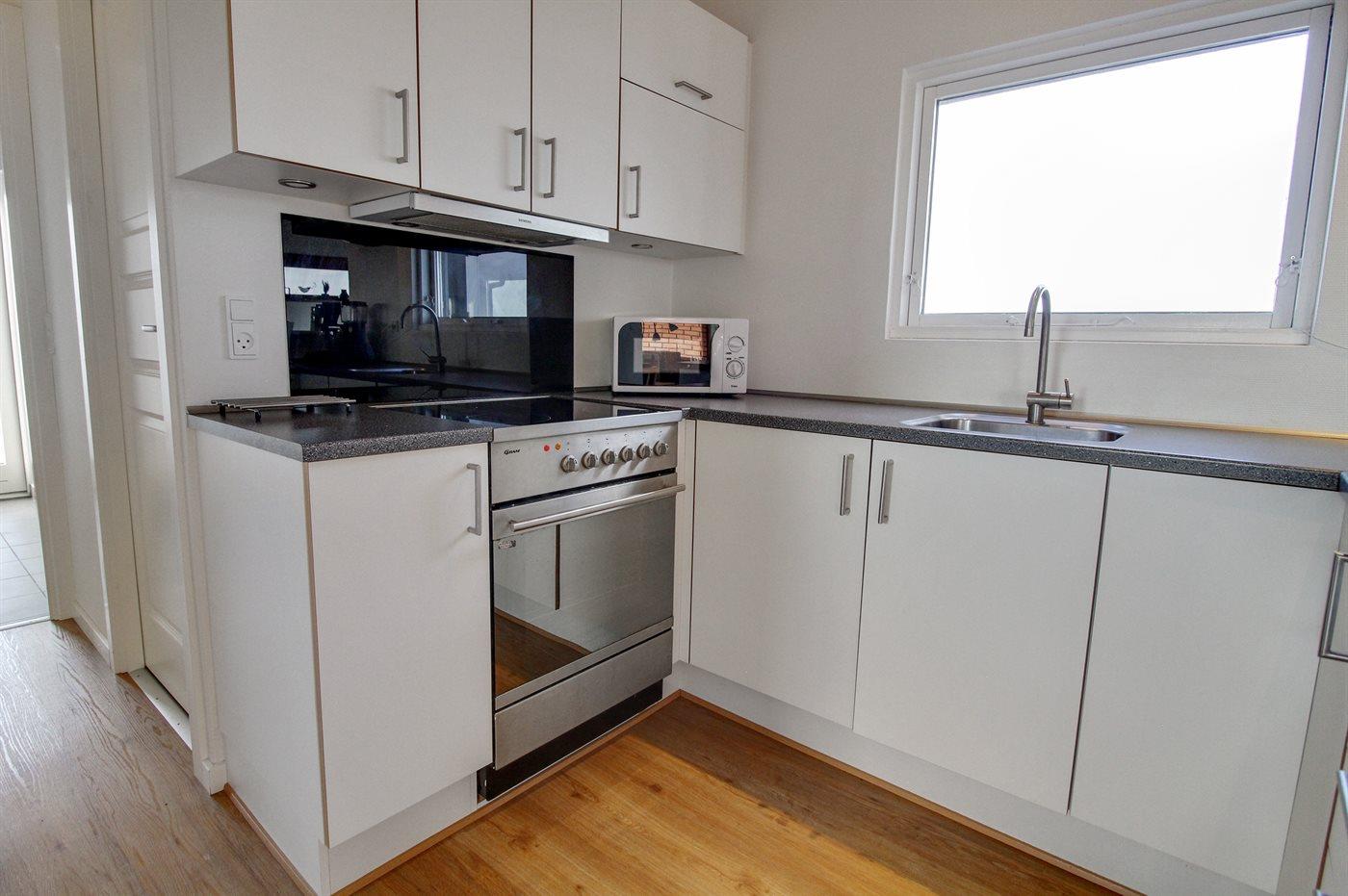 Køkkenet er udstyret med 1 køleskab. Der er 4 induktionskogeplader, varmluftovn, mikrobølgeovn samt opvaskemaskine.