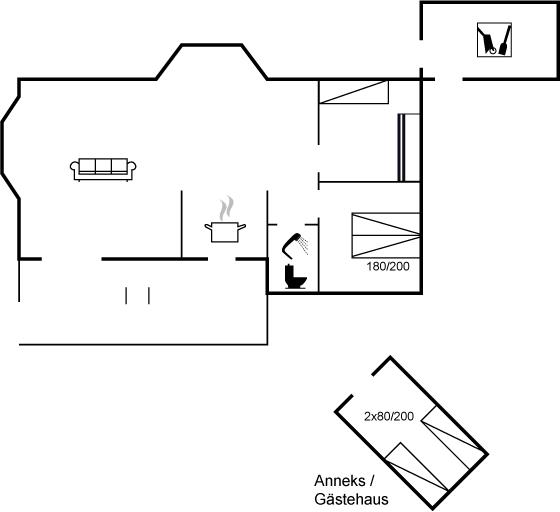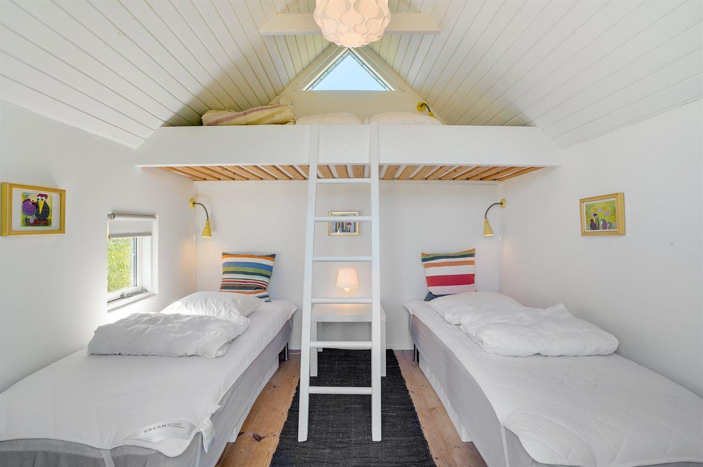 1 enkeltseng og køjeseng. Hertil kommer et anneks på 9 m2 med 2 enkeltsenge/dobbeltseng + hems.