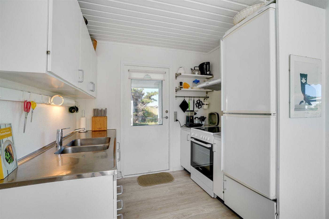 Der er brændeovn i stuen. Køkkenet er udstyret med 1 køleskab, fryser med en kapacitet