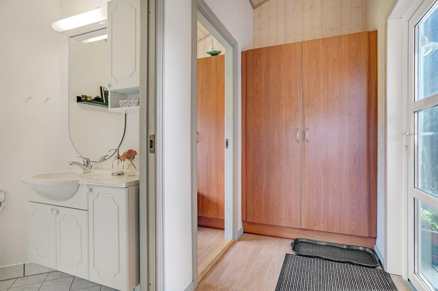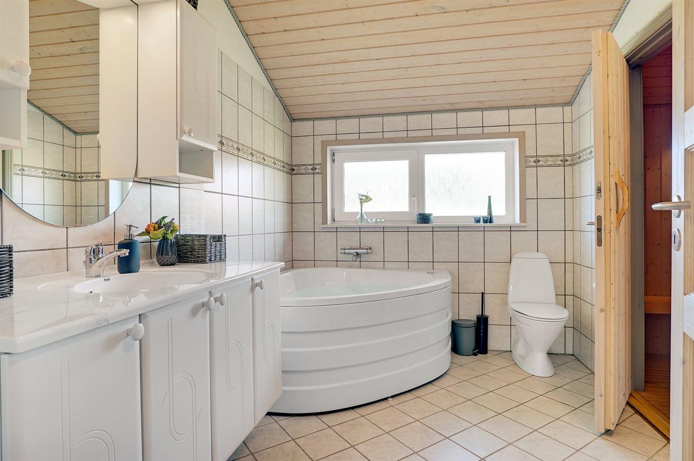Der er 1 badeværelse med bruseniche og 1 toilet., heraf 1 gæstetoilet. Der er gulvvarme på 1 badeværelse. I saunaen er der mulighed for afslapning.