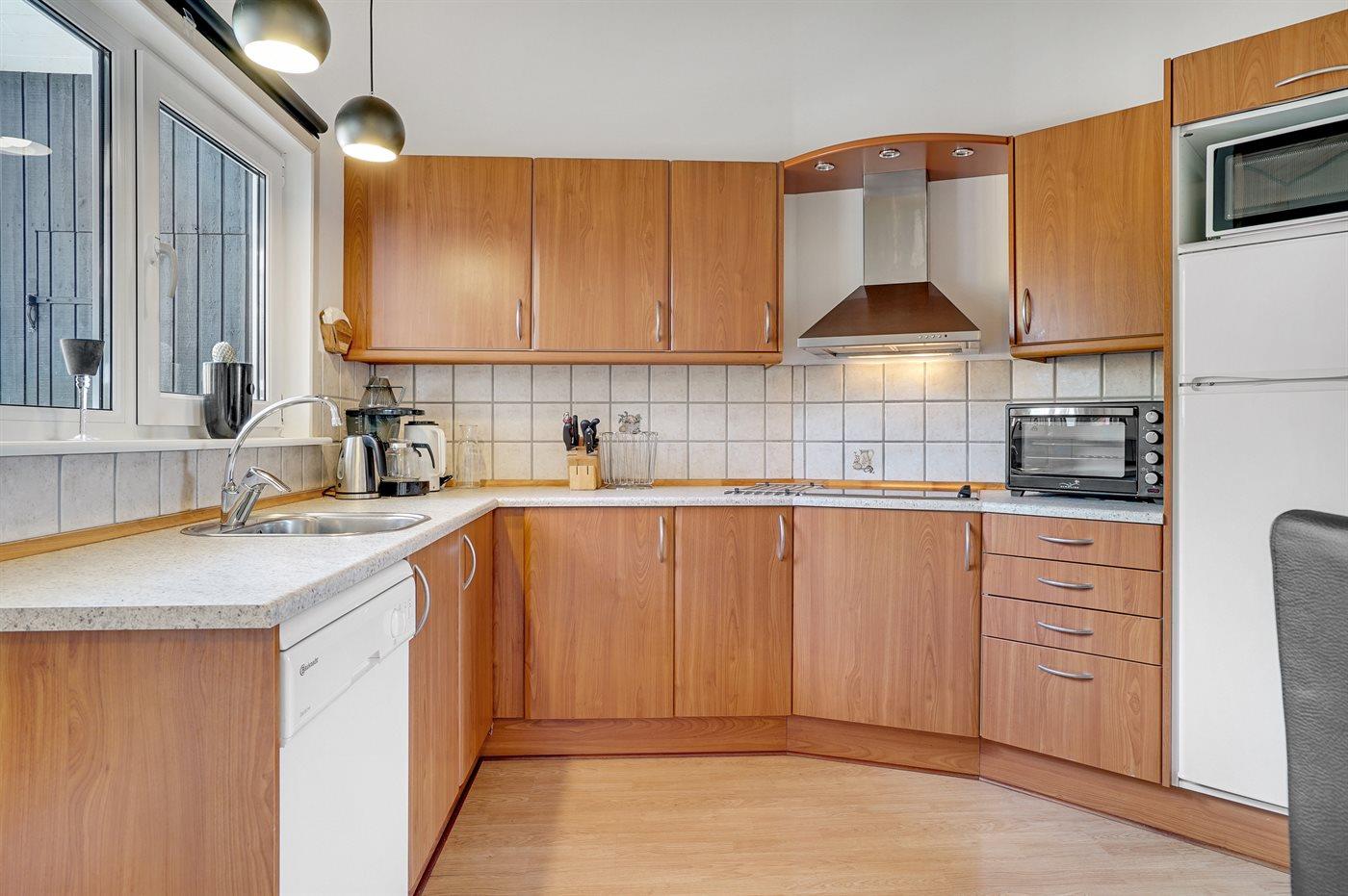 Køkkenet er udstyret med 1 køleskab. Der er 4 keramiske kogeplader, miniovn, mikrobølgeovn samt opvaskemaskine.
