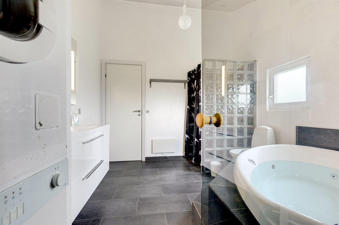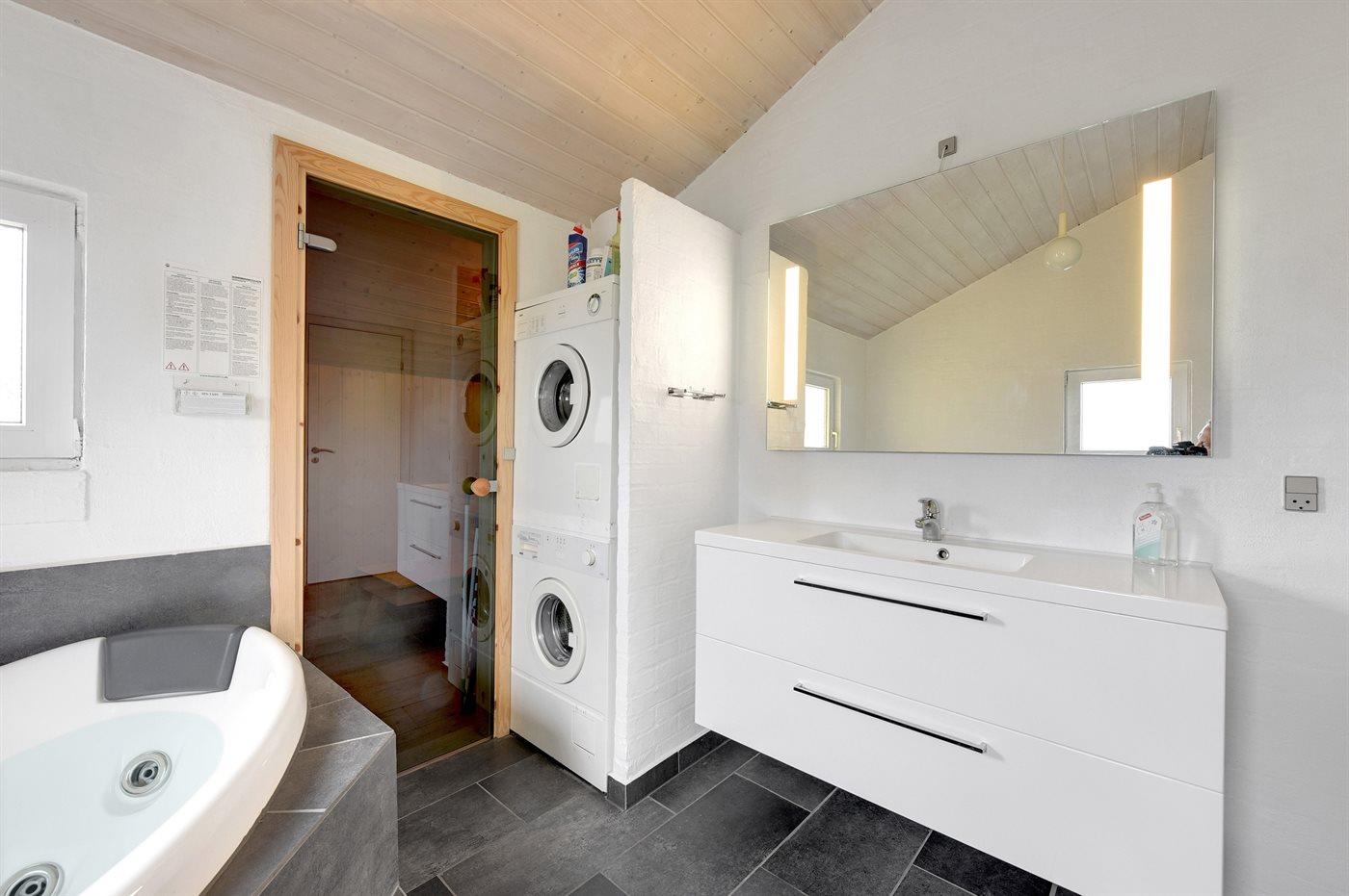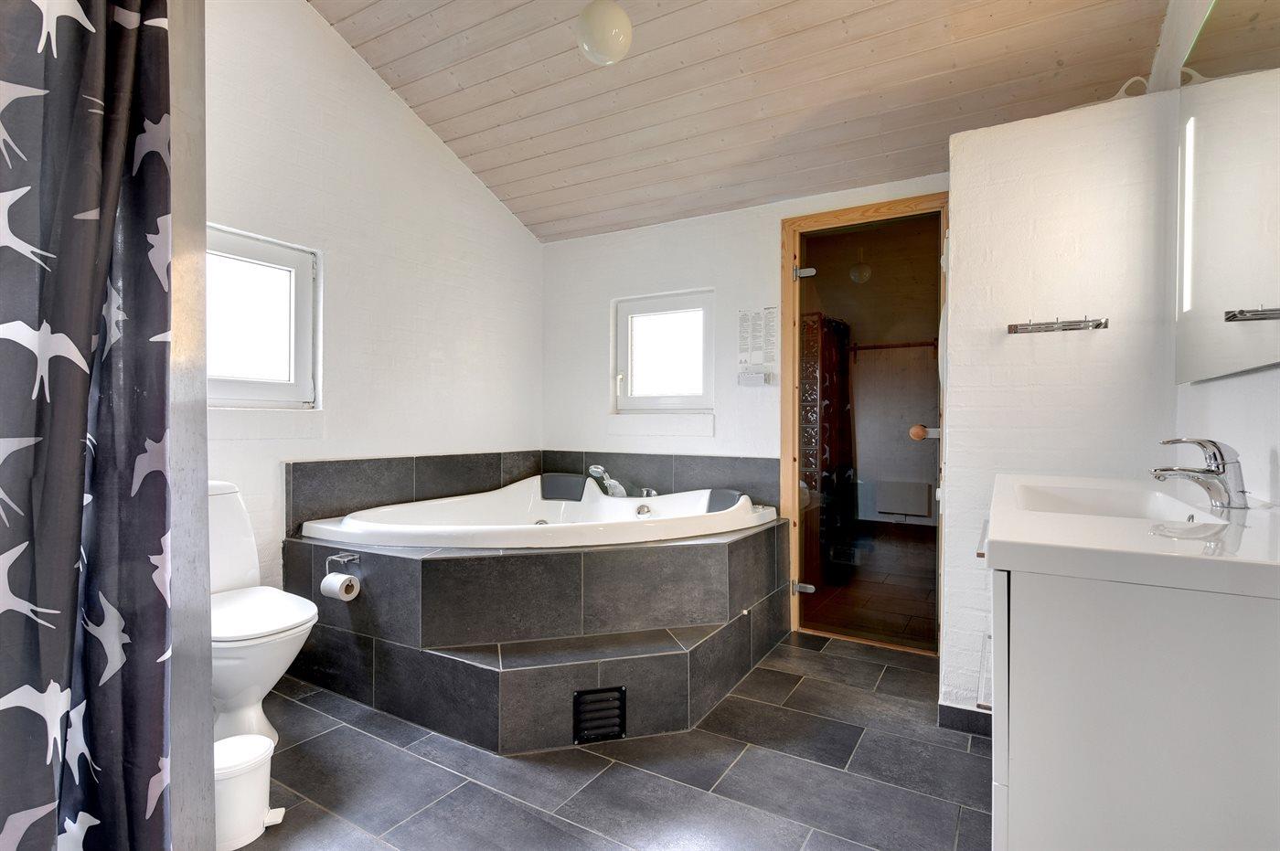 Der er 1 badeværelse med bruseniche og 2 toiletter, heraf 1 gæstetoilet. Der er gulvvarme på 1 badeværelse. I saunaen er der mulighed for afslapning.