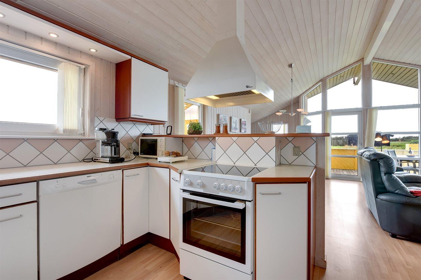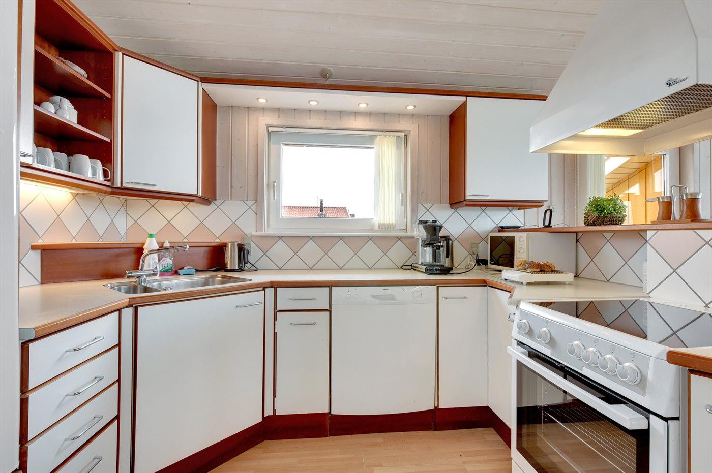 Køkkenet er udstyret med 1 køleskab. Der er 4 keramiske kogeplader, varmluftovn, mikrobølgeovn samt opvaskemaskine.