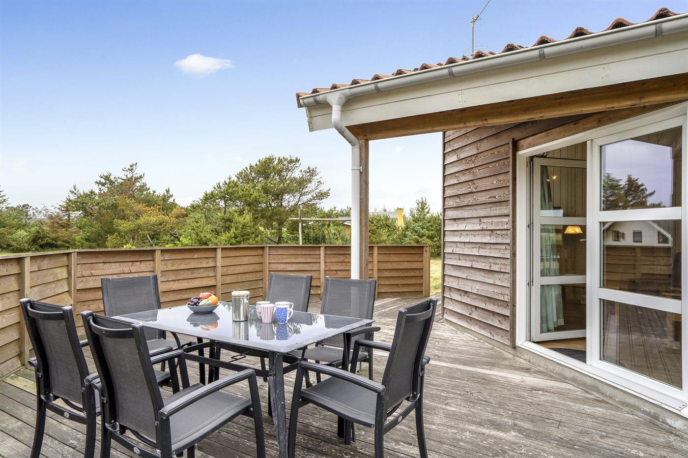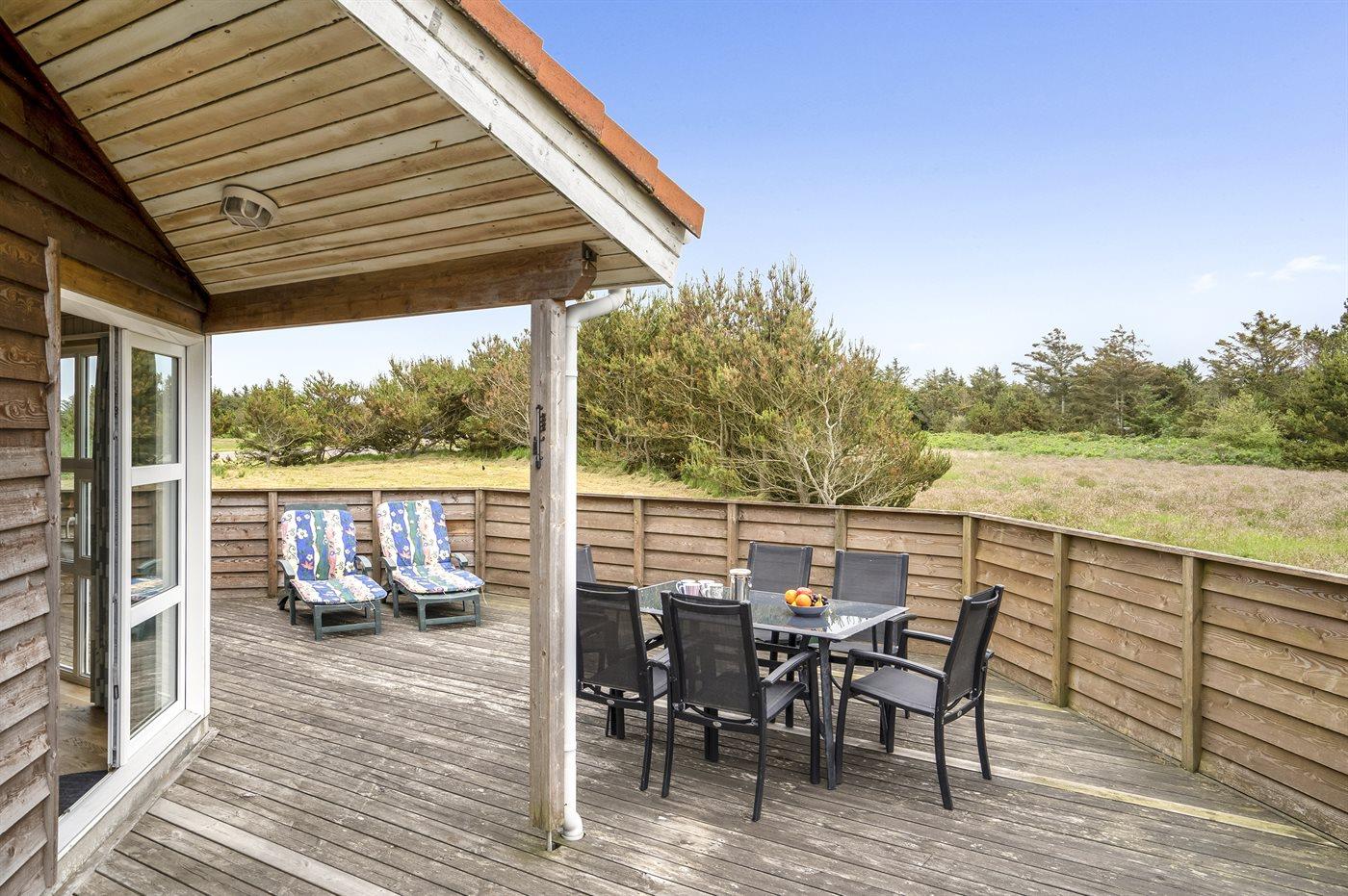 Ferieboligen er beliggende på en 1935 m² stor naturgrund. Der er 500 m til havet. Nærmeste forretning er beliggende i en afstand af 500 m. Til ferieboligen hører 60 m² terrasseareal. Desuden er der 12 m² overdækket terrasse. Heraf i alt 40 m² lukket terrasse. Gynge. Sandkasse. Grill til rådighed. Parkering ved ferieboligen.
