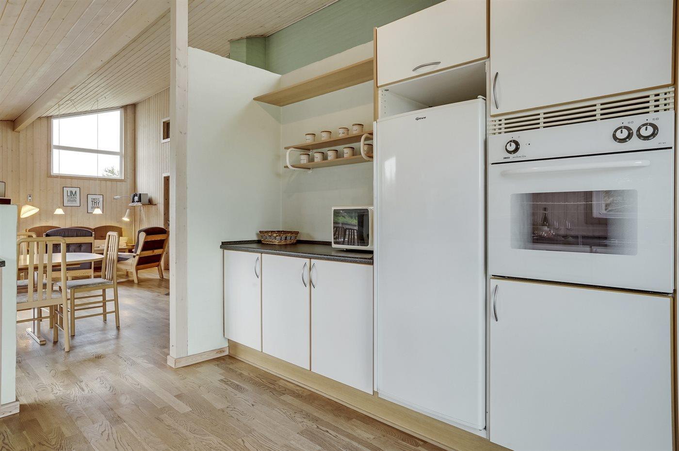 Køkkenet er udstyret med 1 køleskab. Der er 4 keramiske kogeplader, varmluftovn, mikrobølgeovn samt opvaskemaskine.