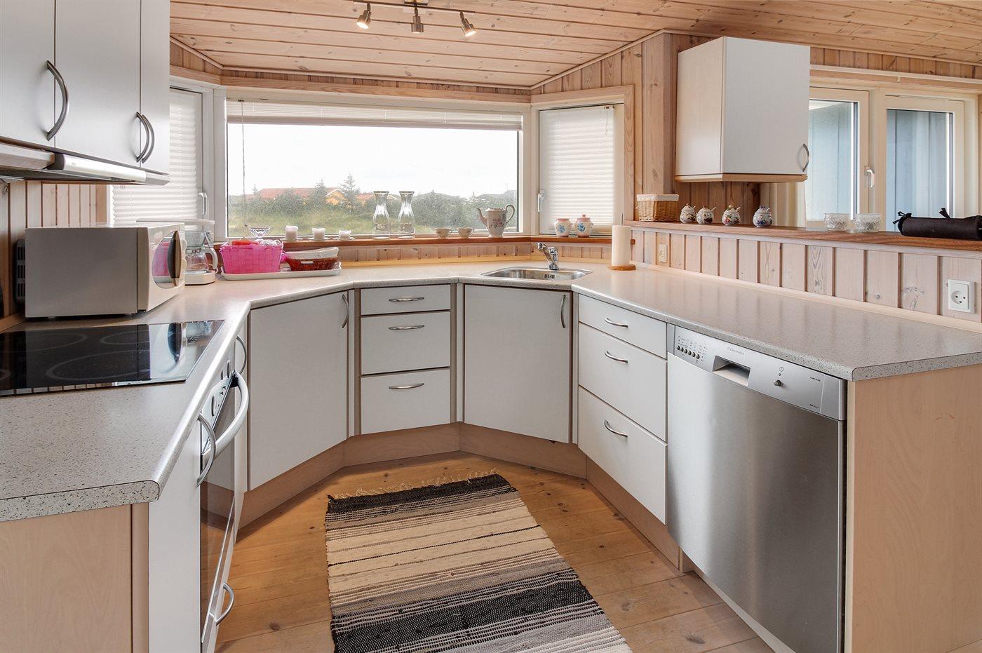Køkkenet er udstyret med 1 køleskab. Der er 4 keramiske kogeplader, varmluftovn, mikrobølgeovn samt opvaskemaskine.