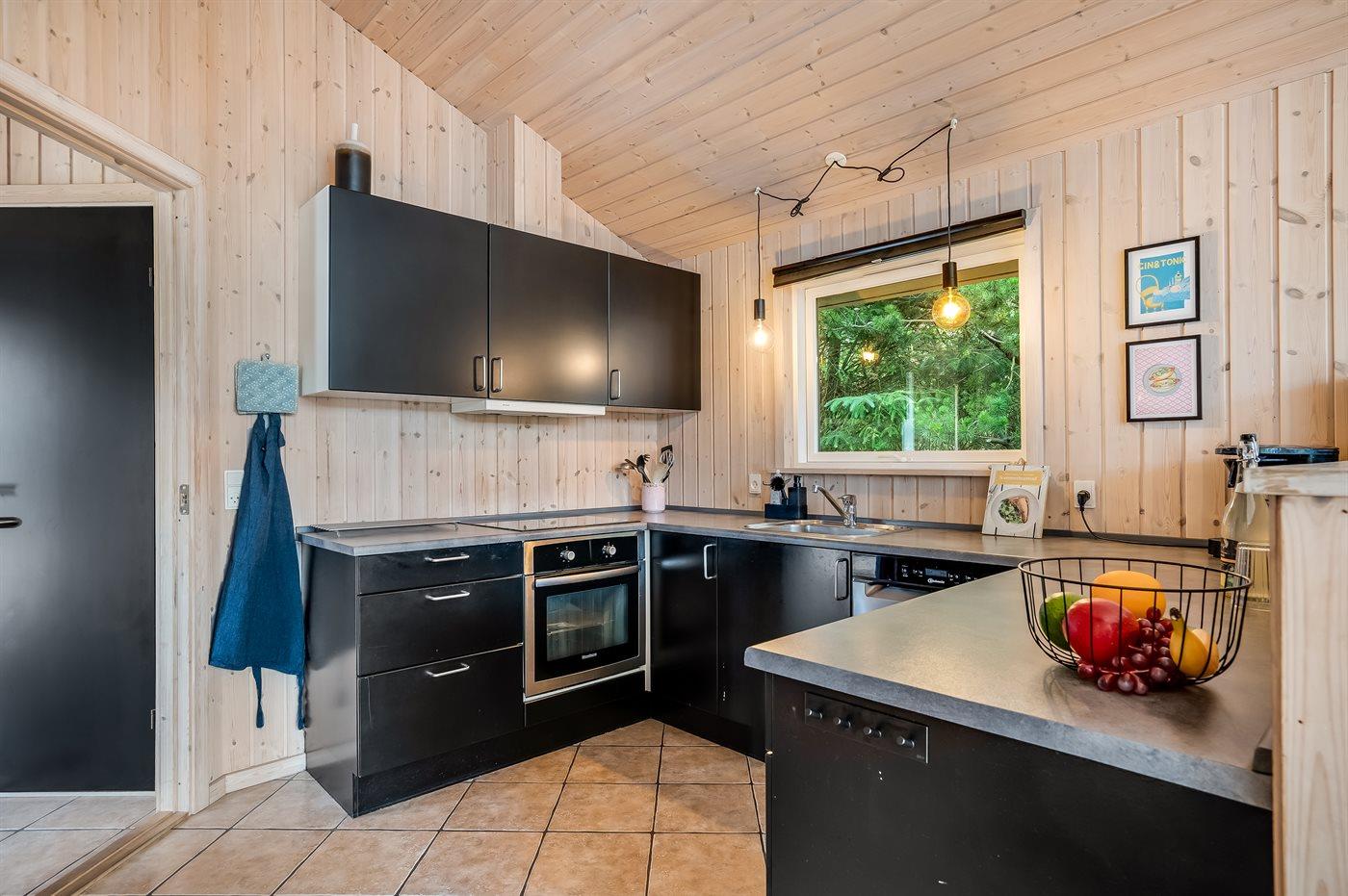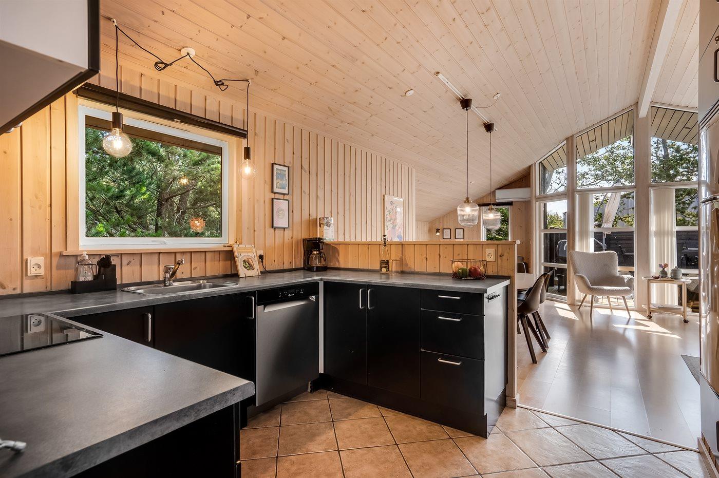 Køkkenet er udstyret med 1 køleskab. Der er 4 keramiske kogeplader, varmluftovn samt opvaskemaskine.