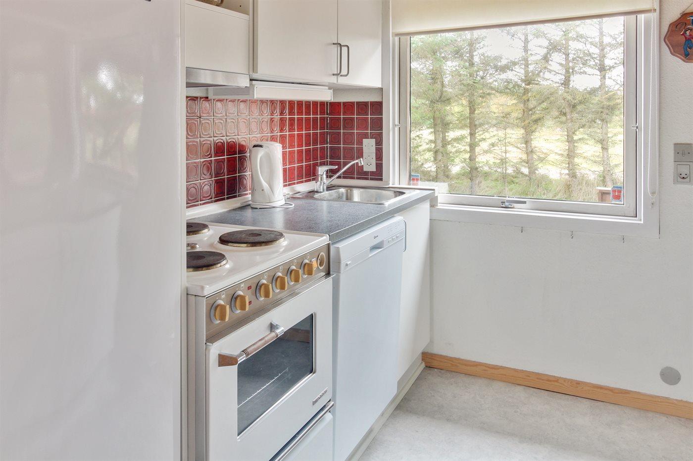 Køkkenet er udstyret med 1 køleskab. Der er 4 elkogeplader, bageovn samt opvaskemaskine.